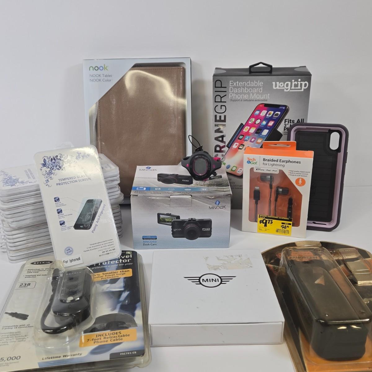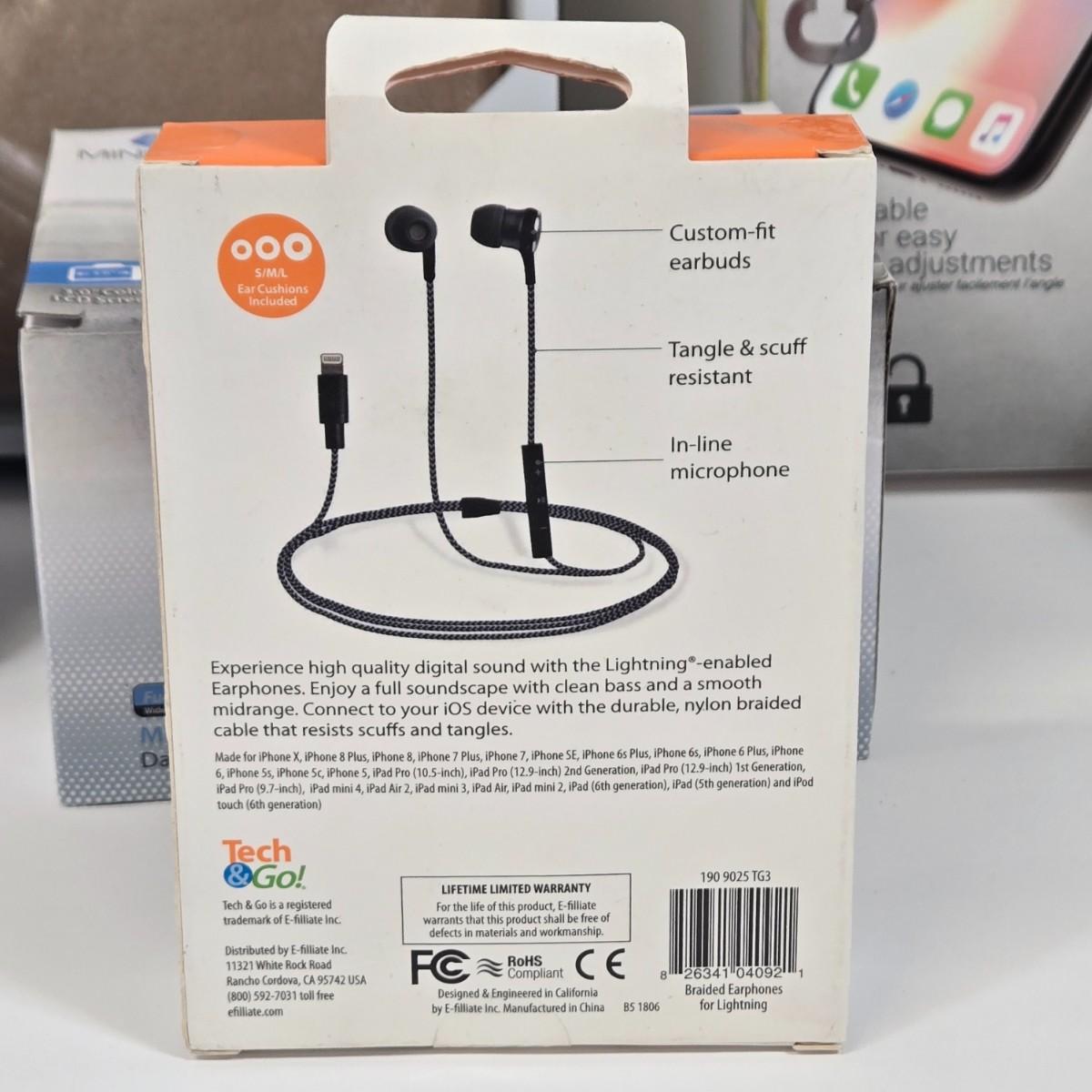 LOT 39: Notebook Travel Surge Protecter, Tech and Go Braided Earphones, Soleus Running Watch, Dashboard Phone Mount, Multiple Screen Protectors, and More
