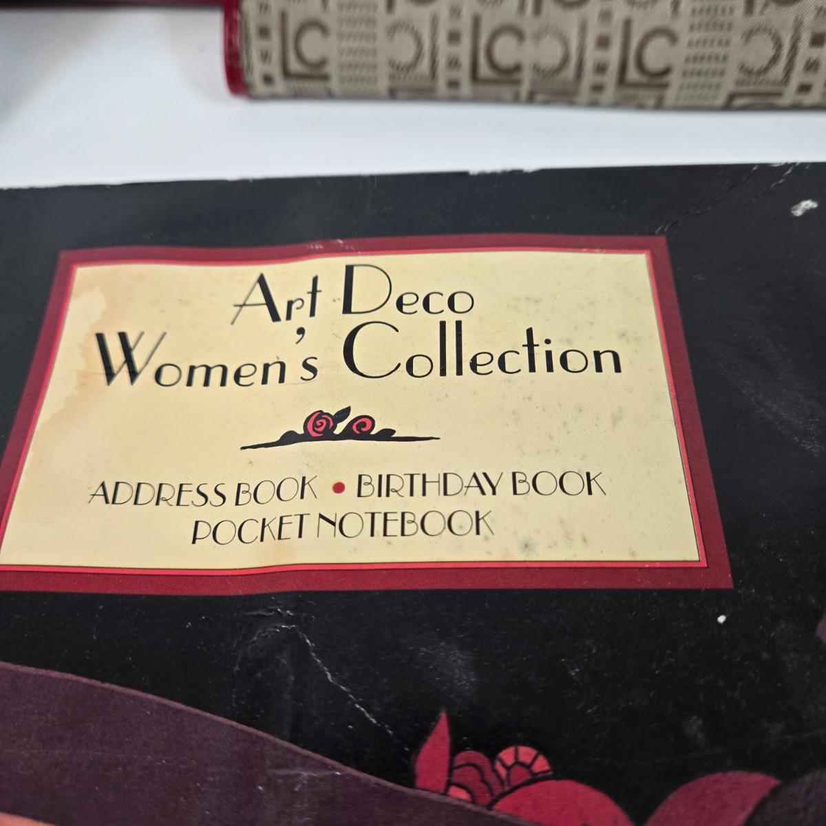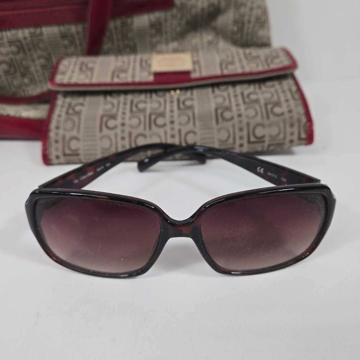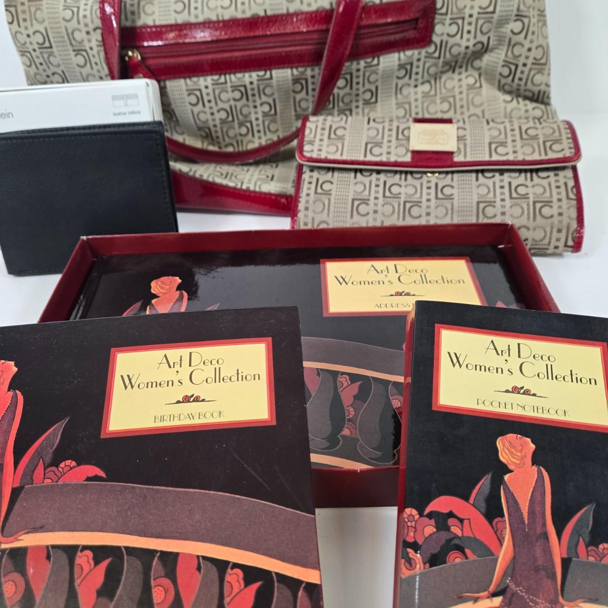 LOT 98: Liz Claiborne Logo Handbag with Matching Wallet, Calvin Klein Leather Wallet, Art Deco Women's Collection Address, Birthday, & Notebook, Calvin Klein Sunglasses, and Gold-tone Bangle Bracelets