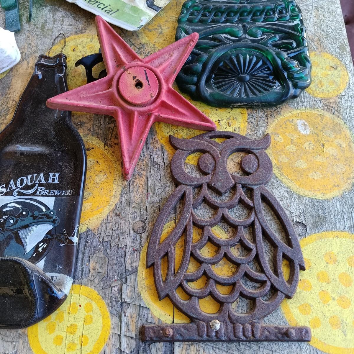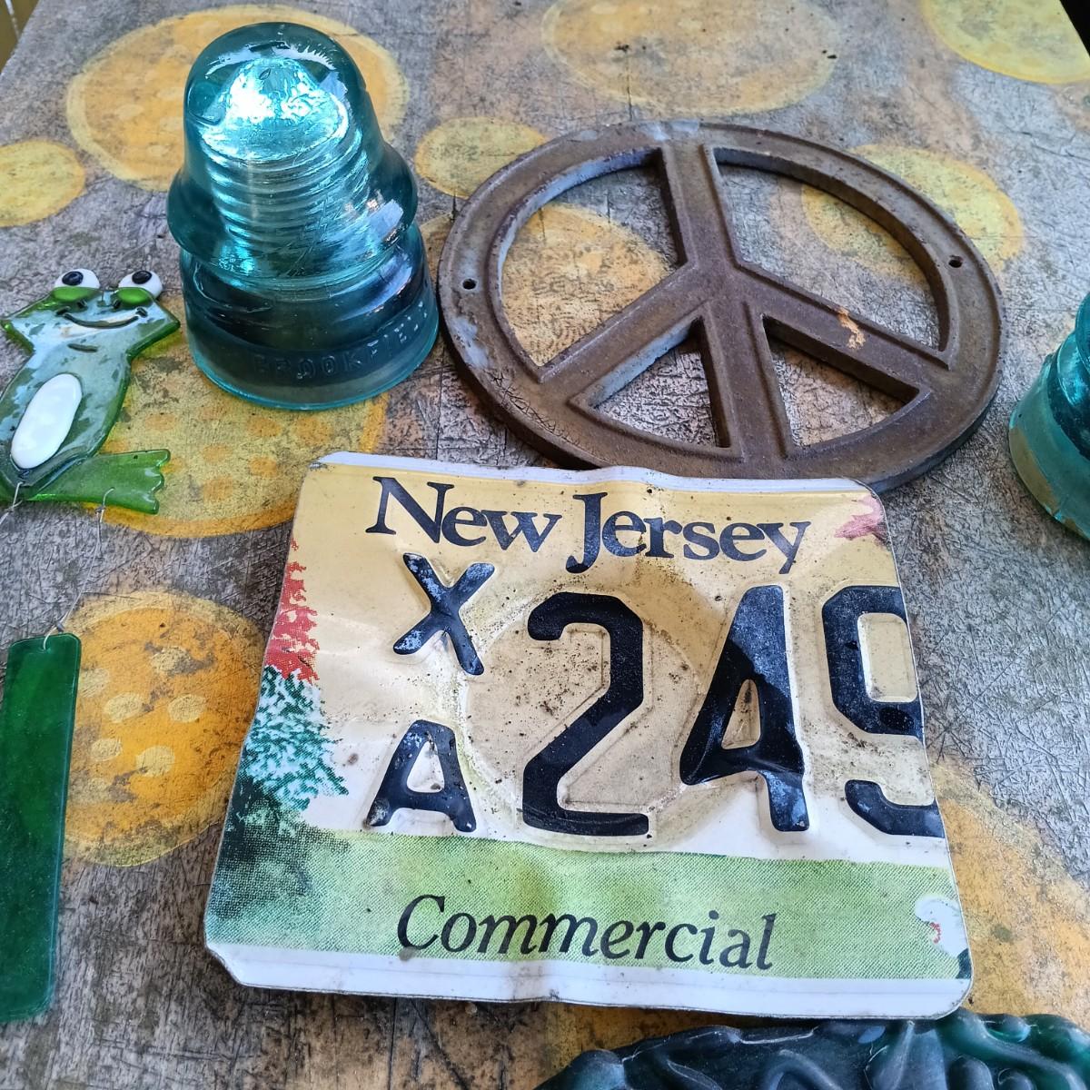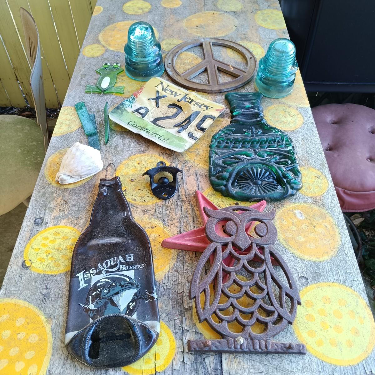LOT 188: Cast Iron Star, Blue Glass Insulators, Glass Frog Wind Chime, Metal Peace Sign & More