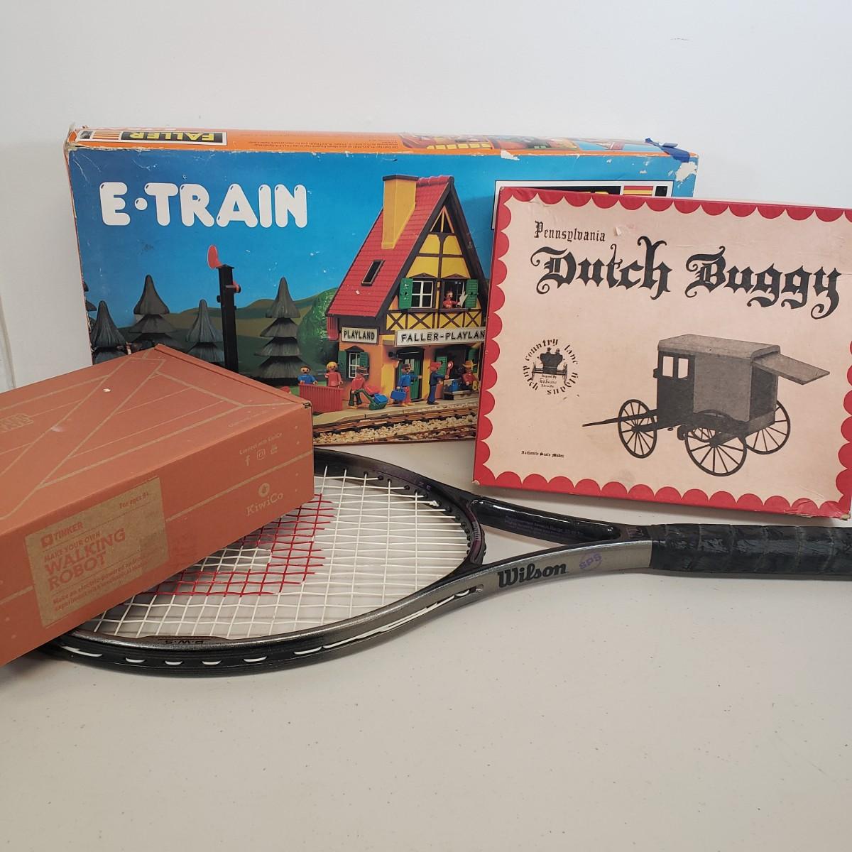 LOT 2: Faller E-Train Playland Set. Model Dutch Buggy, Tinker Crate Walking Robot Model, Wilson Tennis Racket