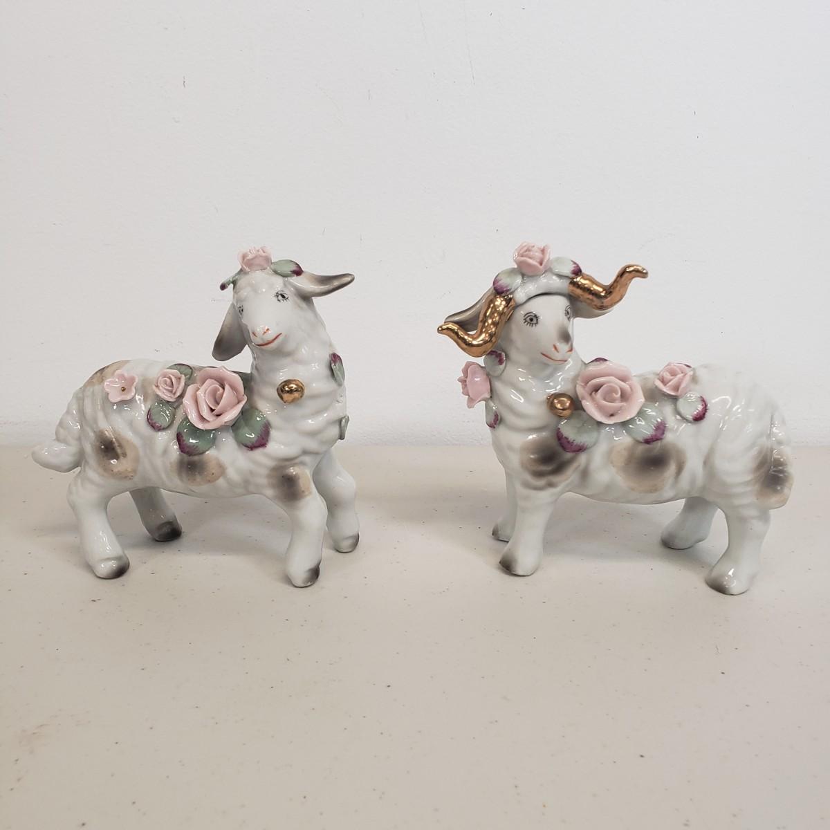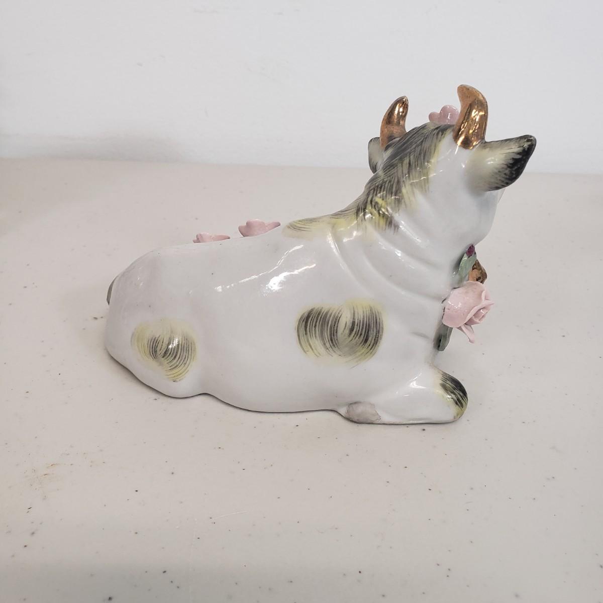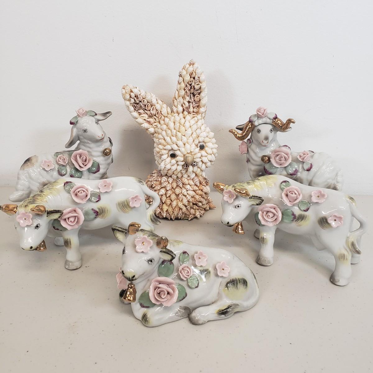 LOT Set of 4 Porcelain Cow & Sheep Figurines with Seashell Decorated Rabbit