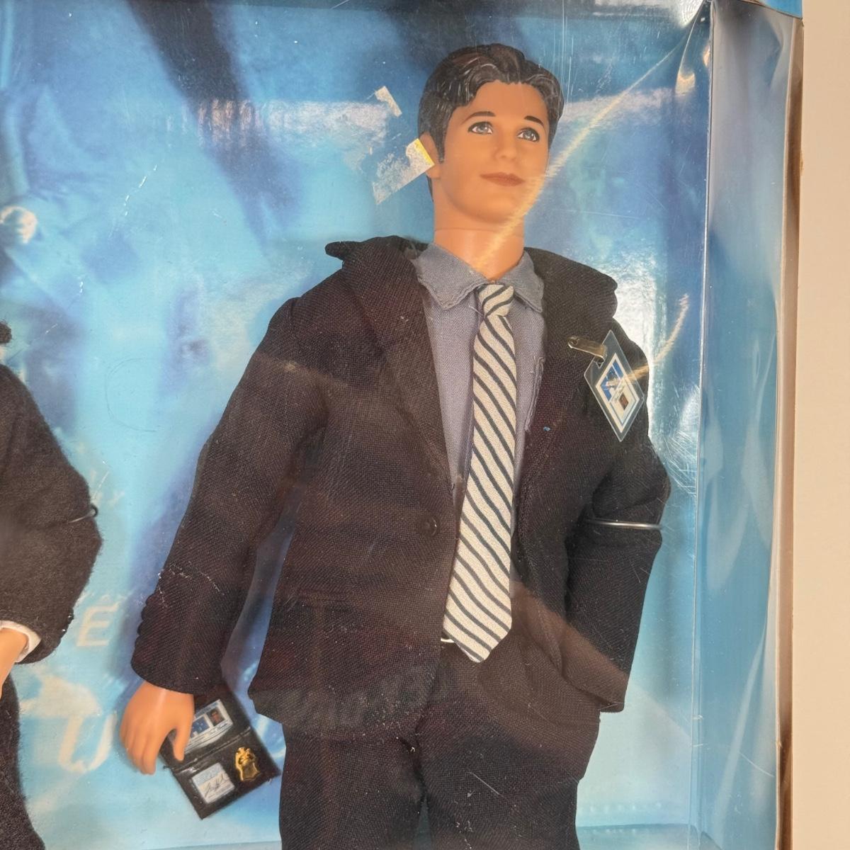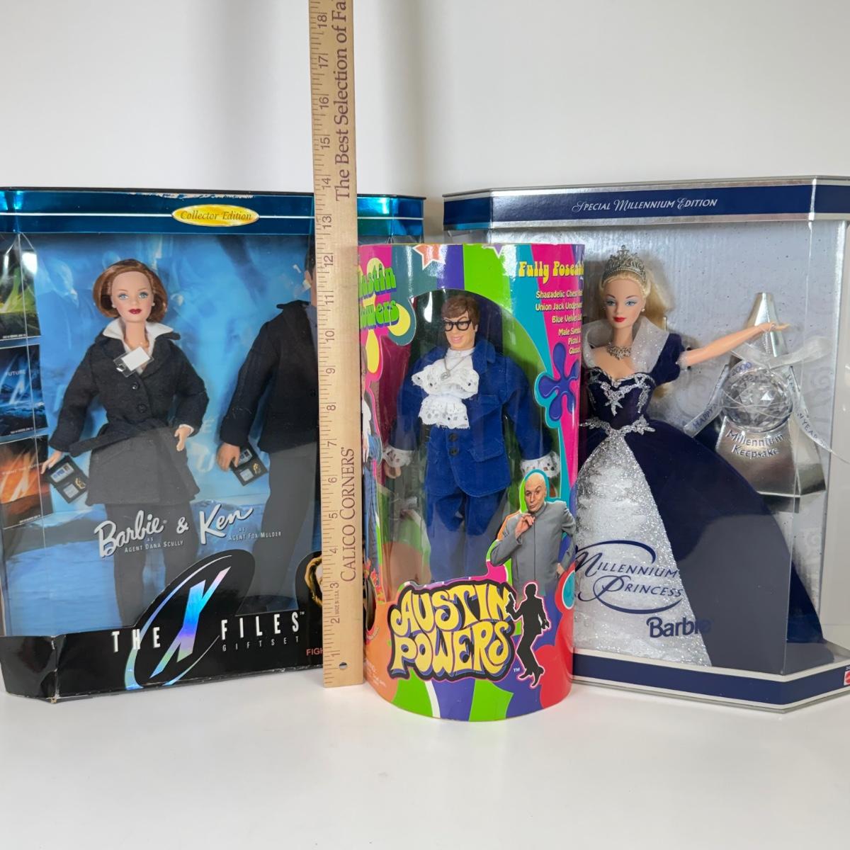 LOT 61: NRFB: 1998 Trendmasters Austin Powers Action Figure, Mattel Barbie Collector Edition Barbie & Ken as Scully & Mulder X-Files Gift Set & 2000 Blue Millennium Barbie NRFB