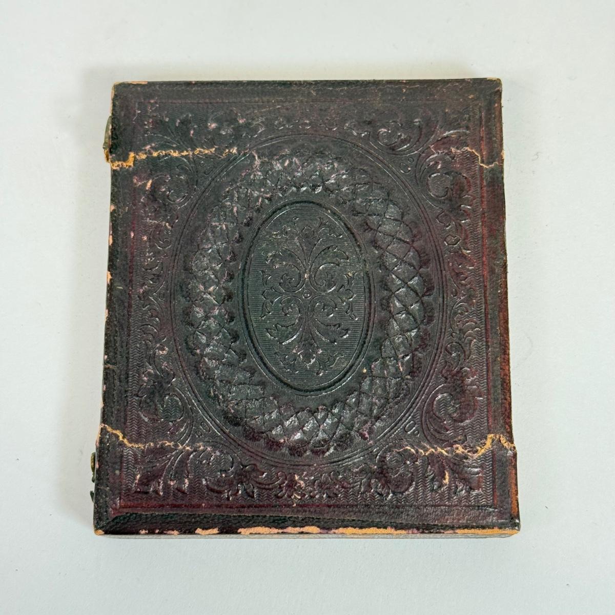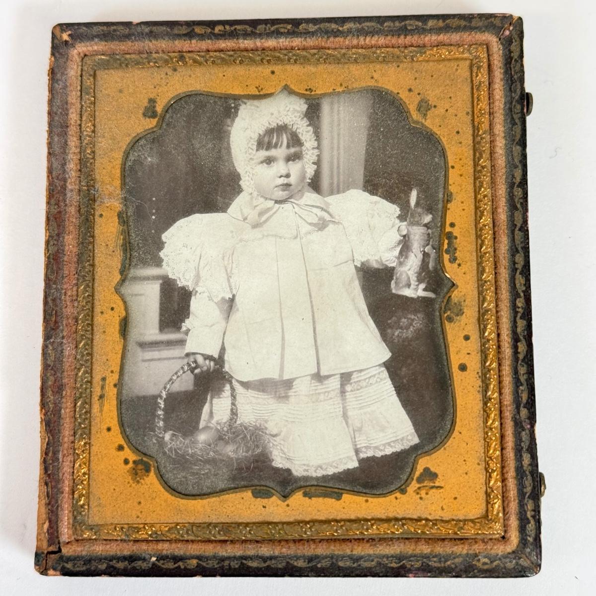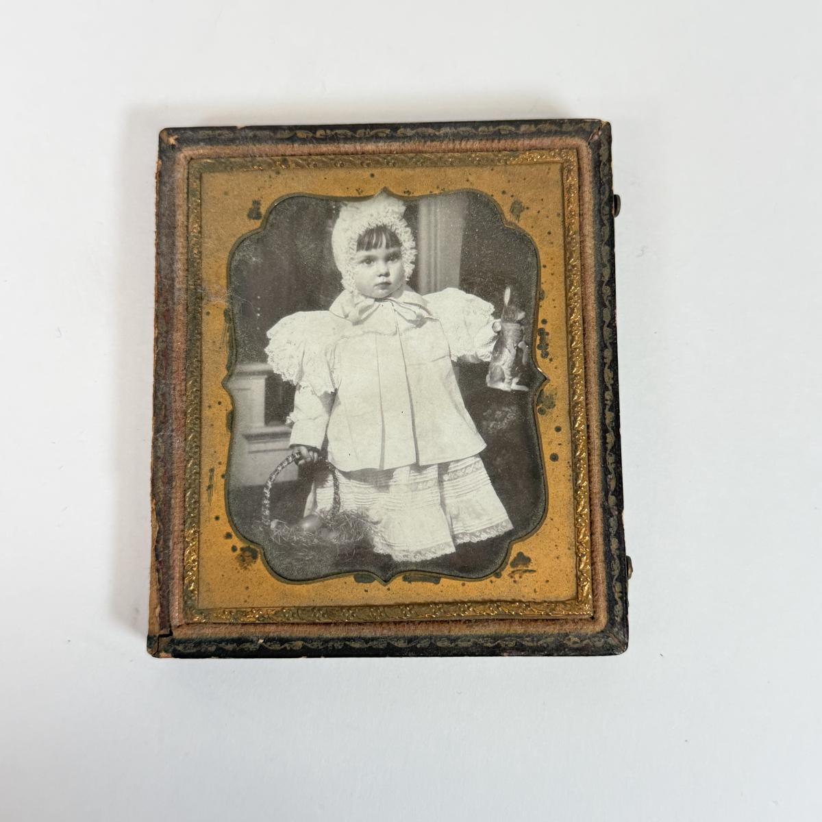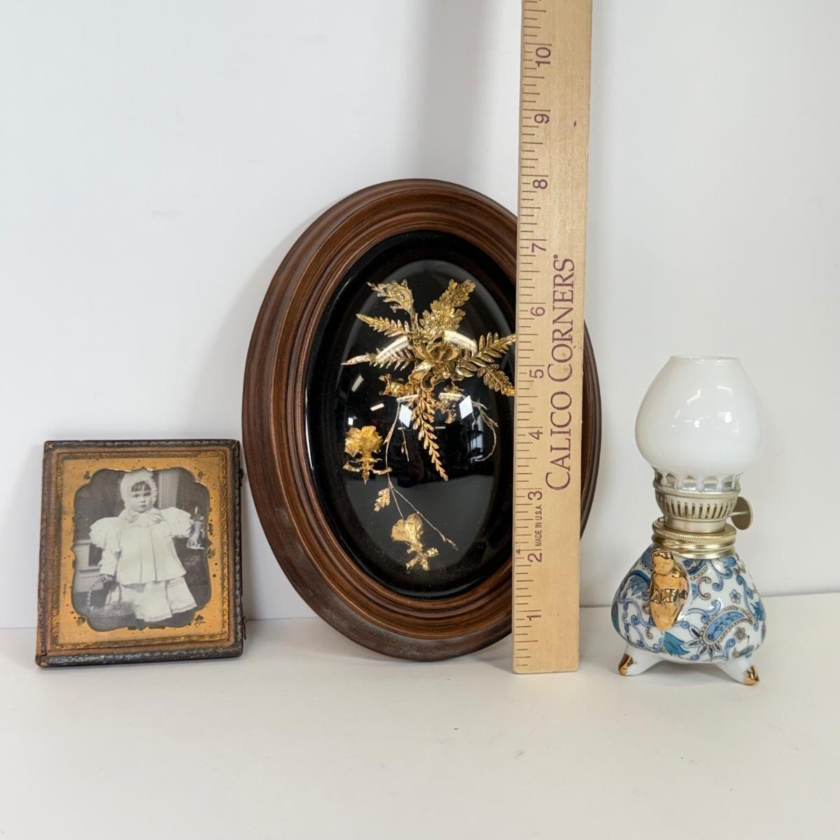 LOT 104: Antique Daguerreotype Photo, Lefton China Mini Lamp & Curved Glass Hawaiian Flora 24kt Gold Wall Decor
