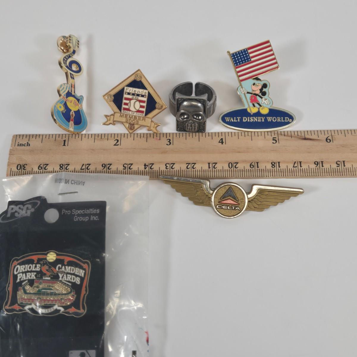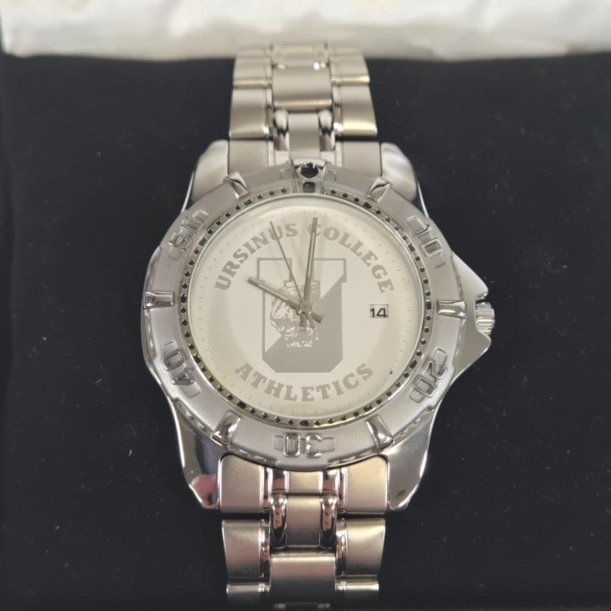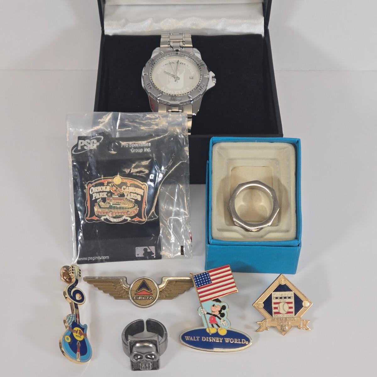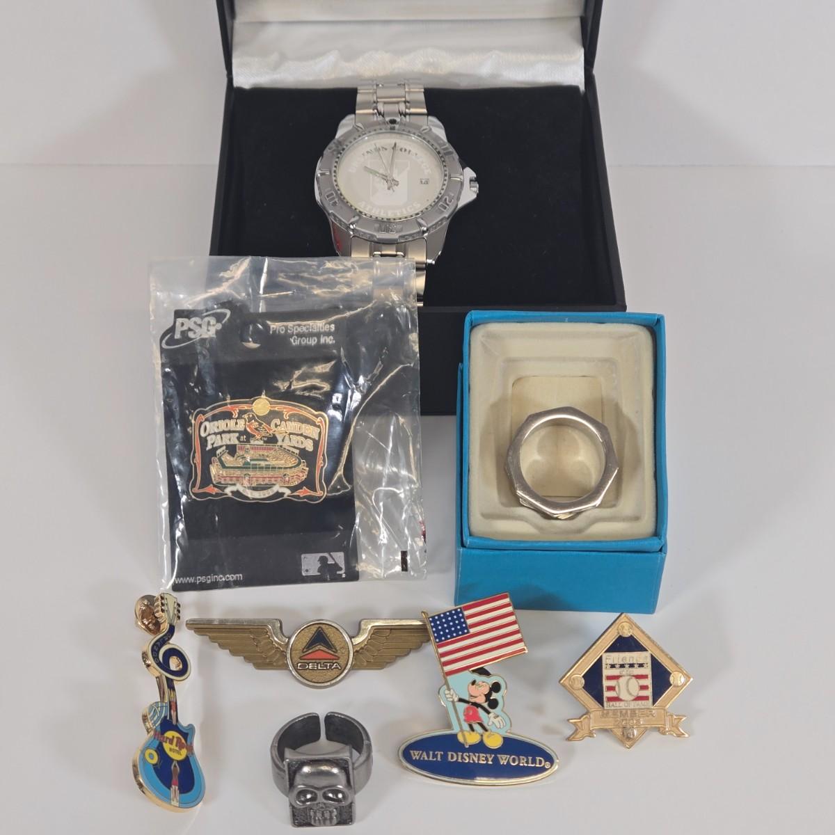 LOT 123: Ursinus College Athletics Watch, Multi-line Geometric Ring, and Various Pins