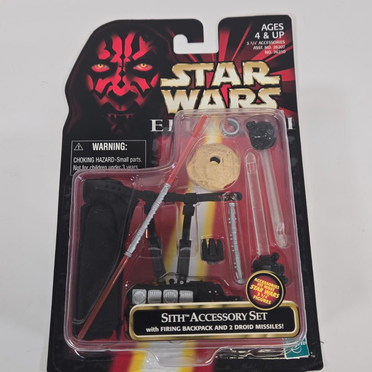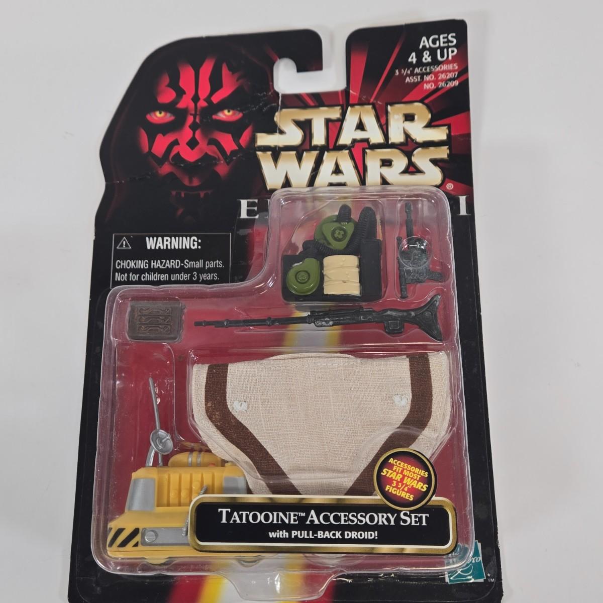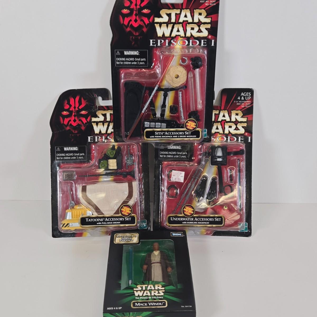 LOT 134: Star Wars: The Power of the Force Episode I Sneak Preview Mace Windu Action Figure, Sith Accessory Set, Tatooine Accessory Set with a Pull-Back Droid, and Underwater Accessory Set