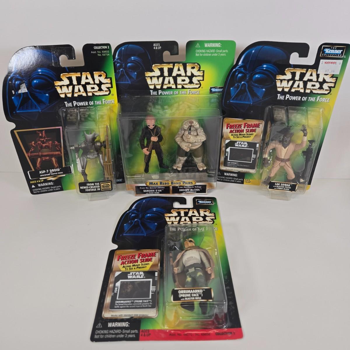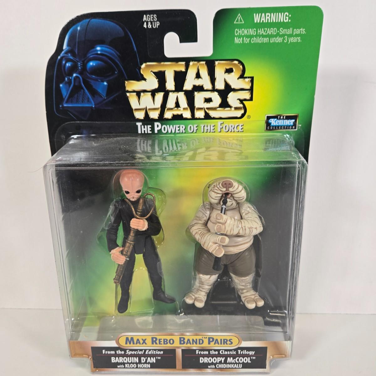 LOT 139: Kenner Star Wars Max Rebo Band Pairs Barquin D'AN & Droopy McCool, Lak Sivrak, ASP-7 Droid, and Force Orrimaarko (Prune Face) Action Figures
