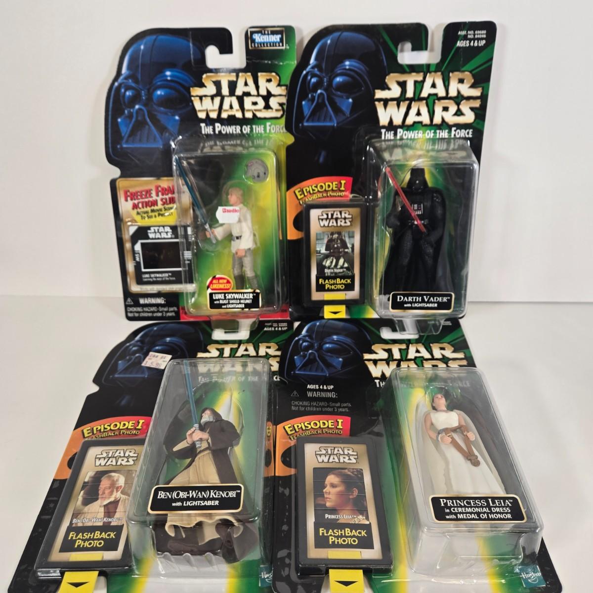 LOT 142: Kenner Star Wars Power of the Force Freeze Frame Luke Skywalker, Darth Vader, Princess Leia, and Ben (Obi-Wan) Kenobi Action Figures