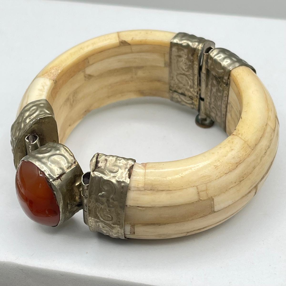 LOT 182J: Bracelet and Ring Collection featuring a Tibetan carved bone and Carnelian hinged bangle bracelet.