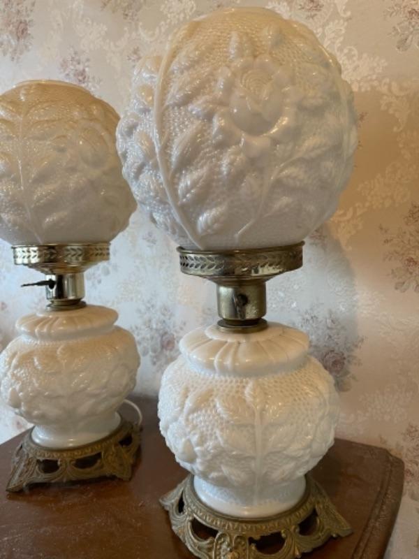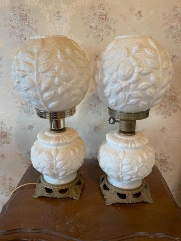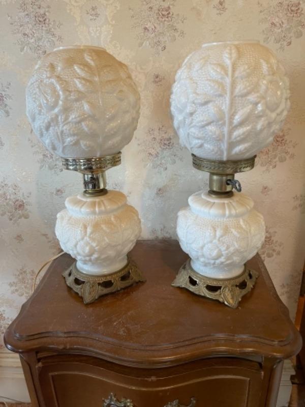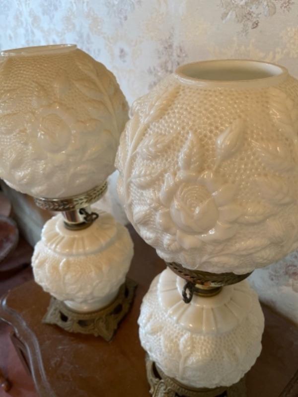 Lot 119B1. Pair of milk glass hurricane style lamps--$55
