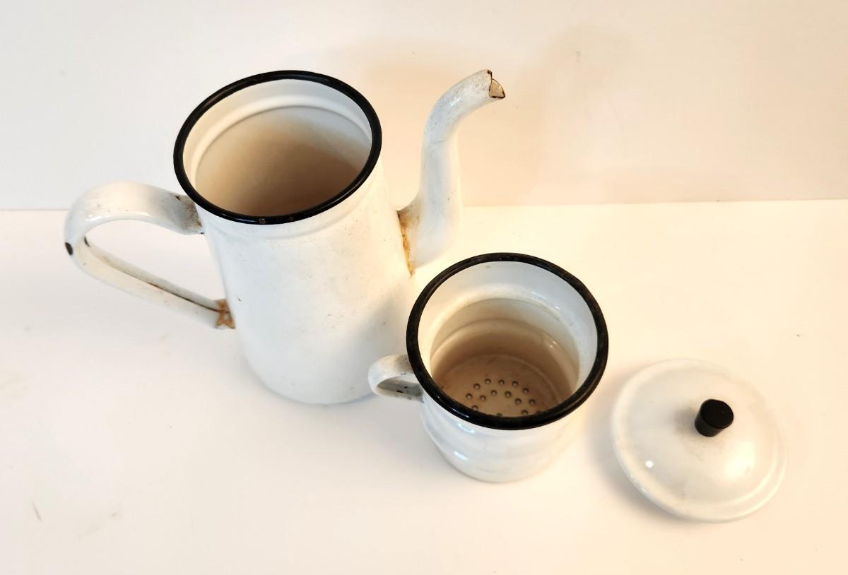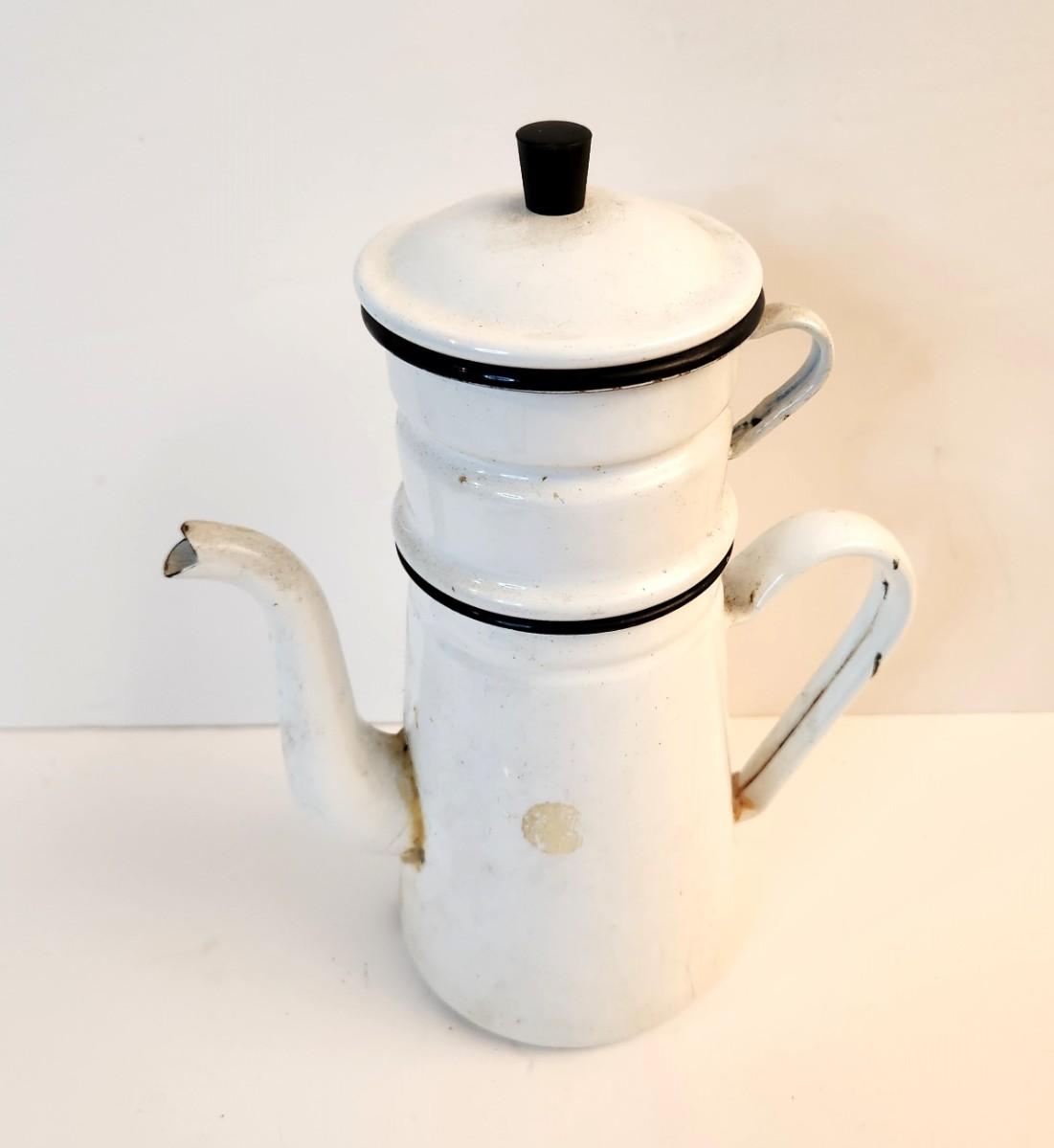 White French style enamel coffee pot - vintage - 4 pieces. 11" tall, vintage condition. Has the strainer.