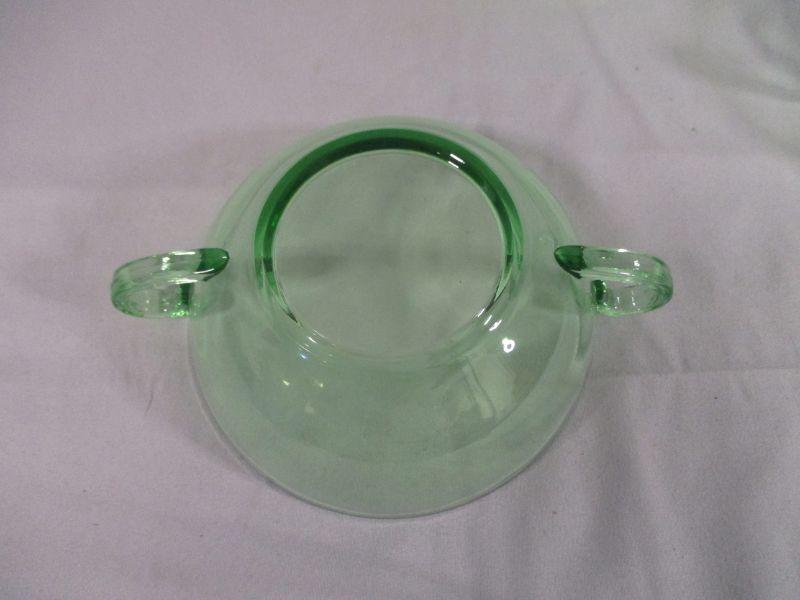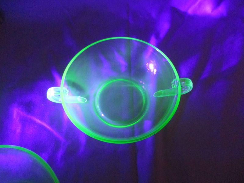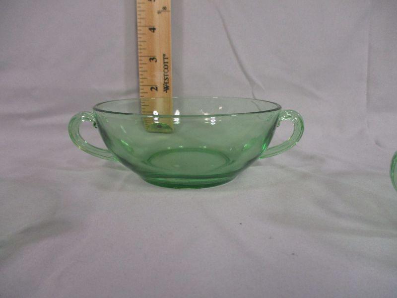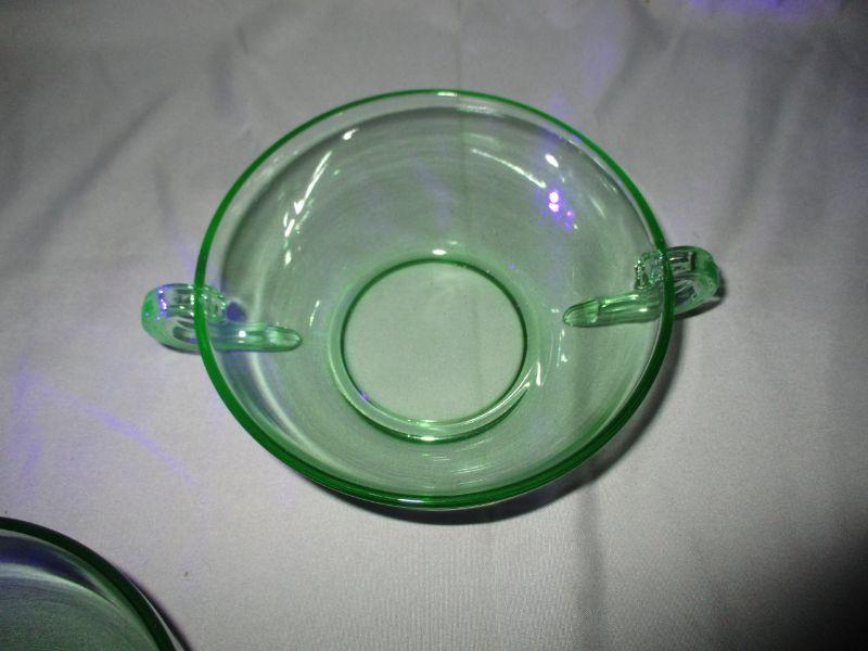 I believe (based on the handles and other similar patterns by Fostoria) that these are from Fostoria. I couldn't find an exact match though, so take that with a grain of salt in your cream soup. These bowls are in excellent condition and glow beautifully under a black light. Each is about 6.5" from handle to handle.