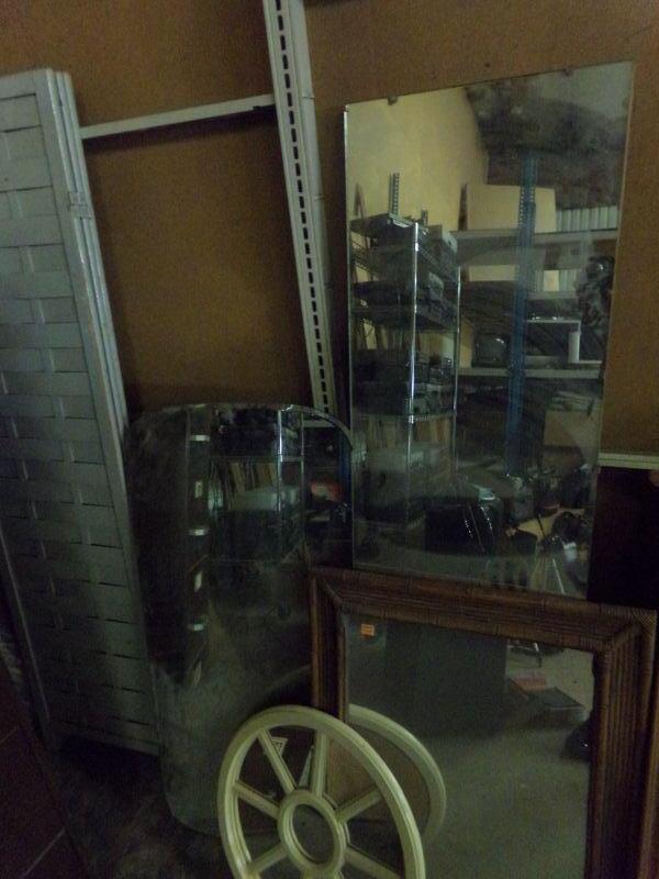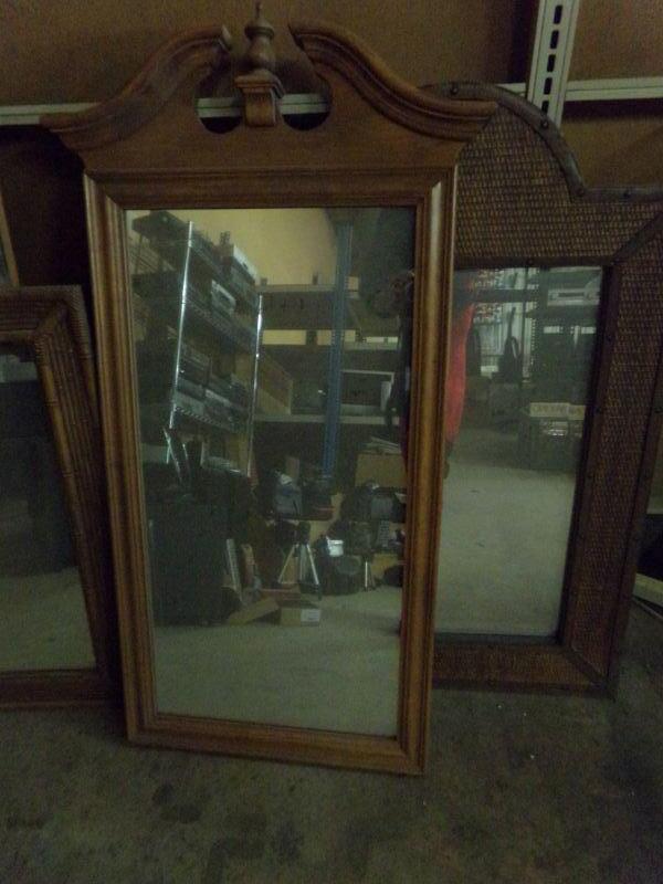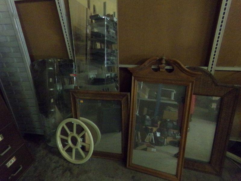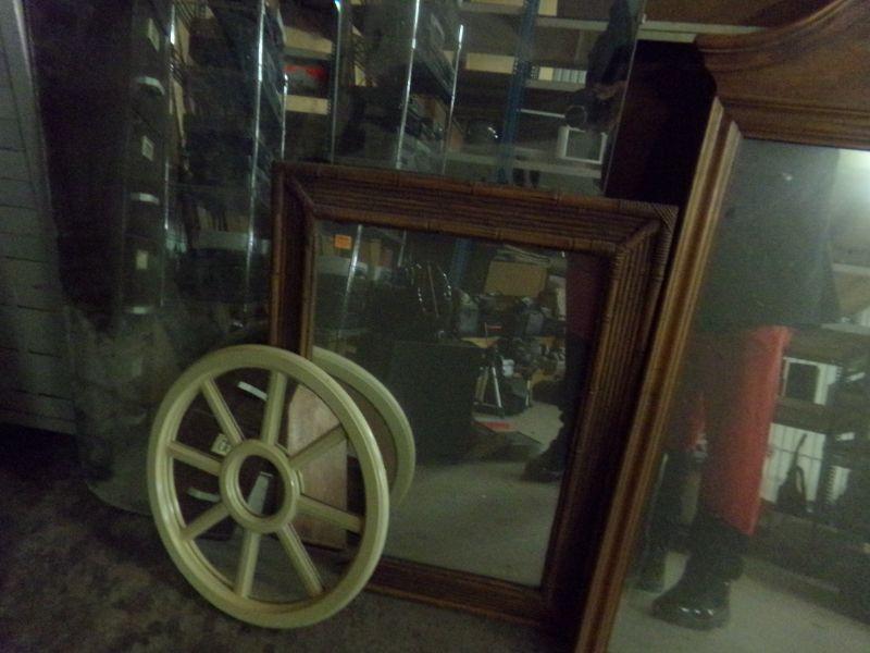 THREE WOODEN FRAME MIRORS & WHITE WHEEL MIRROR AND MIRRORS.