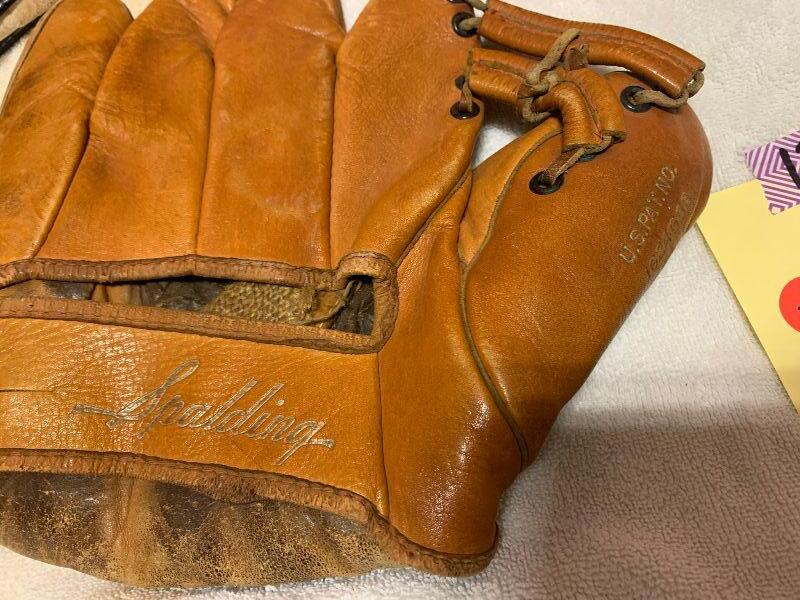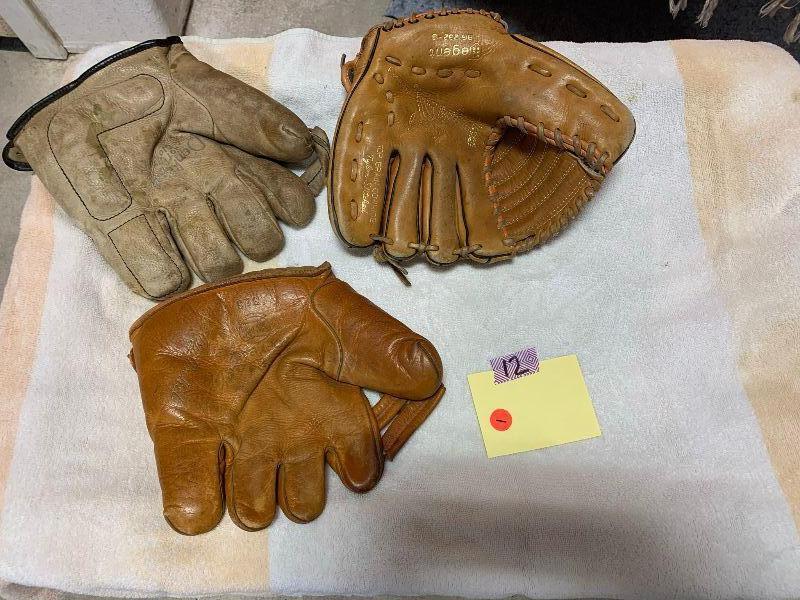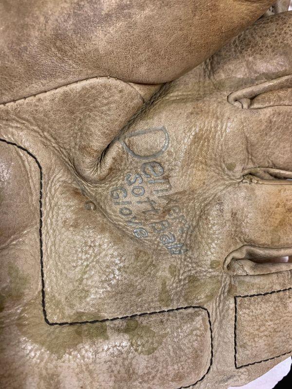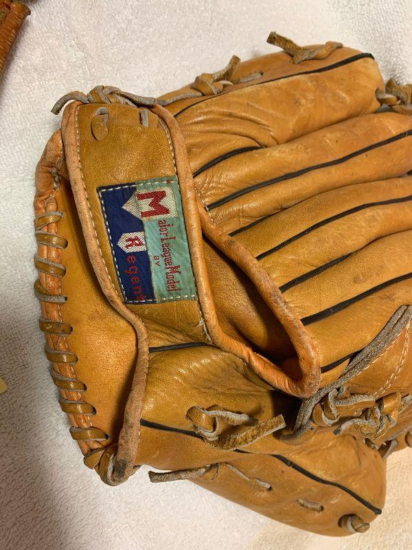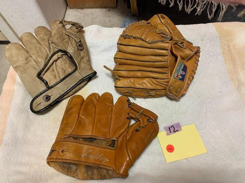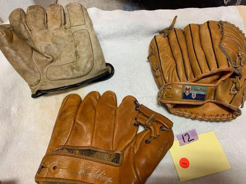 3 vintage mitts: left hand mitts. 1. Regent BG 232-B Bobby Shanty, 2. Official Softball Spalding 313 Big Rocket, 3. Denke Softball glove 32G (worn)