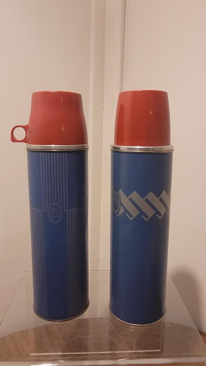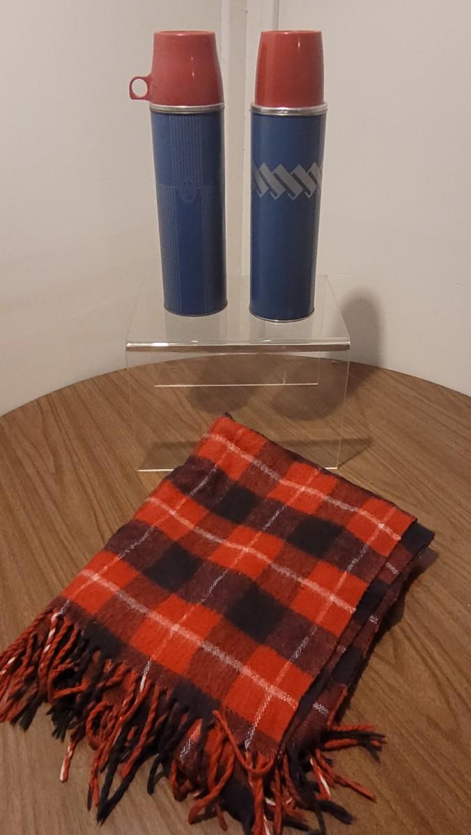 Lot 12: Vintage Red & Blue Wool Plaid Blanket & (2) Keapsit Thermoses