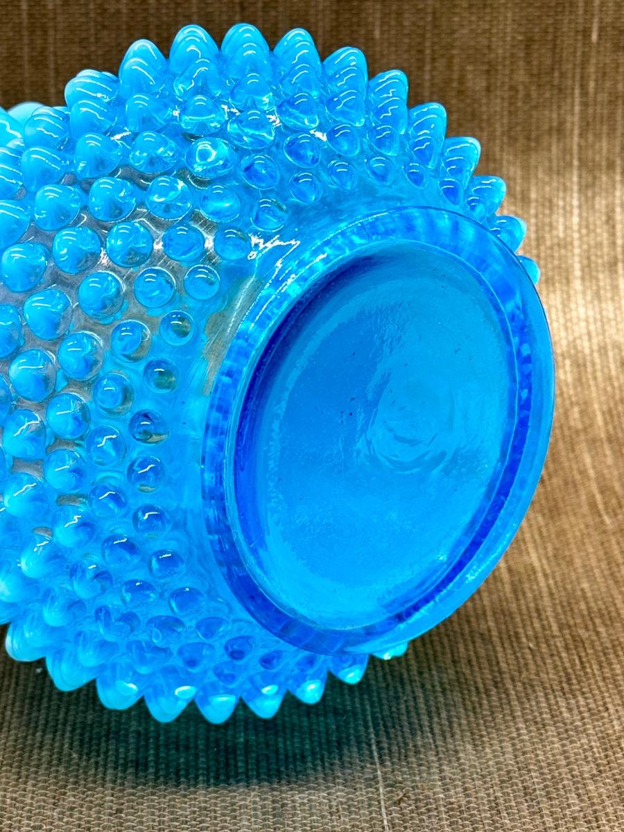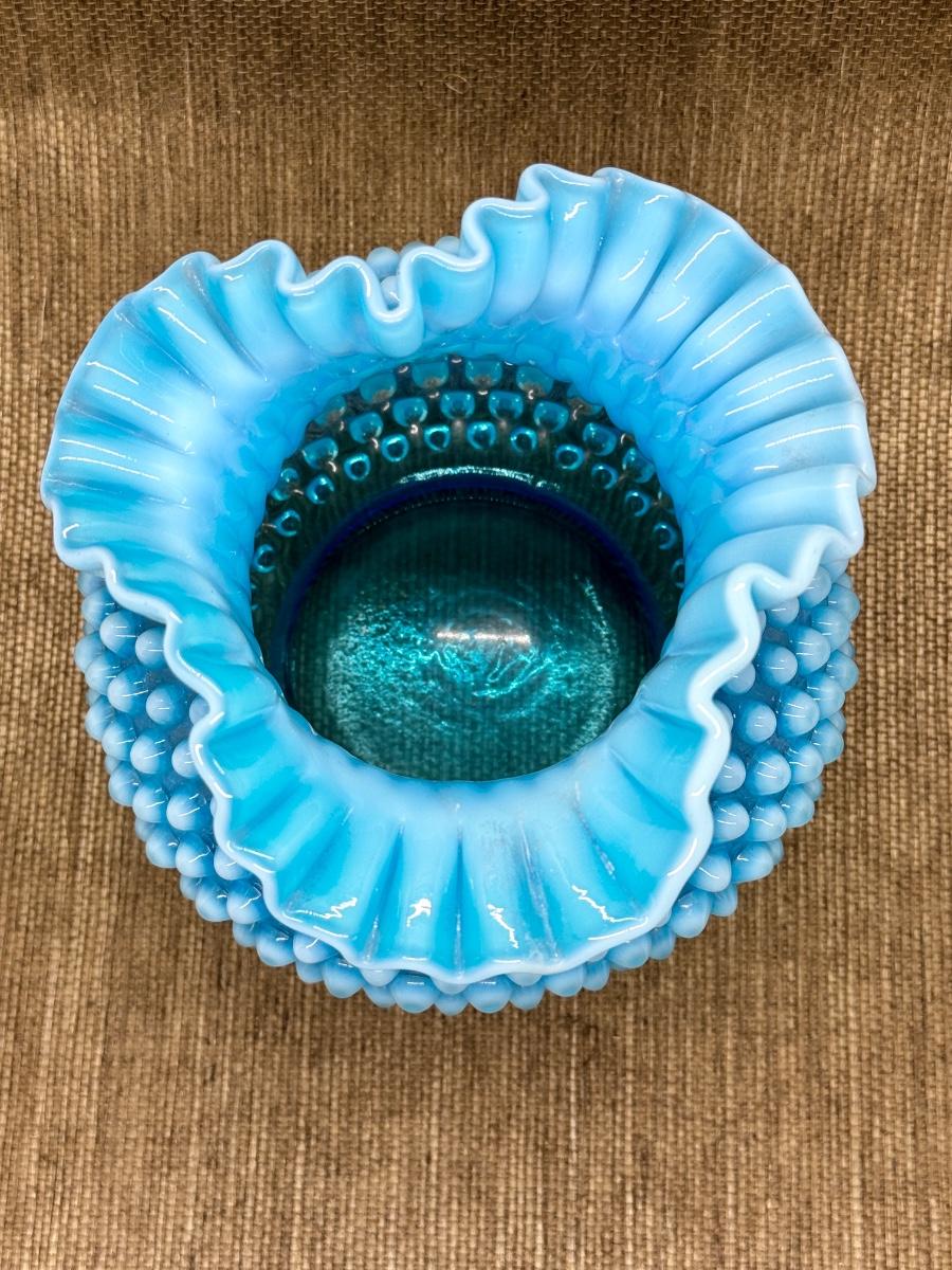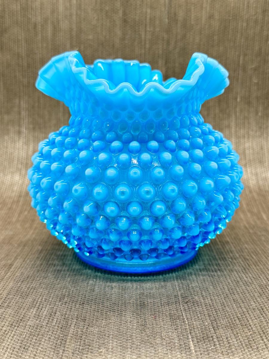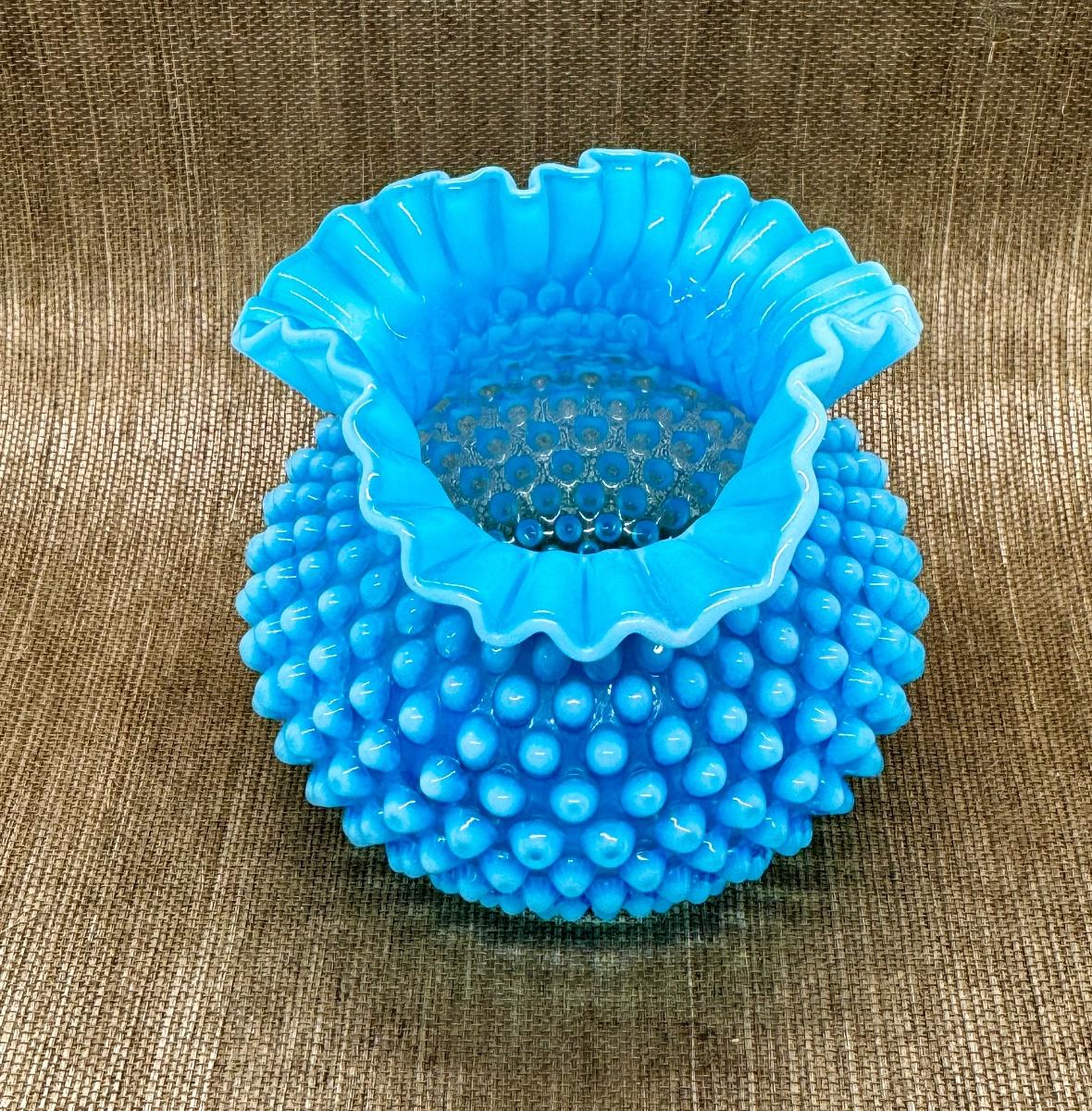LOT 12 - Vintage Fenton Glass Hobnail Blue Opalescent Ruffled Vase in very good condition.