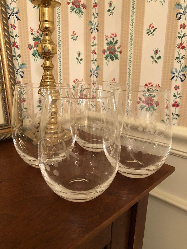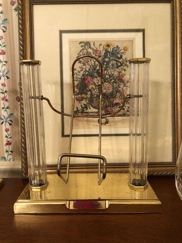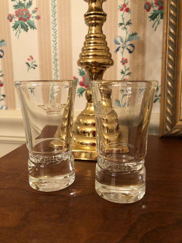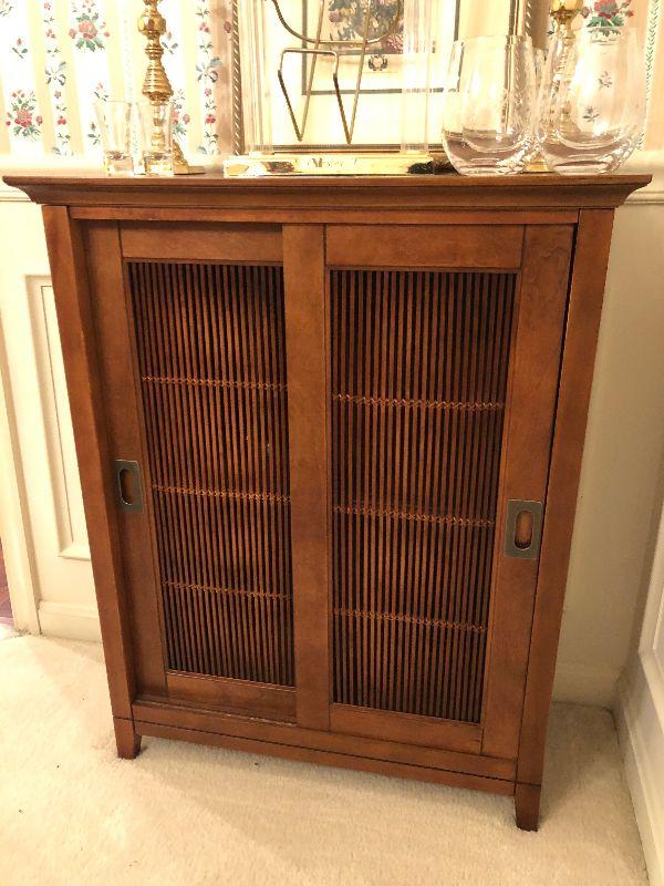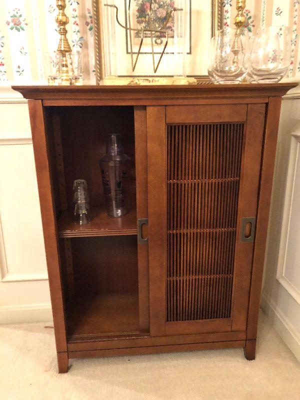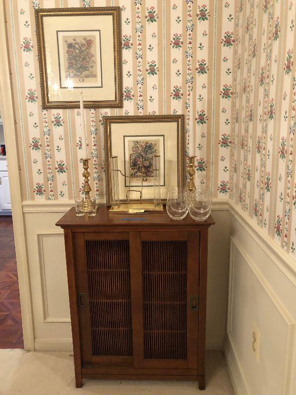Wood Accent Cabinet with Sliding Drawers (26: x 11" x 33"), a Pair of Heavy 10" Tall Brass Candlesticks, Etched Wine Glasses, 2 Shot Glasses and a 'Crown Royal' Holder.