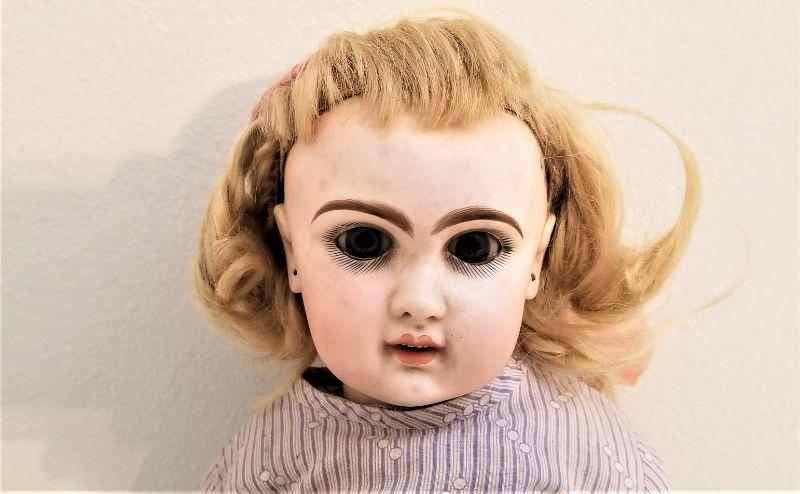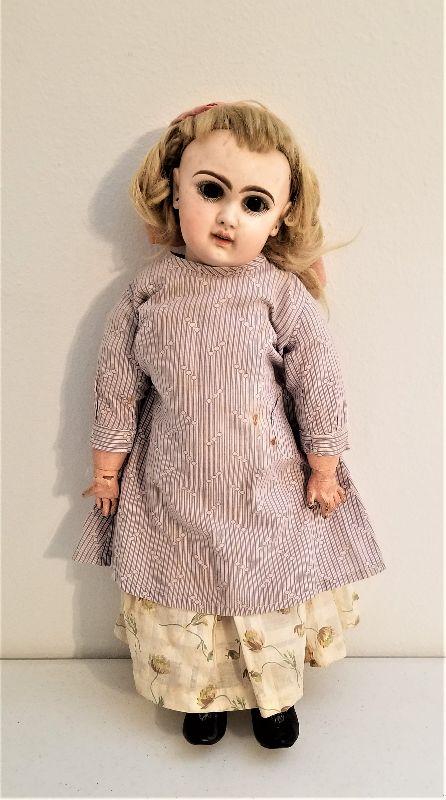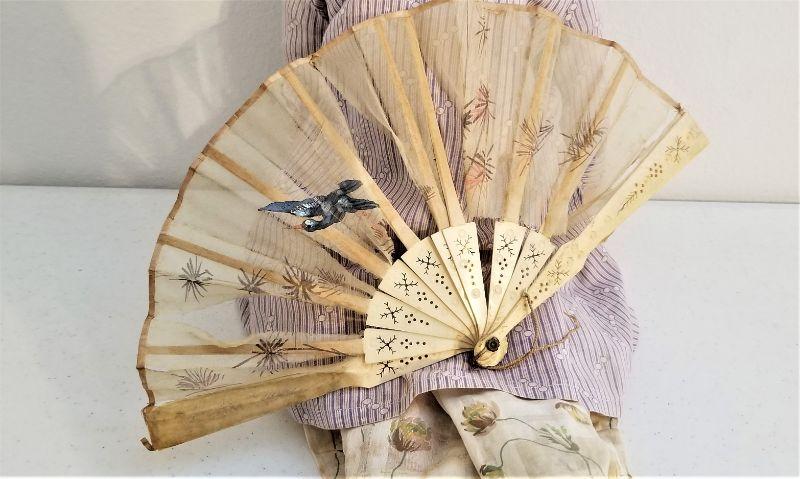 Antique German (probably) bisque doll with composition body (arms are jointed) wearing period clothing/undergarments and original shoes. Big blue eyes - original mohair wig - pierced ears. 20" tall. Antique fan found with the doll included, as shown. Doll dates from about 1890-1900. No maker indicated.