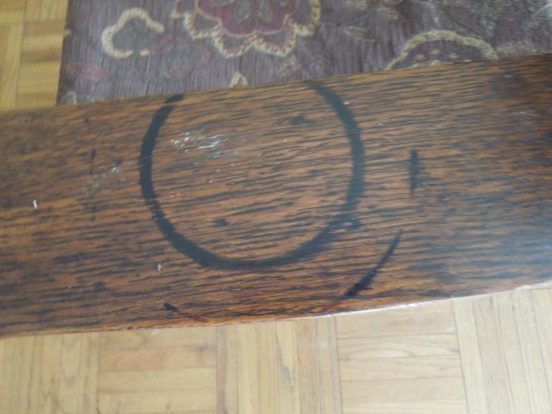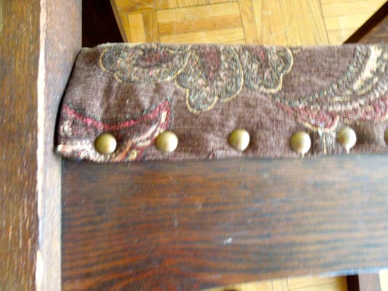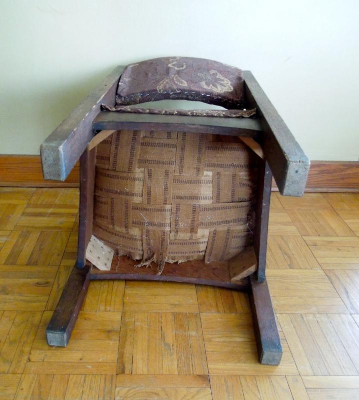 Very sturdy old chair upholstered in heavy tapestry "carpetbag" fabric with brass nail head tacking. Finish on chair is worn and scratched. Large dark ring (see photo) on one arm. Seat is stuffed with cotton and straw. 21 W x 22" L x 38" H.