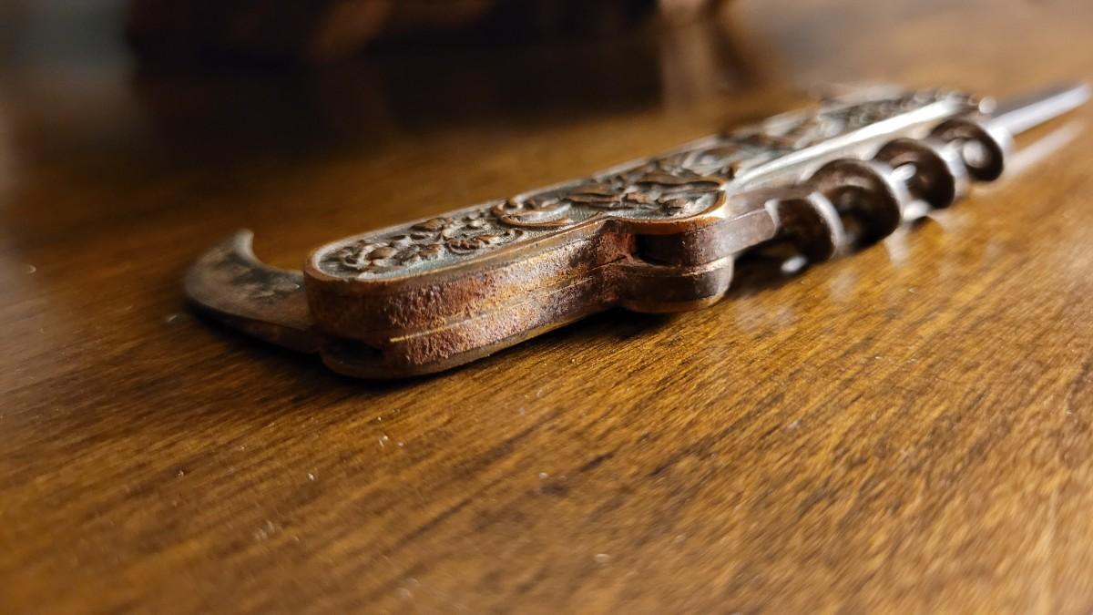 THIS LOT FEATURES A RARE 1900ish AUTHENTIC CORKSCREW FOLDING KNIFE MADE BY WESTER BROTHERS GERMANY. THIS IS A VERY TOUGH COLLECTIBLE TO FIND. FAIR TO FAIRLY GOOD CONDITION WITH MINOR HANDLING WEAR/OXIDATION AND ONE SMALL BLADE BROKEN AS SHOWN.