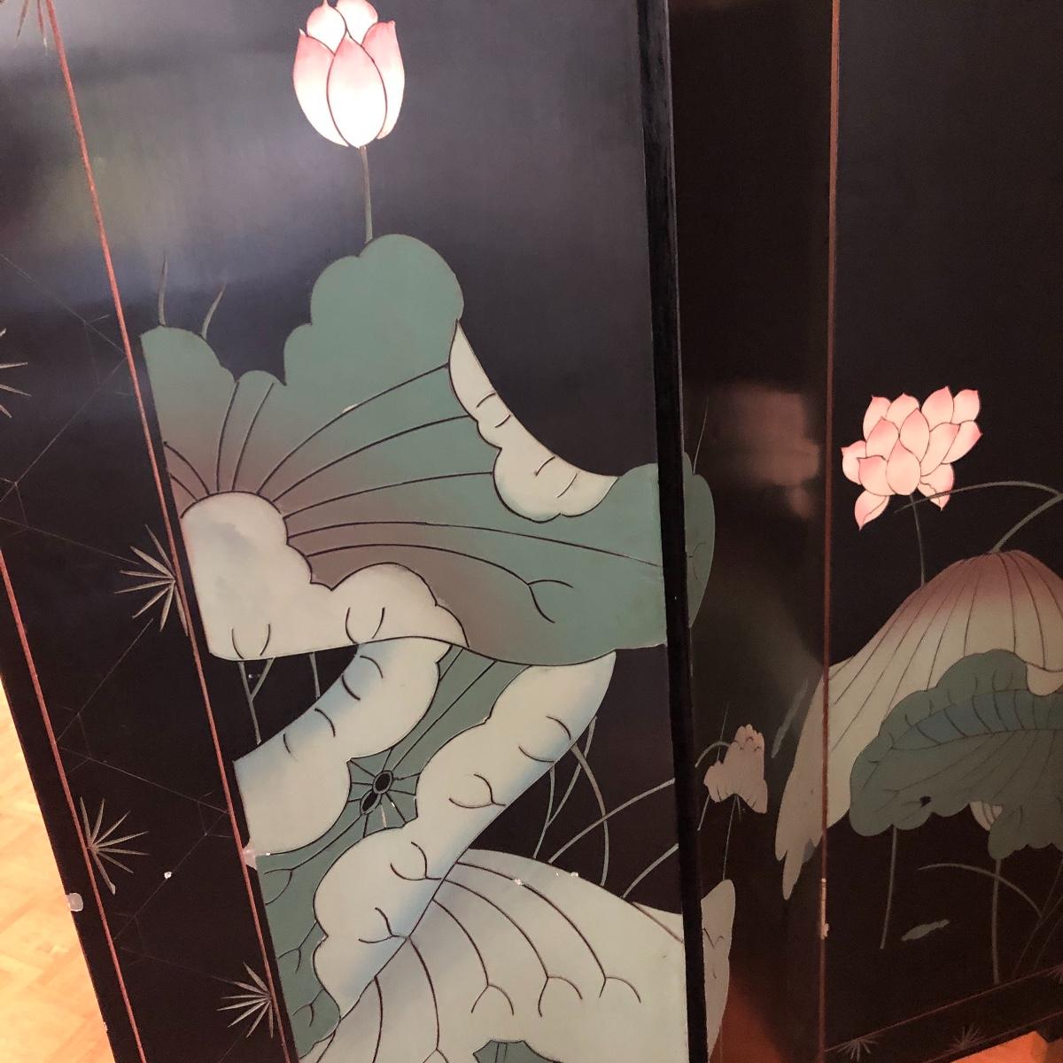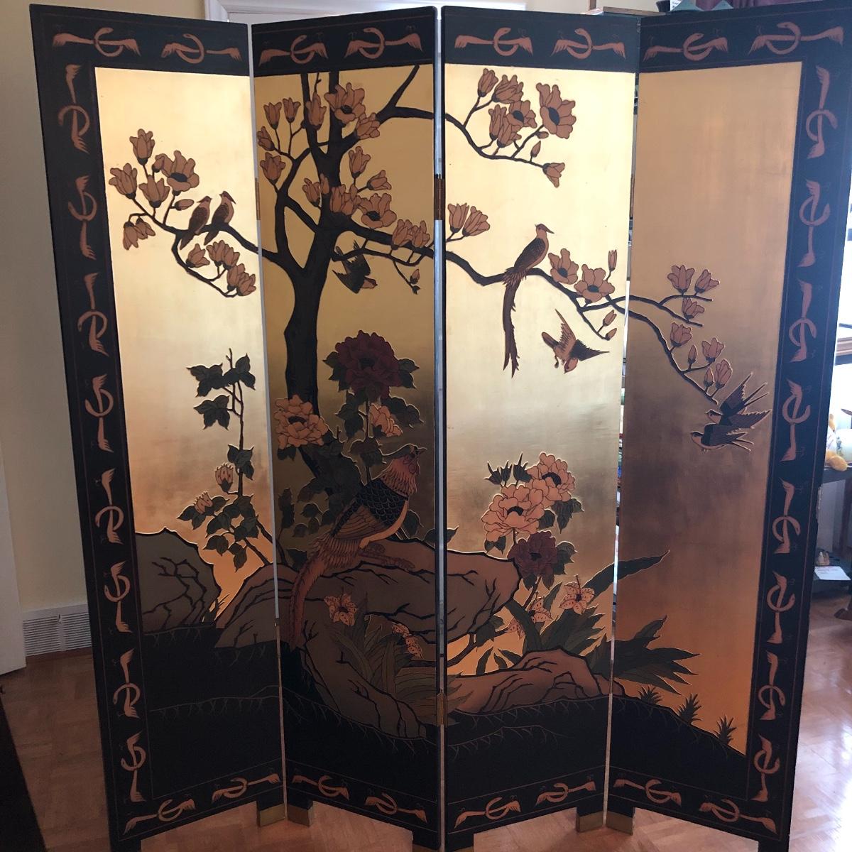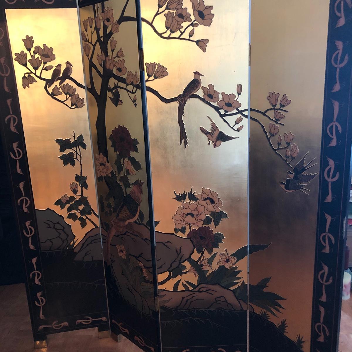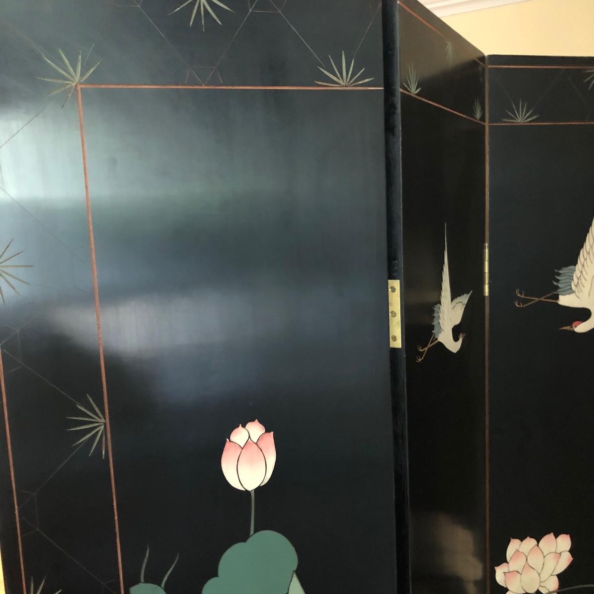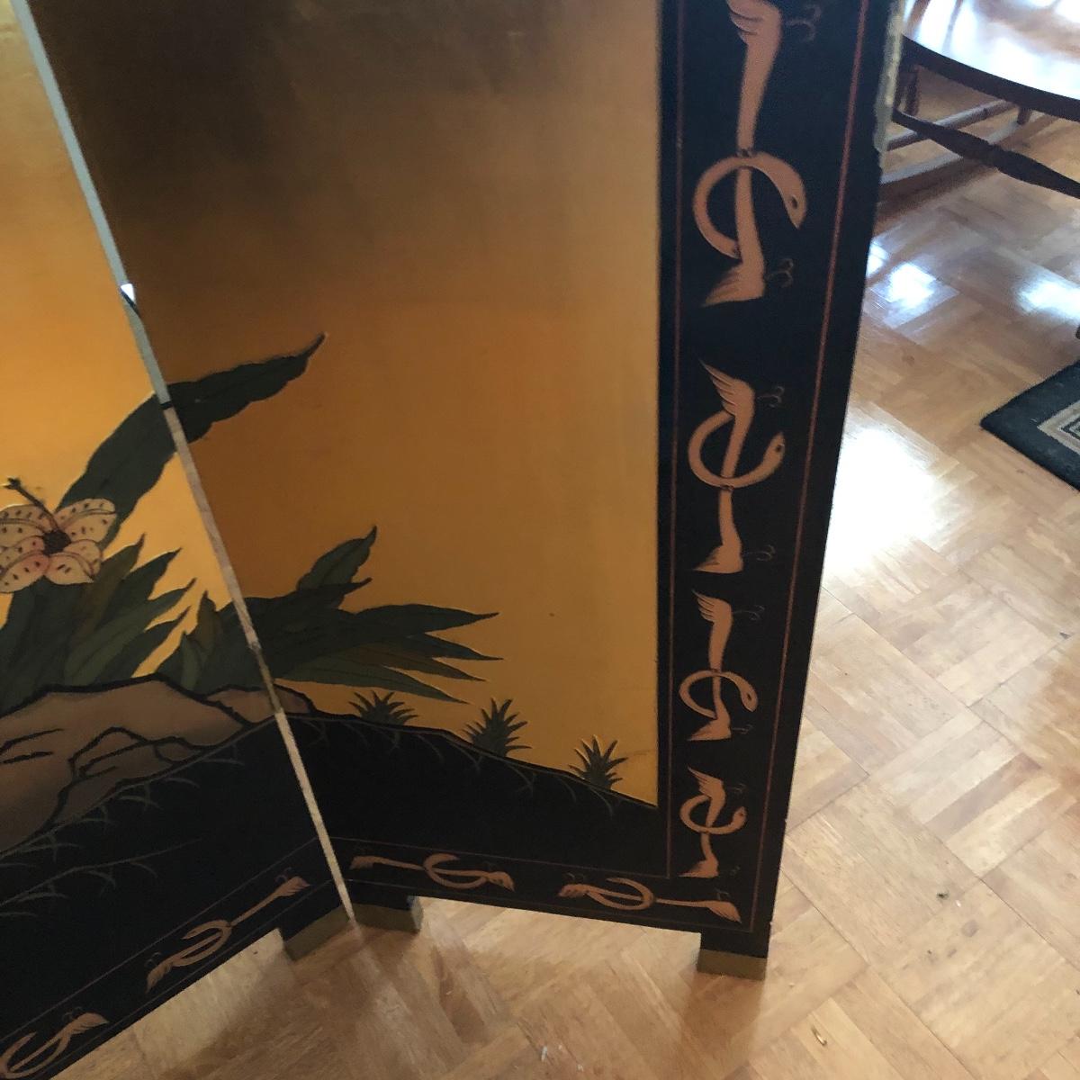 This room screen has four panels and depicts a beautiful outdoor scene with a gold hue as a backdrop. The feet are wrapped in metal. The reverse side features cranes and flowers on a black background with green plants. It has a few nicks on it. It measures approximately 64” x 1” x 72”. Local pick up only.