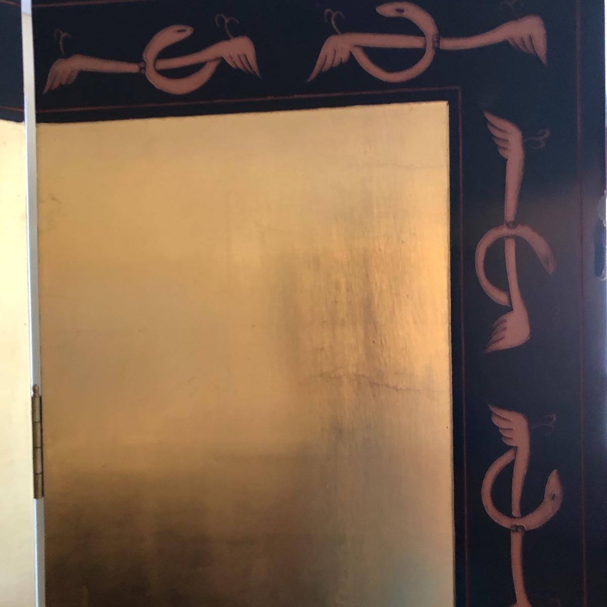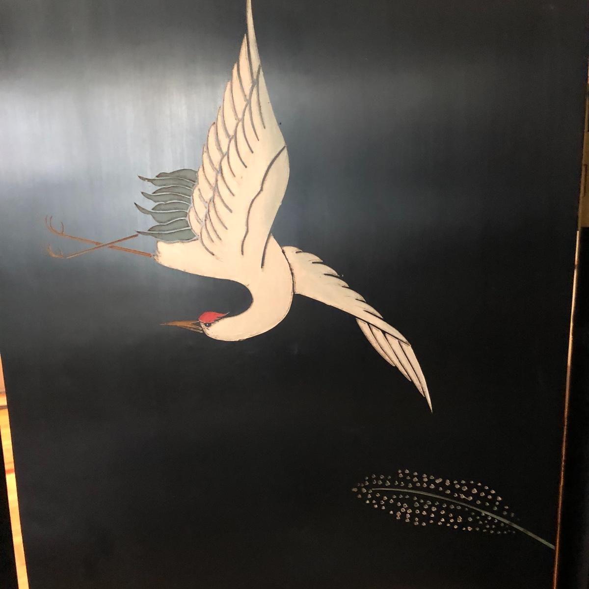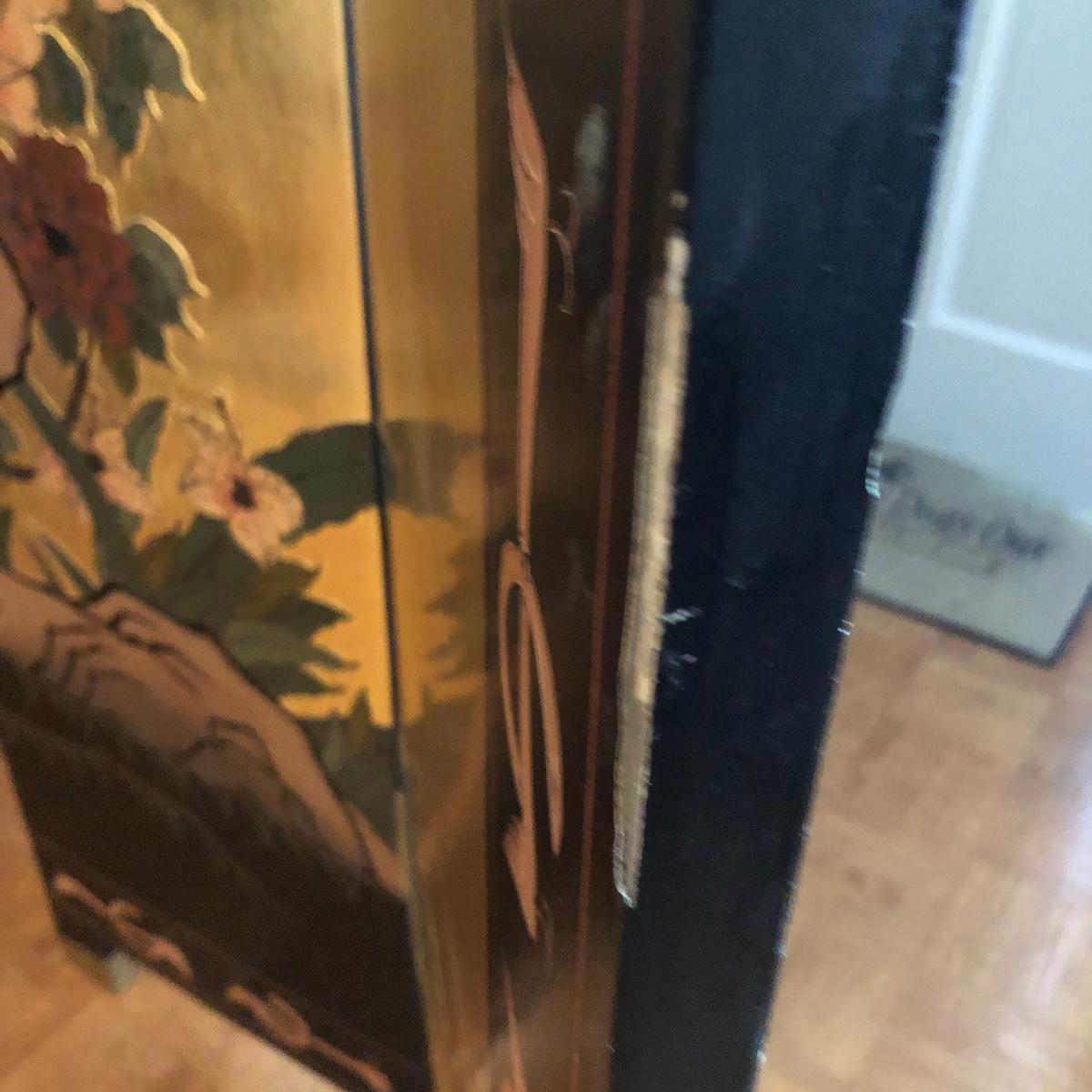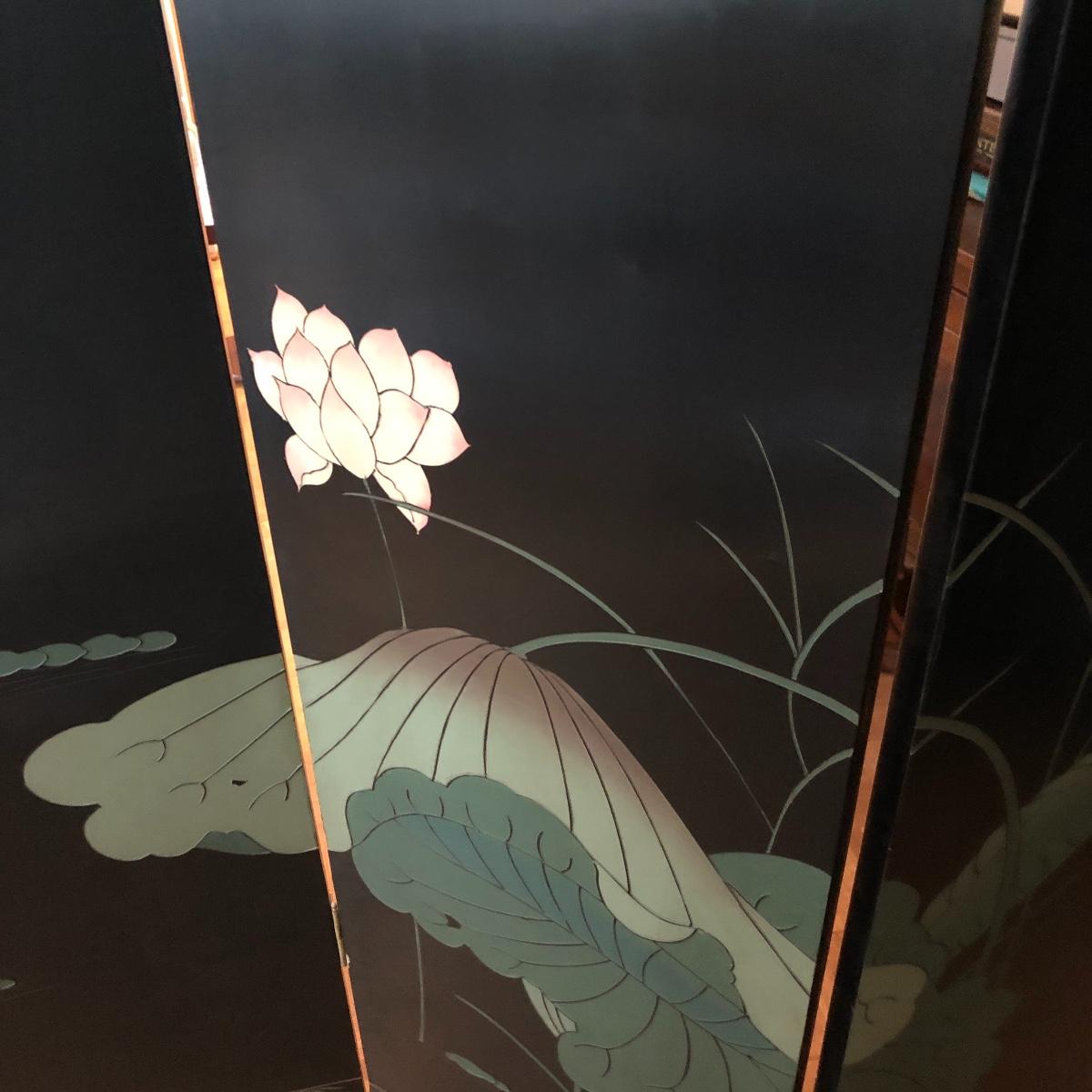 This room screen has four panels and depicts a beautiful outdoor scene with a gold hue as a backdrop. The feet are wrapped in metal. The reverse side features cranes and flowers on a black background with green plants. It has a few nicks on it. It measures approximately 64” x 1” x 72”. Local pick up only.