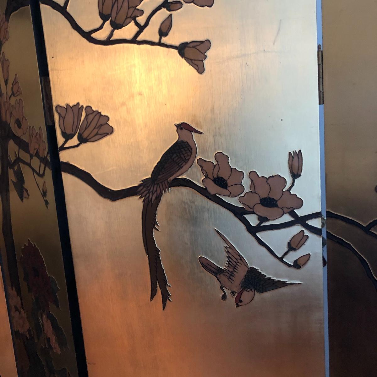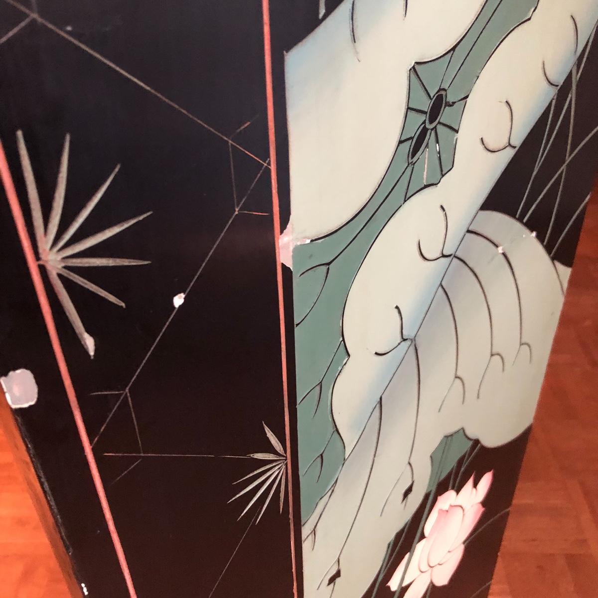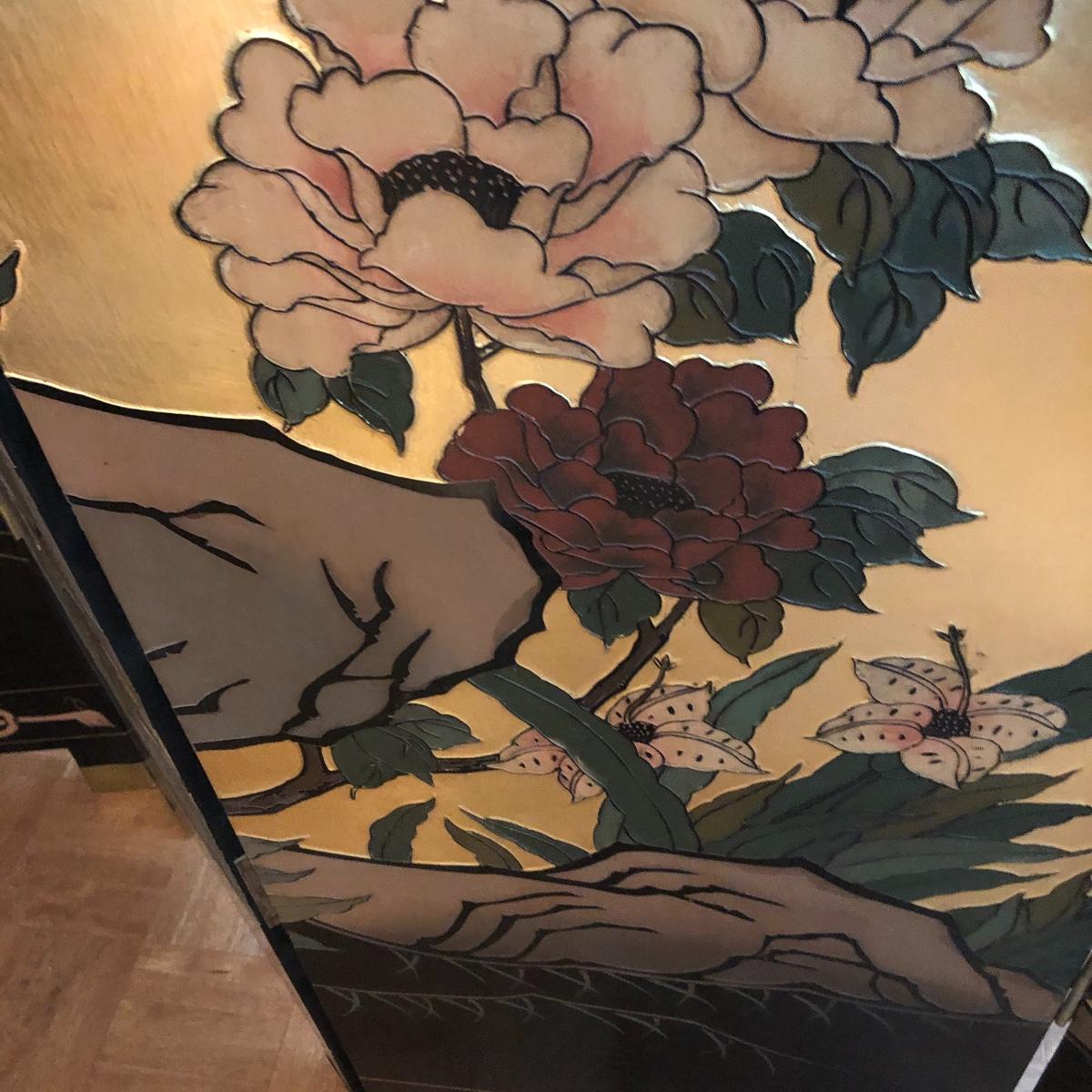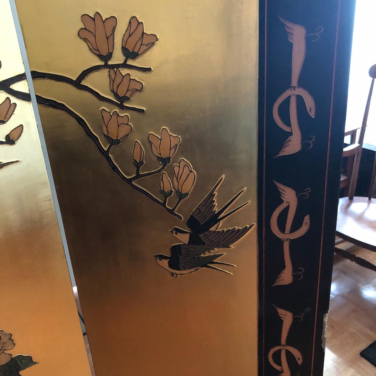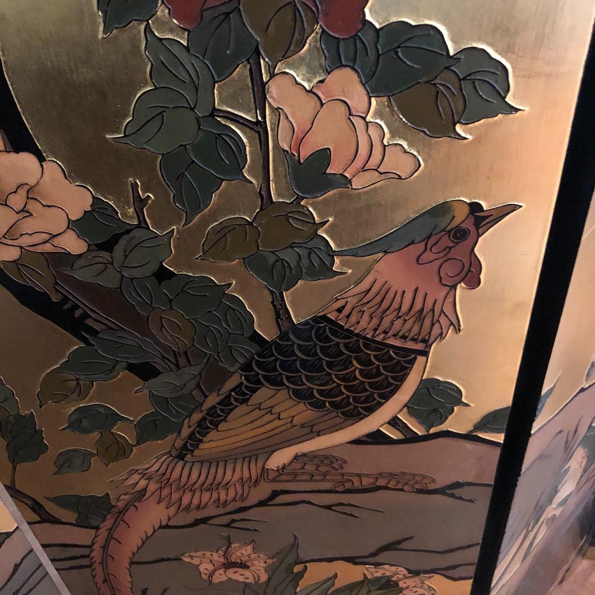 This room screen has four panels and depicts a beautiful outdoor scene with a gold hue as a backdrop. The feet are wrapped in metal. The reverse side features cranes and flowers on a black background with green plants. It has a few nicks on it. It measures approximately 64” x 1” x 72”. Local pick up only.