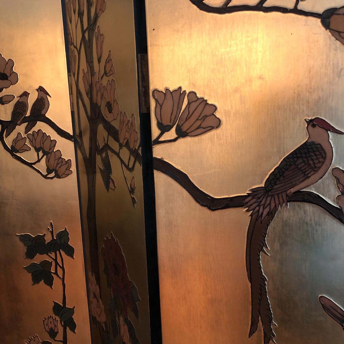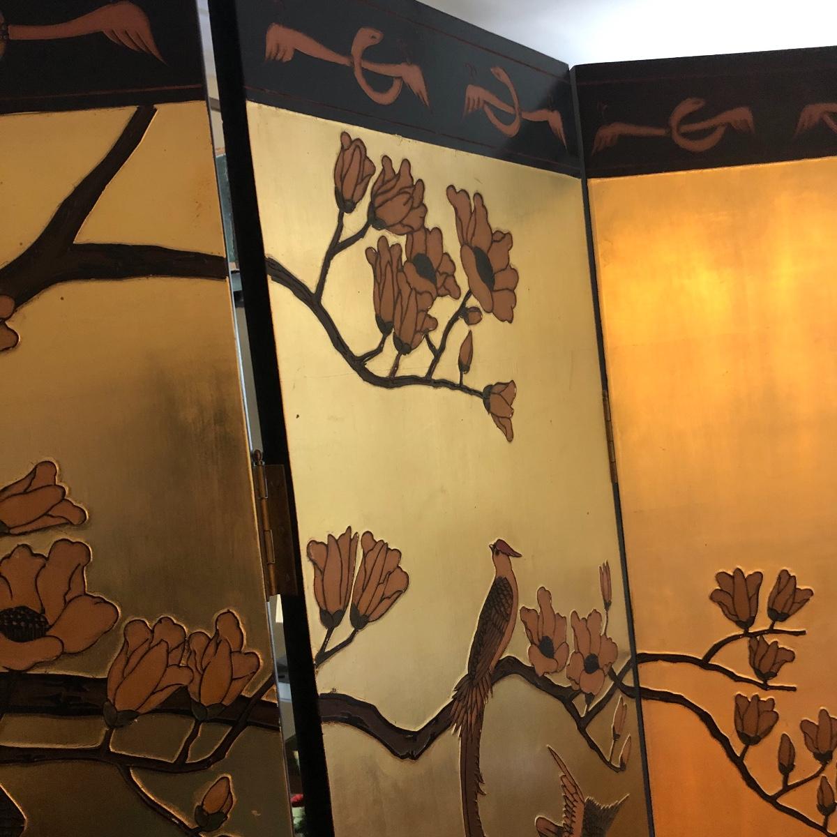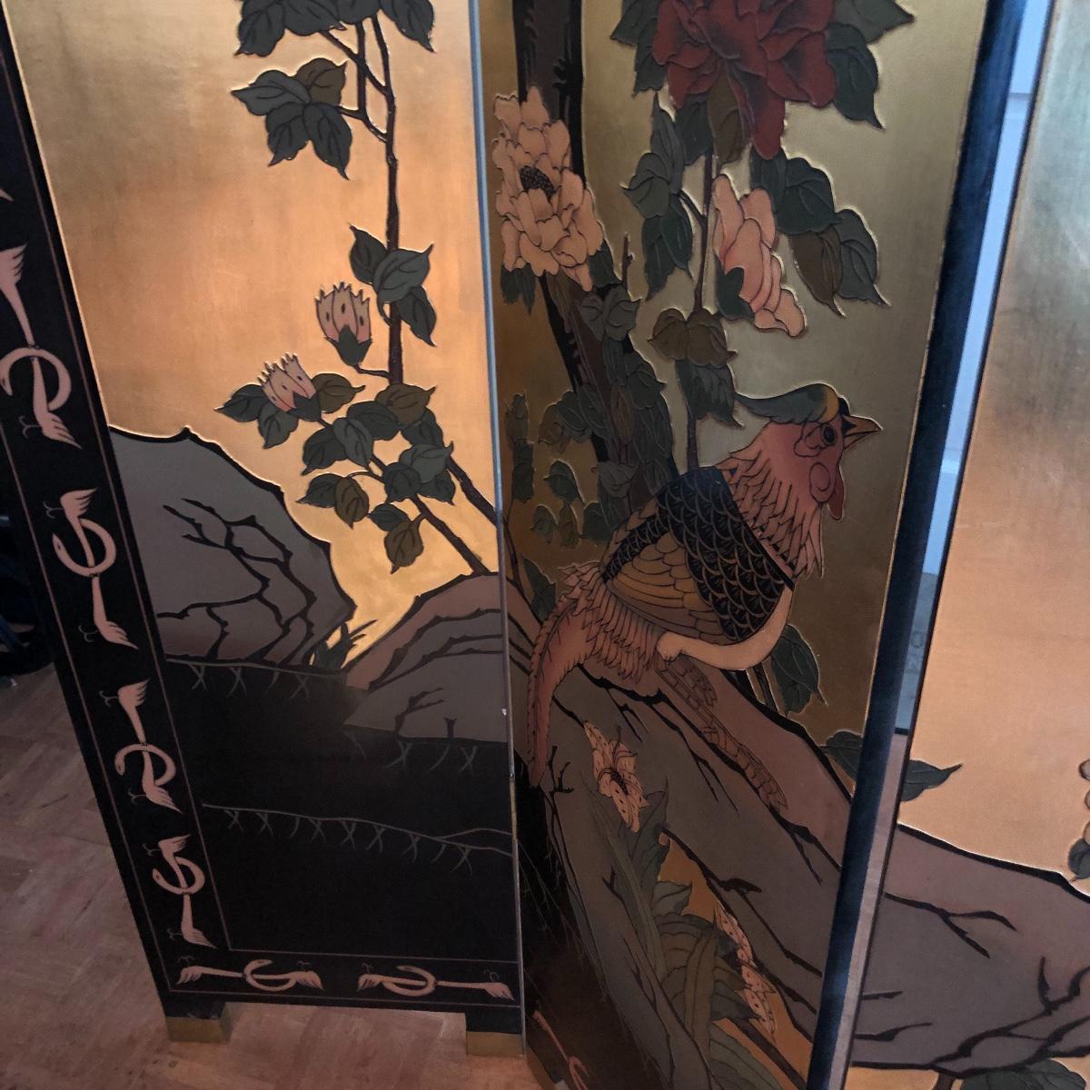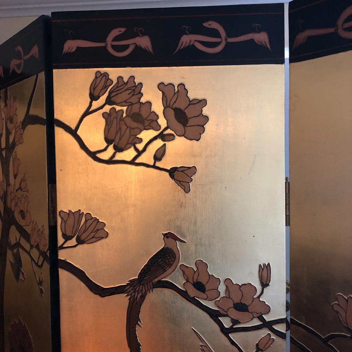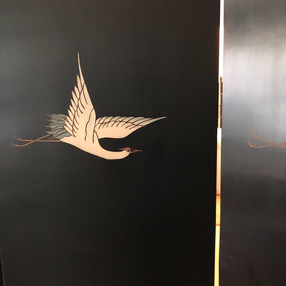 This room screen has four panels and depicts a beautiful outdoor scene with a gold hue as a backdrop. The feet are wrapped in metal. The reverse side features cranes and flowers on a black background with green plants. It has a few nicks on it. It measures approximately 64” x 1” x 72”. Local pick up only.