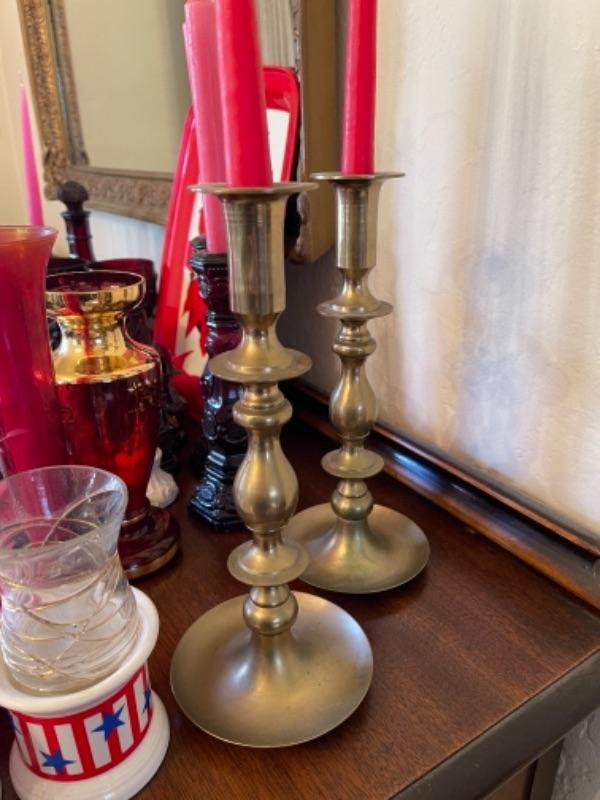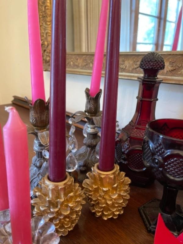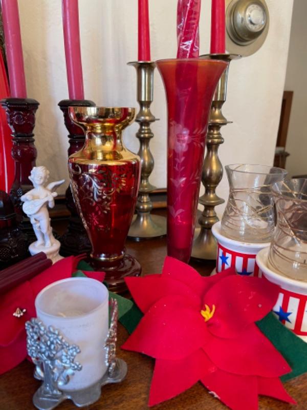 Lot 12. Assortment of Christmas and holiday items, cranberry glass, napkin holders, candlesticks, etc.--$50