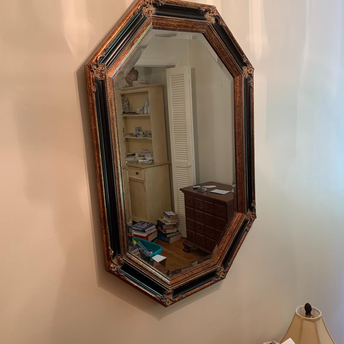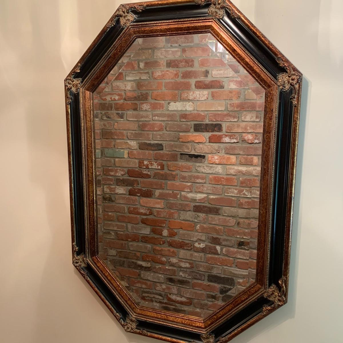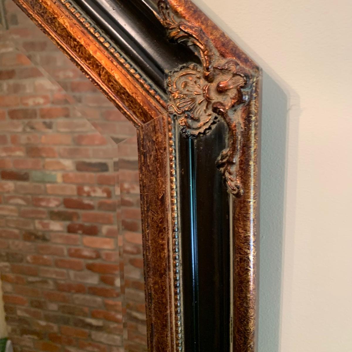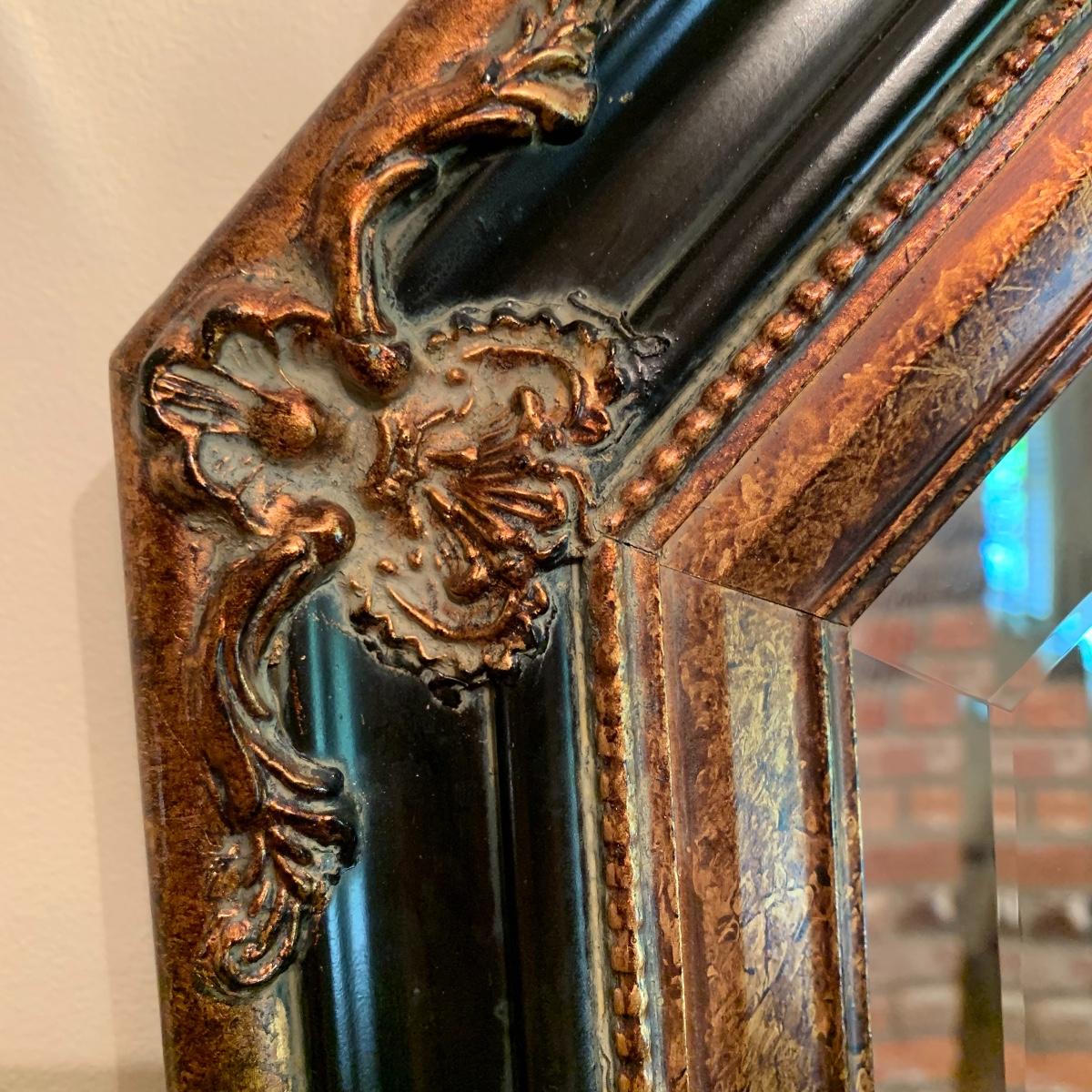 Mirror mirror on the wall, this piece looks great in a bedroom or hall. Featured is this classy mirror housed in a black & bronze frame, with exquisite trim and beveled glass. It measures 38” tall & 26” wide and is in excellent condition. See pics for details