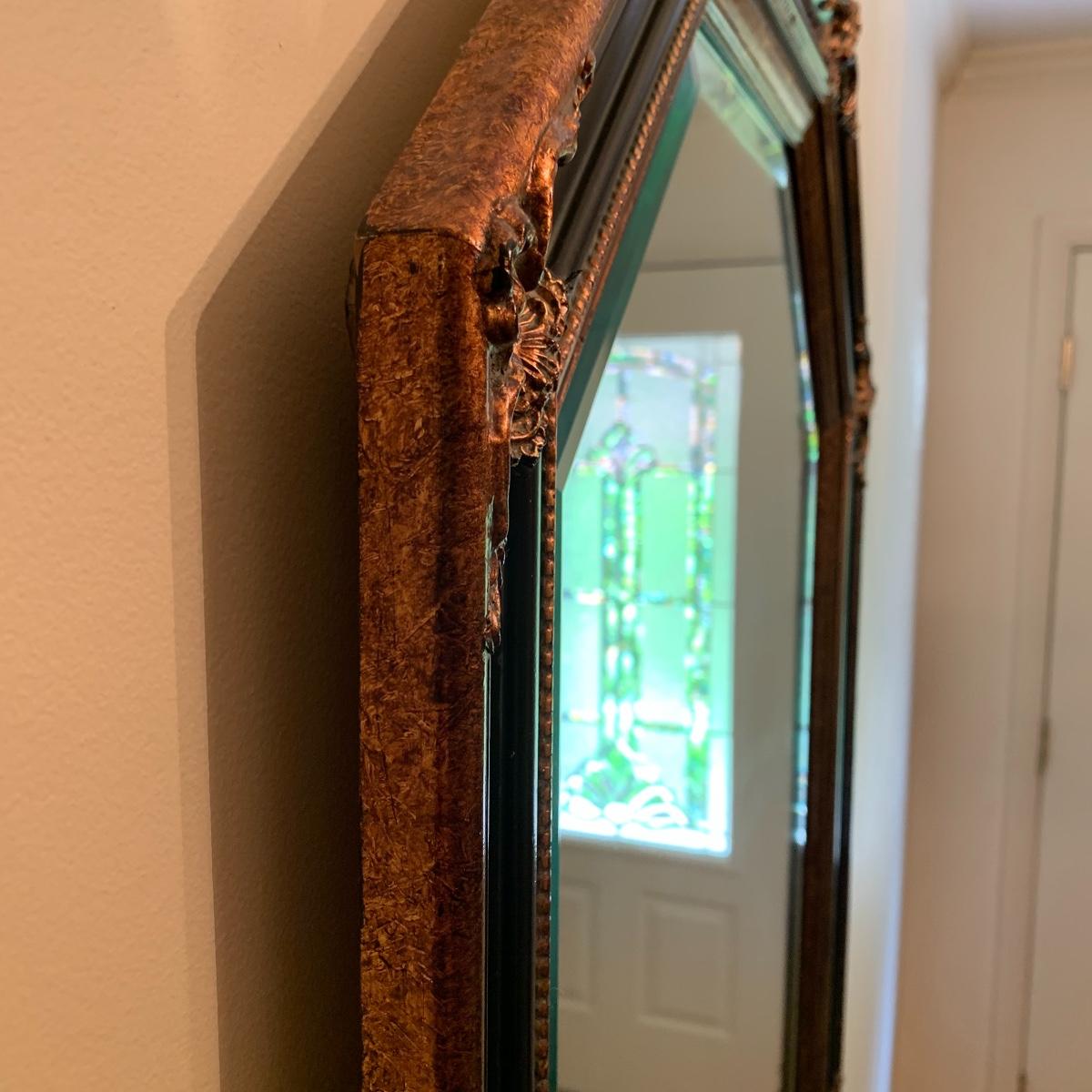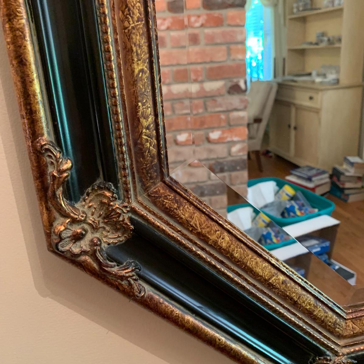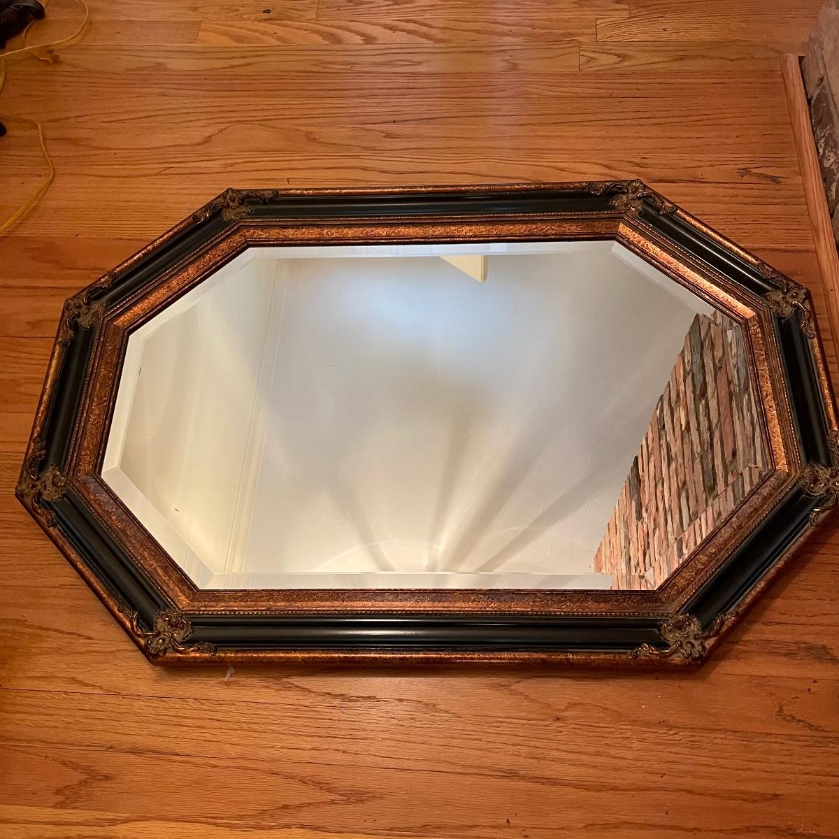 Mirror mirror on the wall, this piece looks great in a bedroom or hall. Featured is this classy mirror housed in a black & bronze frame, with exquisite trim and beveled glass. It measures 38” tall & 26” wide and is in excellent condition. See pics for details