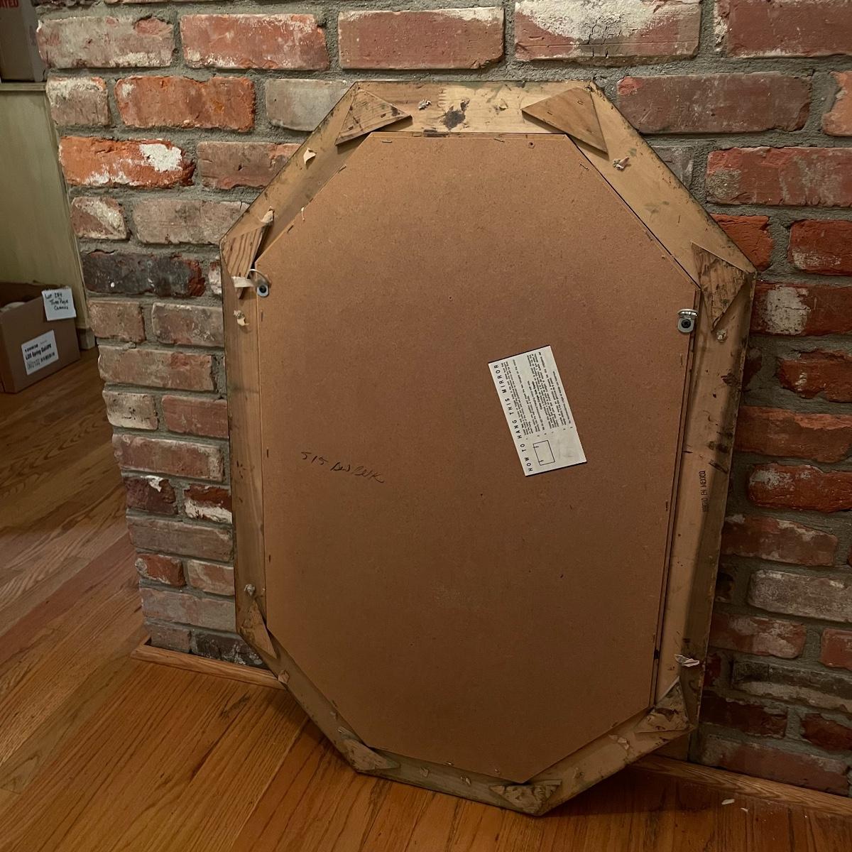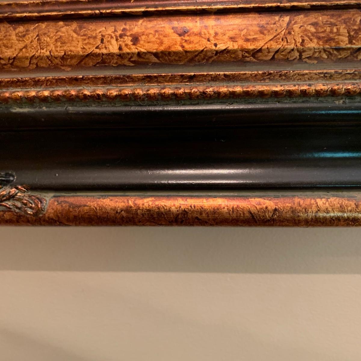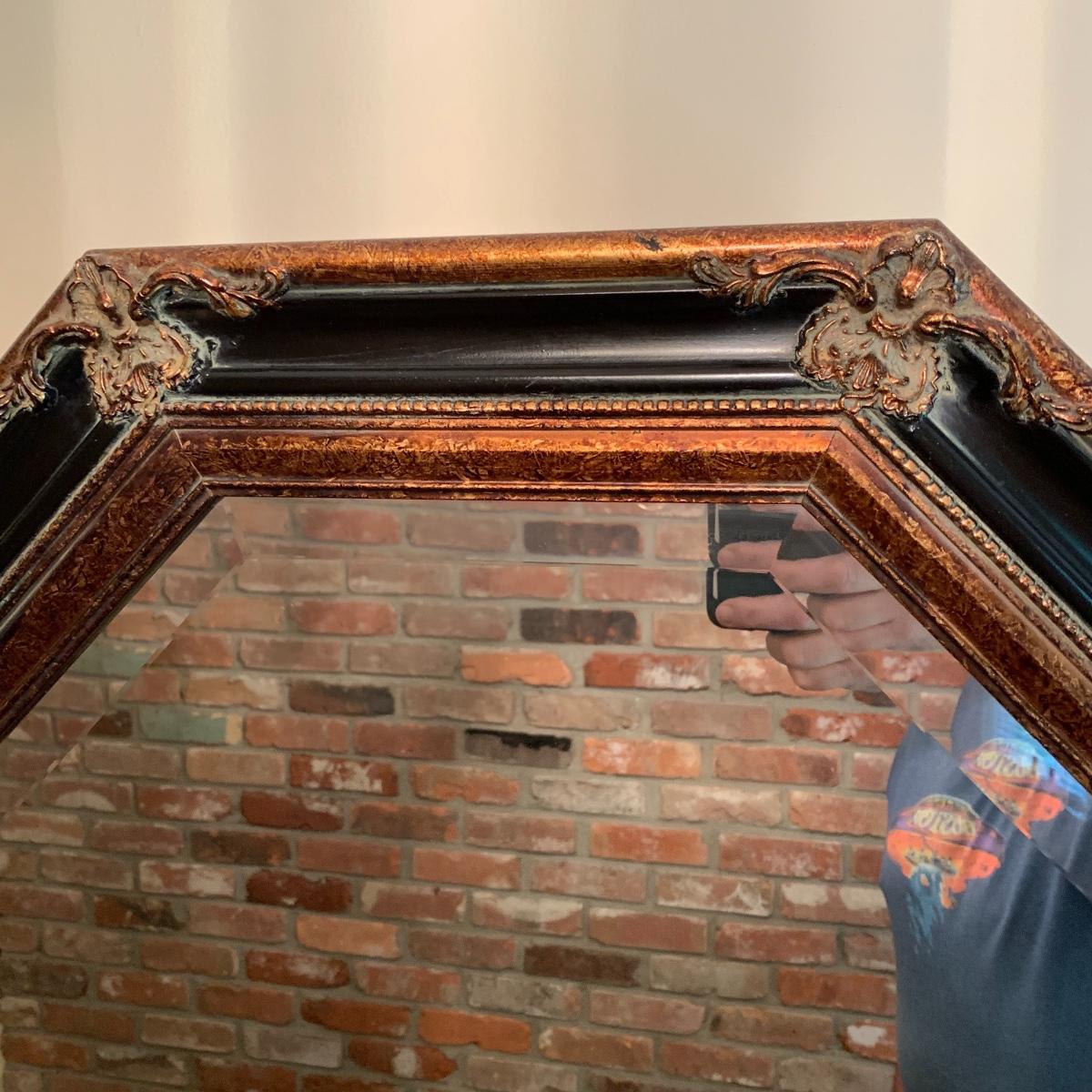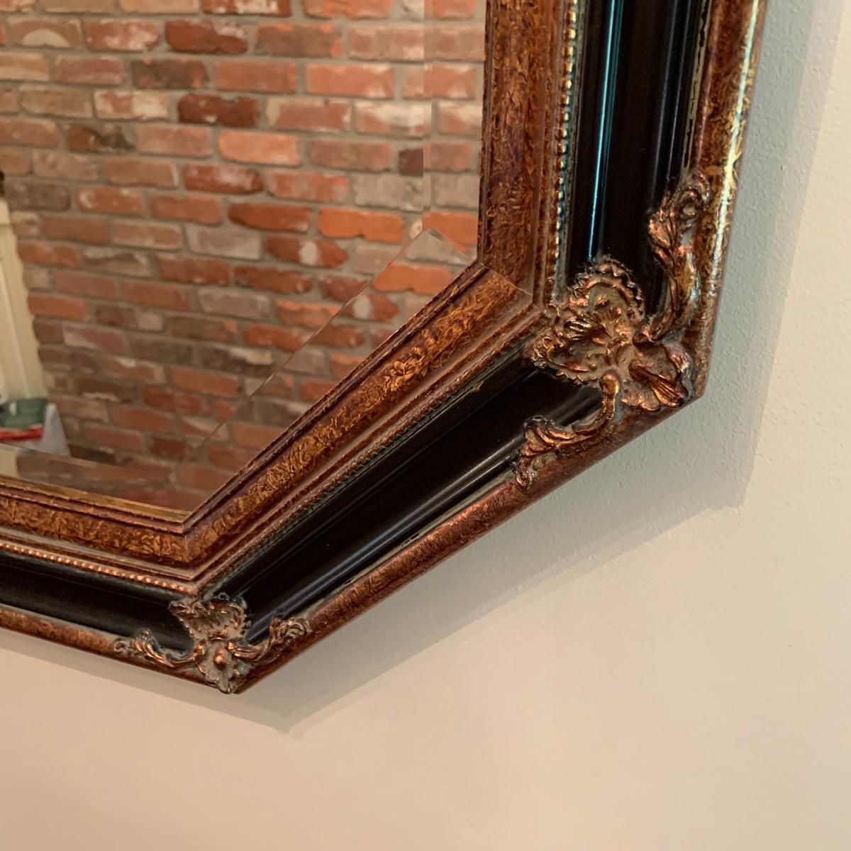 Mirror mirror on the wall, this piece looks great in a bedroom or hall. Featured is this classy mirror housed in a black & bronze frame, with exquisite trim and beveled glass. It measures 38” tall & 26” wide and is in excellent condition. See pics for details