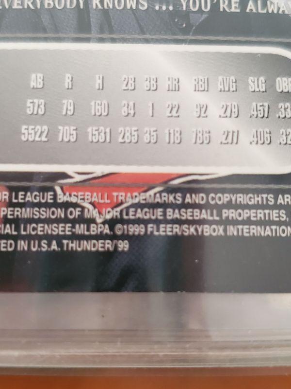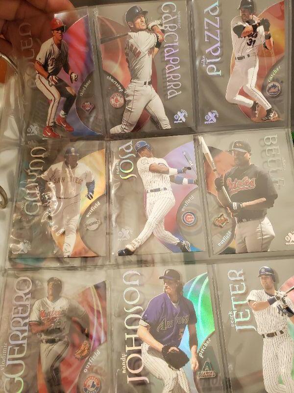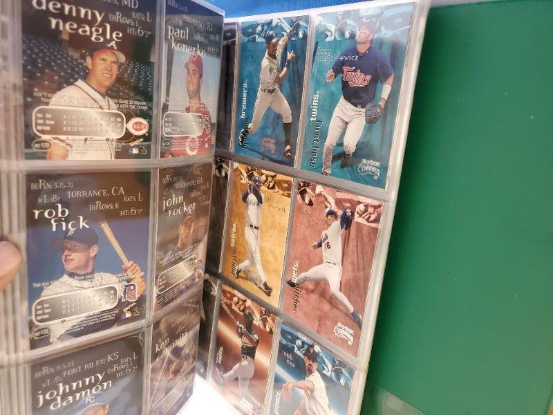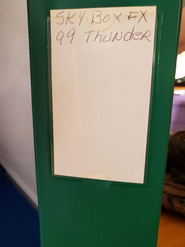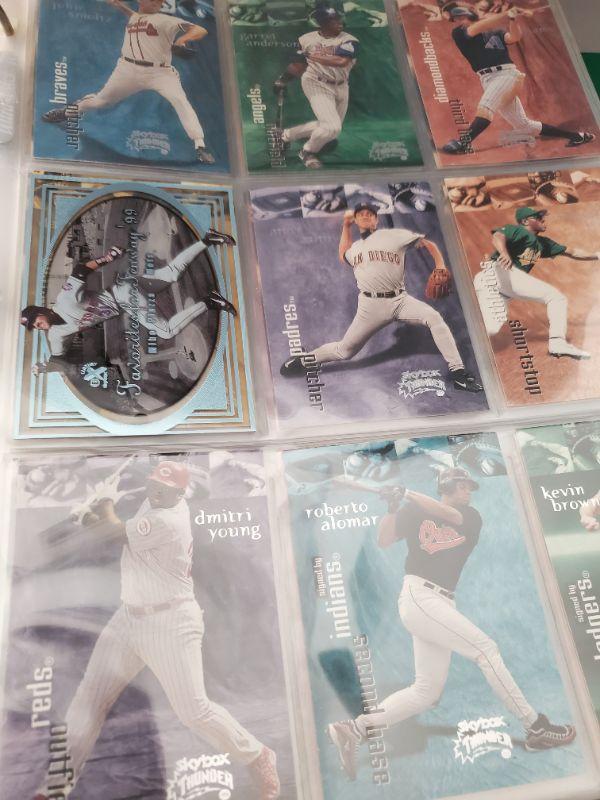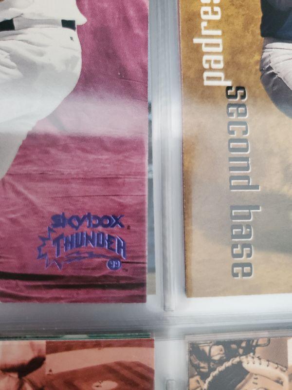 There are a variety of cards in this binder. Some are clear plastic 1999 Century Skybox Baseball Cards, The majority of the binder is 1999 Skybox Thunder Baseball Cards,