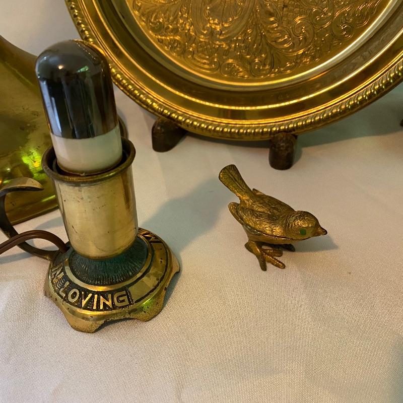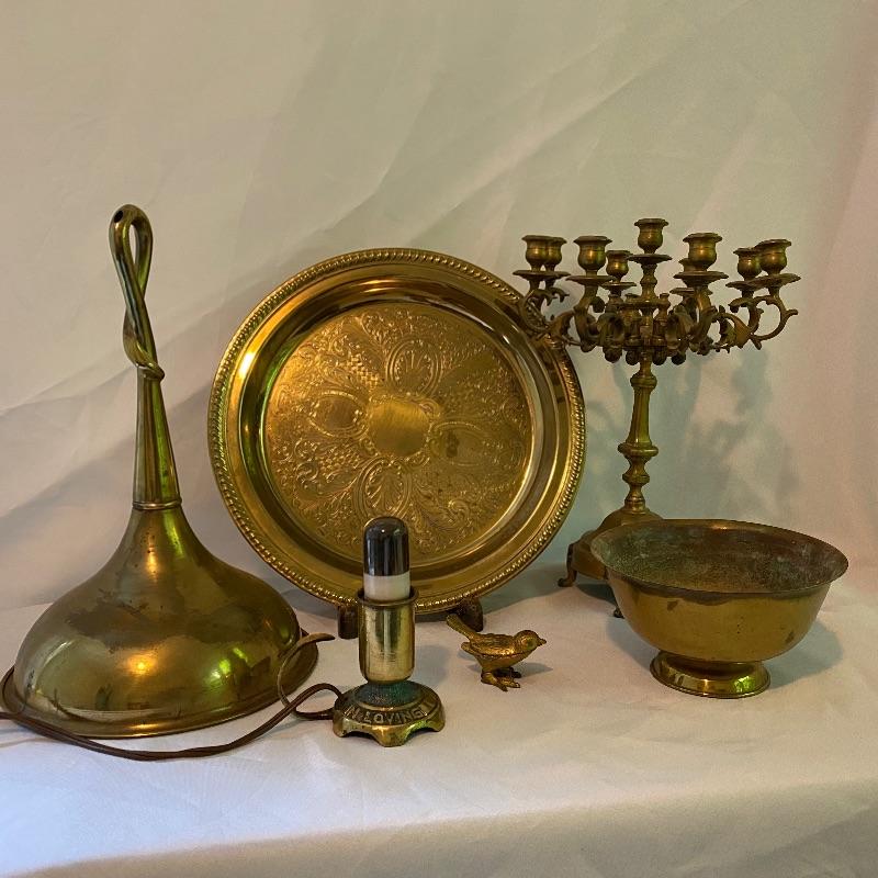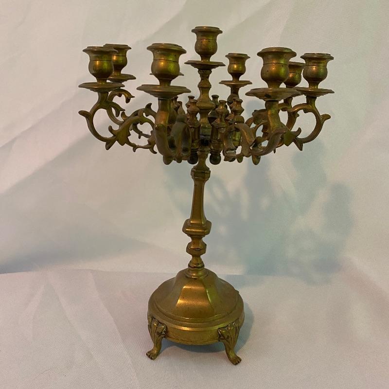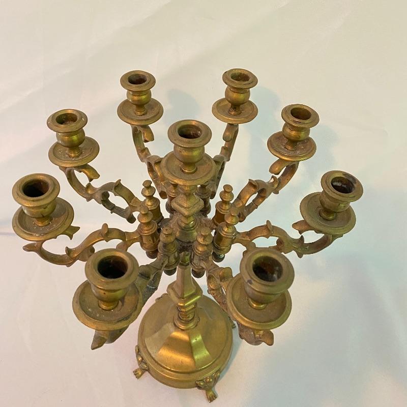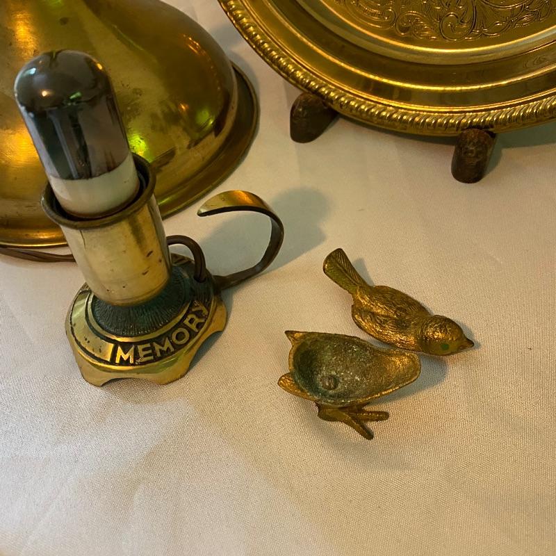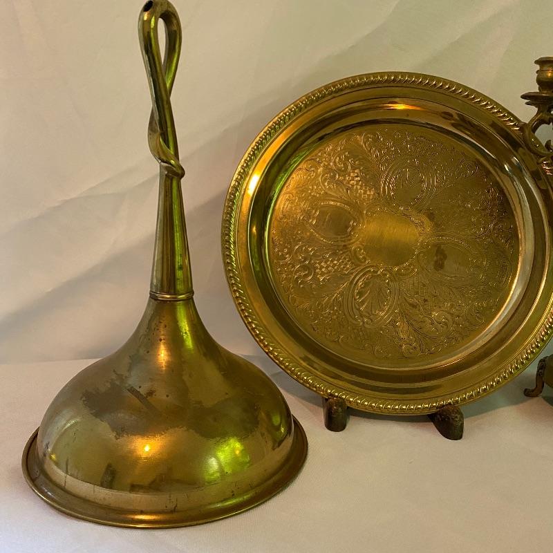 Brass lot with a nice heavy 9 candle footed candelabra with adjustable brackets that measures 12” tall. Also has a 12” tray, small bowl, cute bird box (3”x2”), “In loving memory” electric candle and something that looks like a horn but may be a light fixture needing a cord? Shipping available.