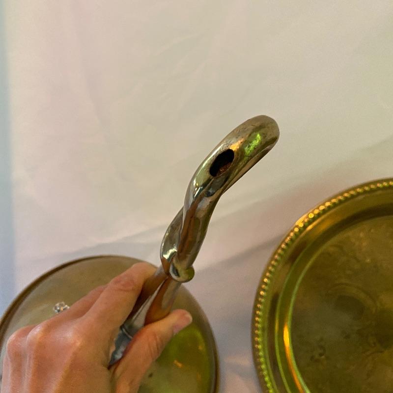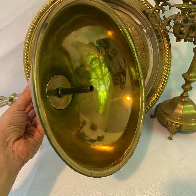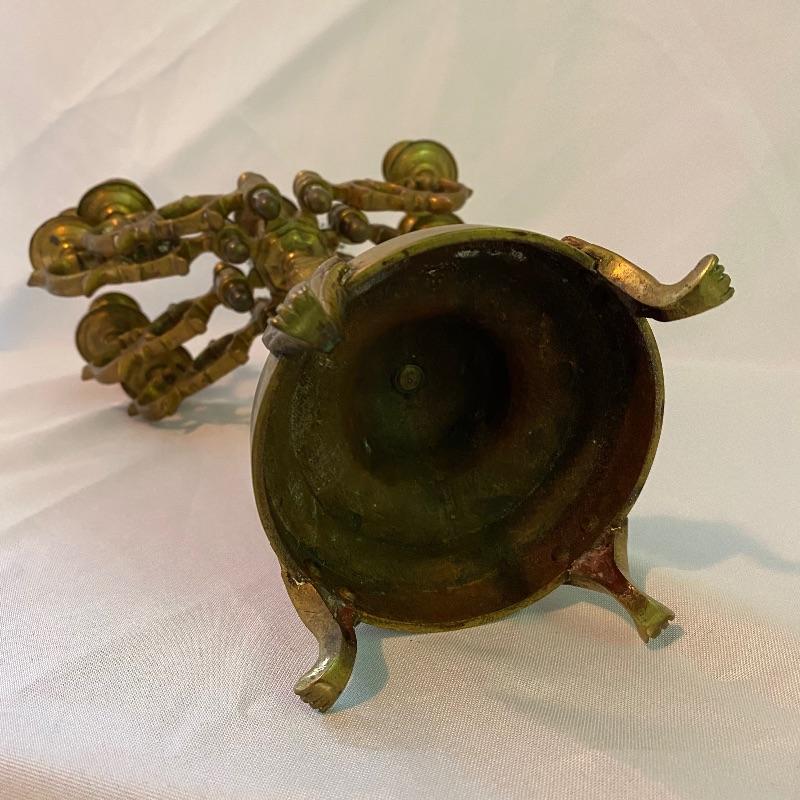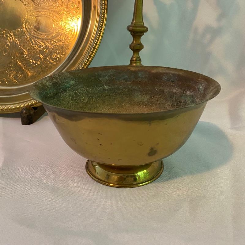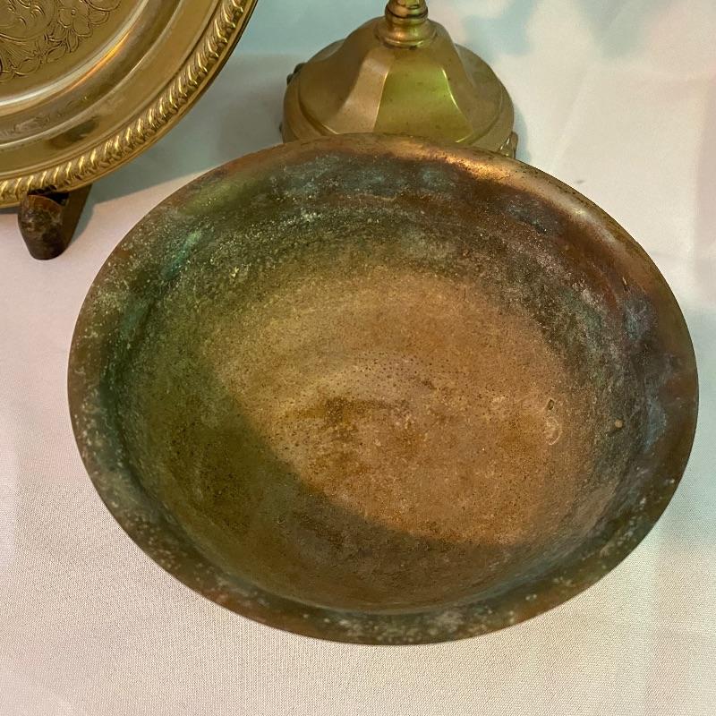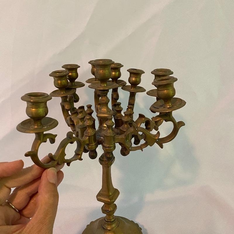 Brass lot with a nice heavy 9 candle footed candelabra with adjustable brackets that measures 12” tall. Also has a 12” tray, small bowl, cute bird box (3”x2”), “In loving memory” electric candle and something that looks like a horn but may be a light fixture needing a cord? Shipping available.