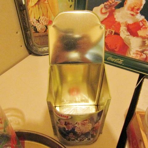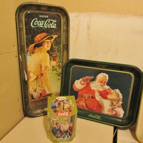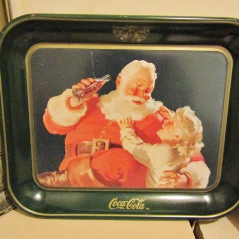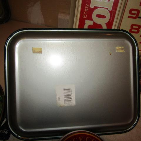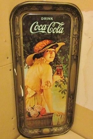 VINTAGE TRAY WITH LADY DRINKING A COKE. A FEW DRIPS OF PAINT HAVE LANDED ON THIS BEAUTY BUT CAN EASILY BE REMOVED 8.5" X 19"