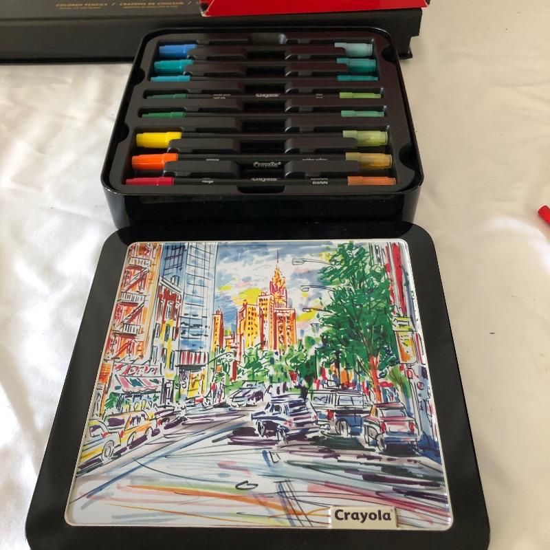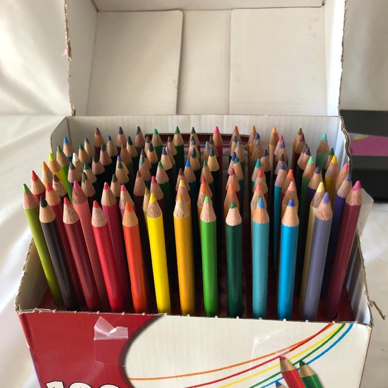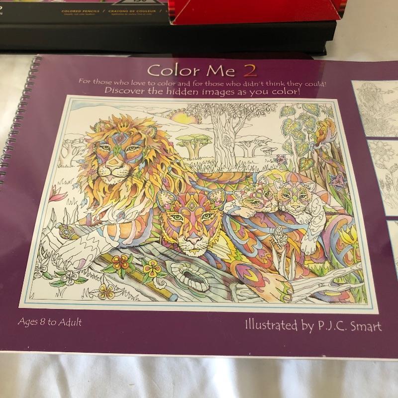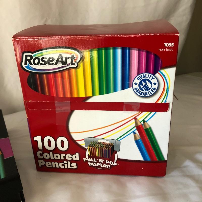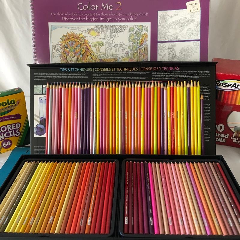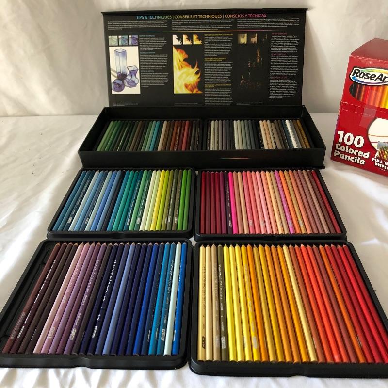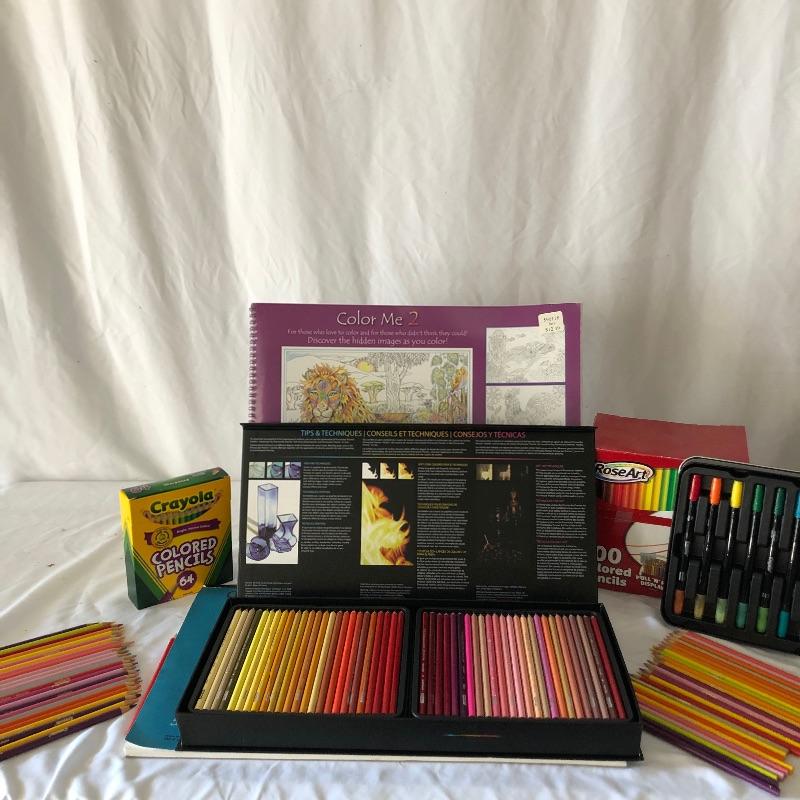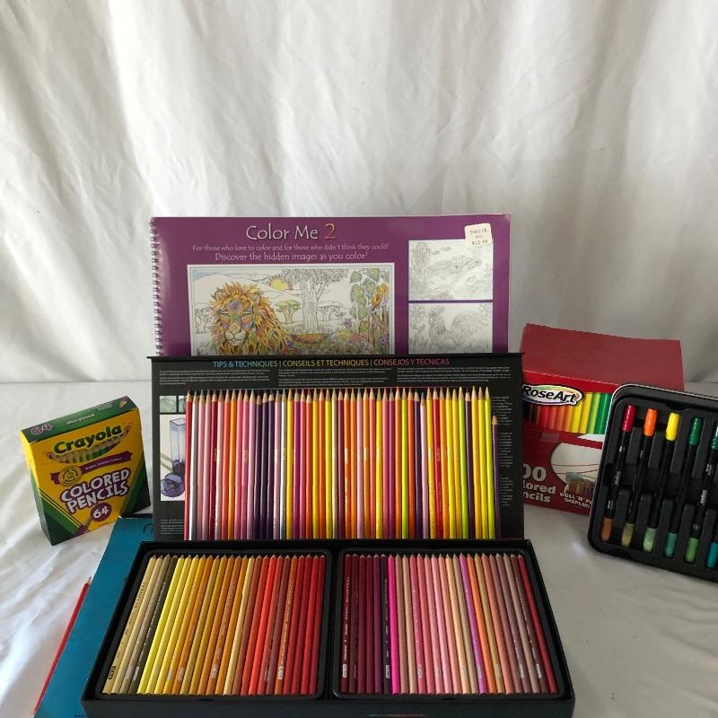 Wow this large lot has a mountain of color pencils in every shade of color imaginable! The Prismacolor set alone has 150 and there are lots more, see images. Also included is a Crayola set of pens, a sketch pad and and a coloring book.