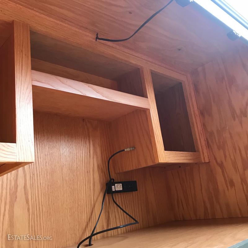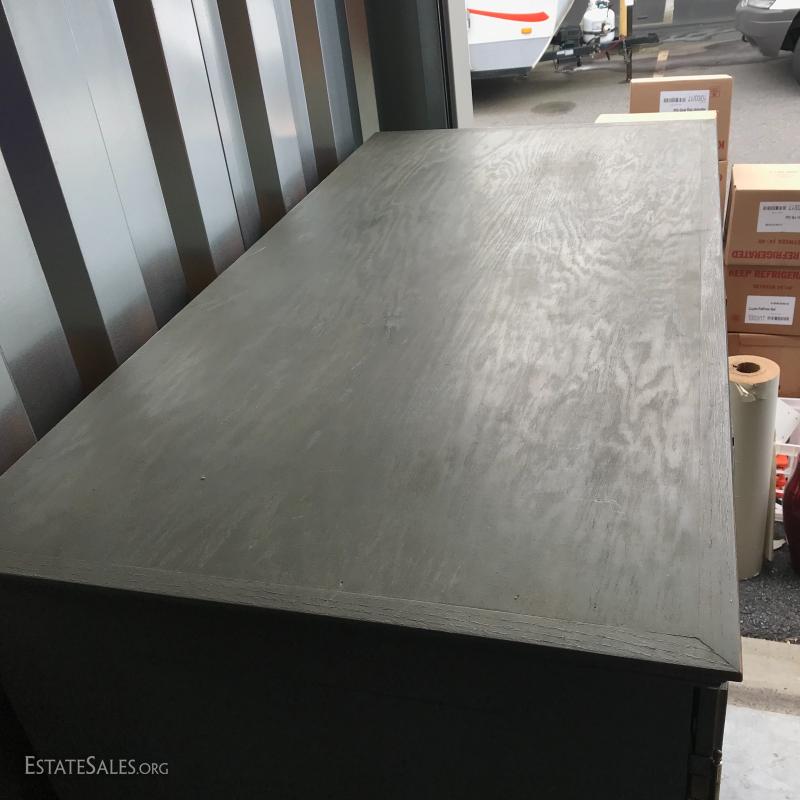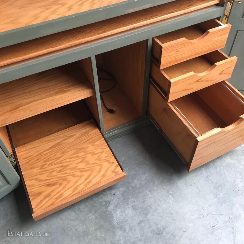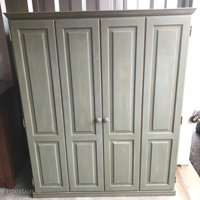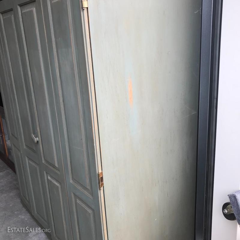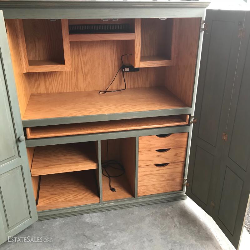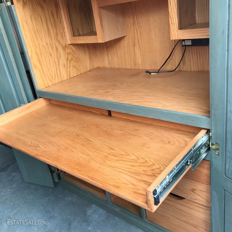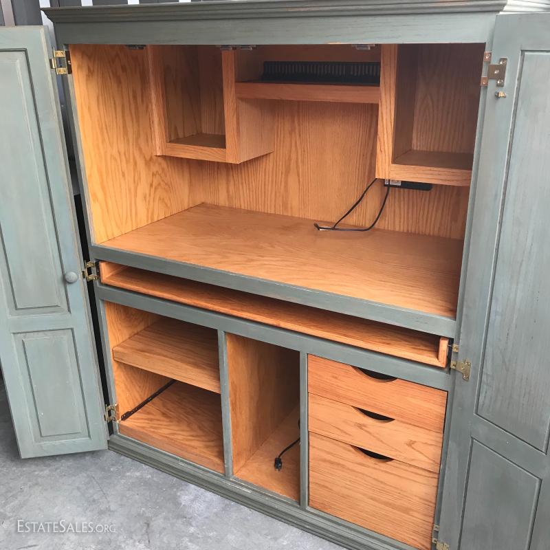 Large green-hued cabinet made for a computer work station, but could be used as a bar or for storage. Solid wood hardware. Measures 50” x 25” x 60”. This is a substantial piece and you will need help moving it. Lot is only available for local pick up in Asheville, NC.