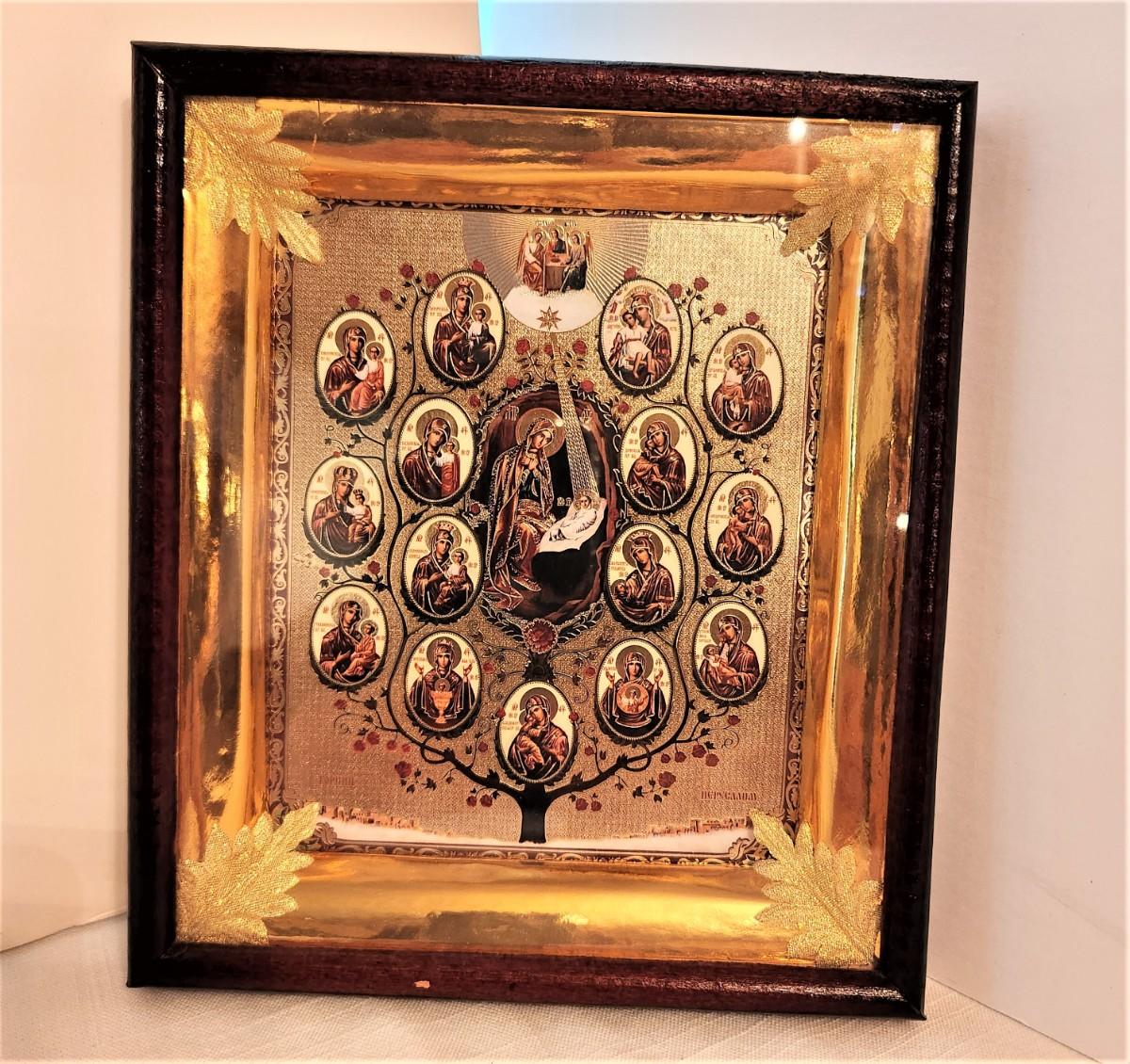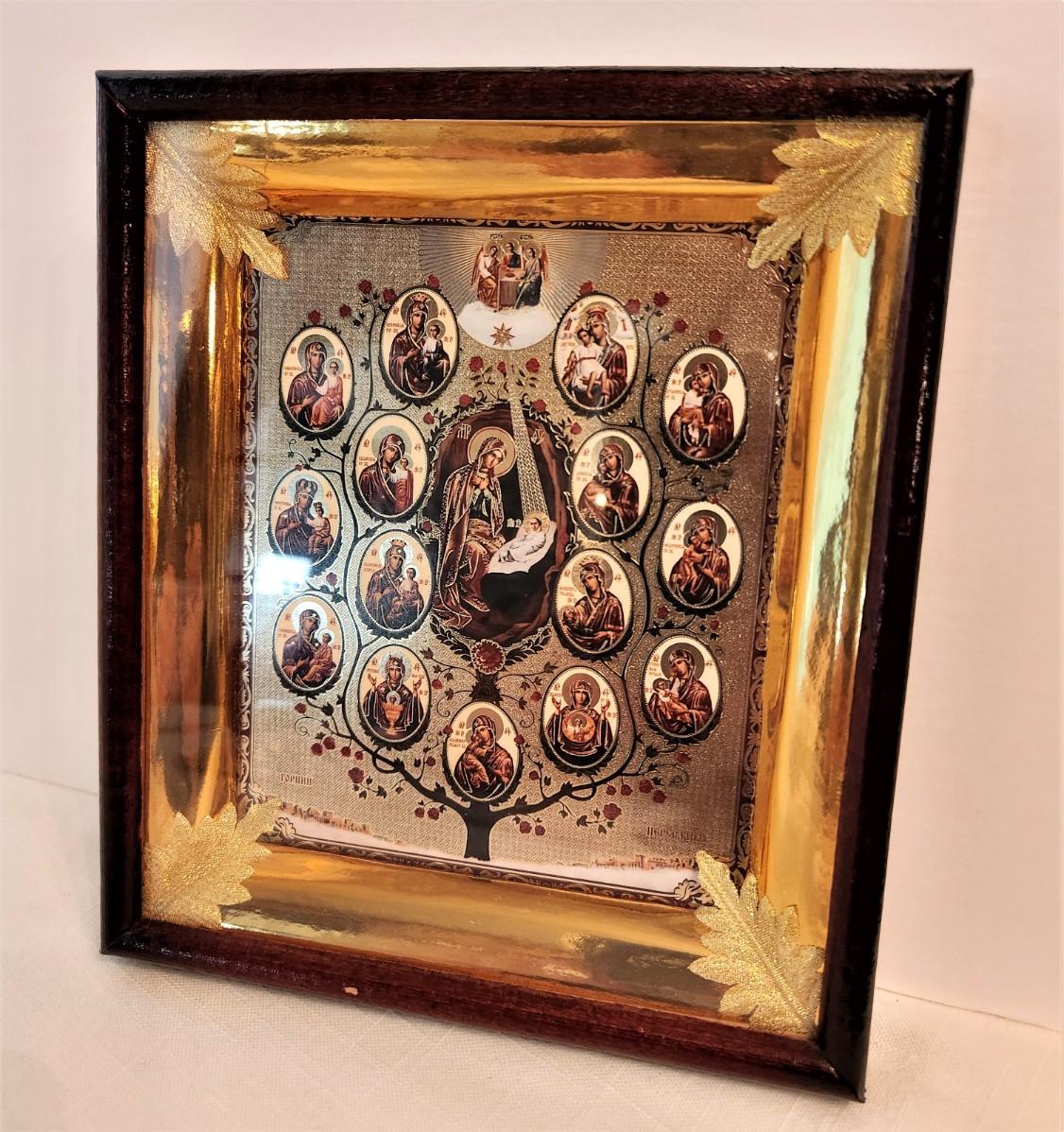 Flashy Contemporary Russian Eastern Orthodox Shadowbox Icon featuring images of the Virgin Mary (Our Lady of Perpetual Help). 7.5" x 8.75" - wooden frame, good condition.