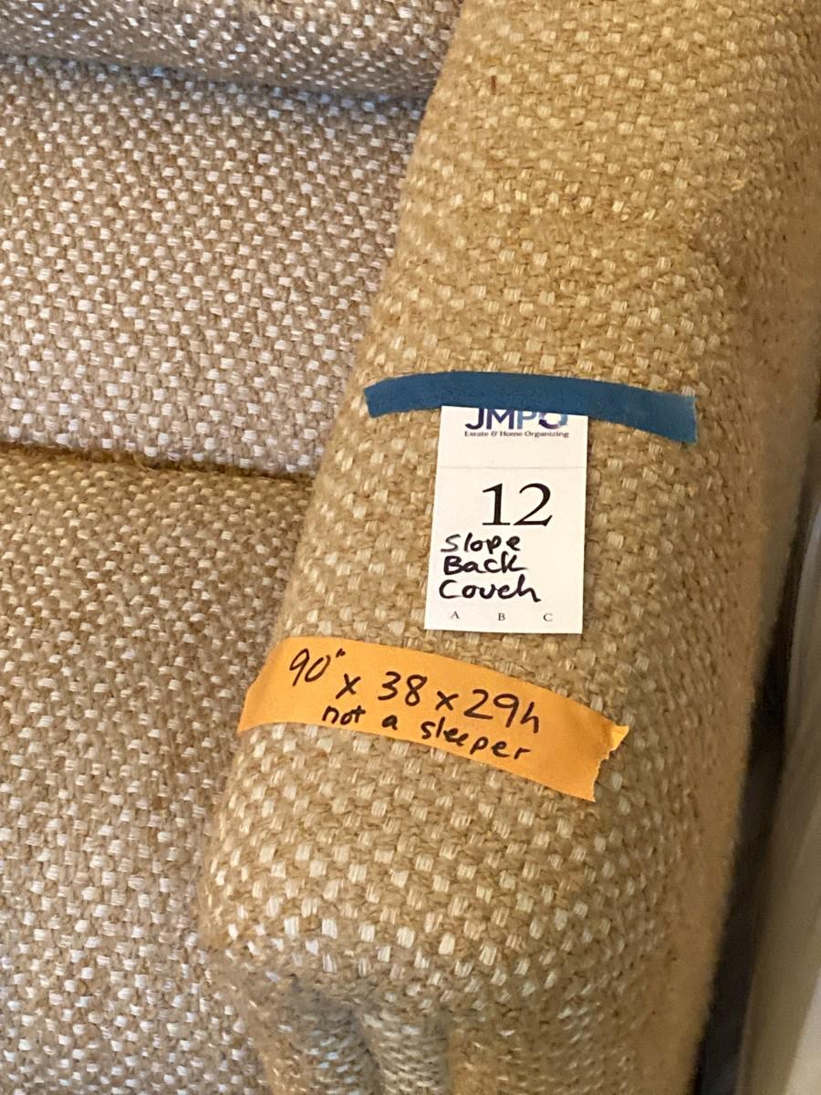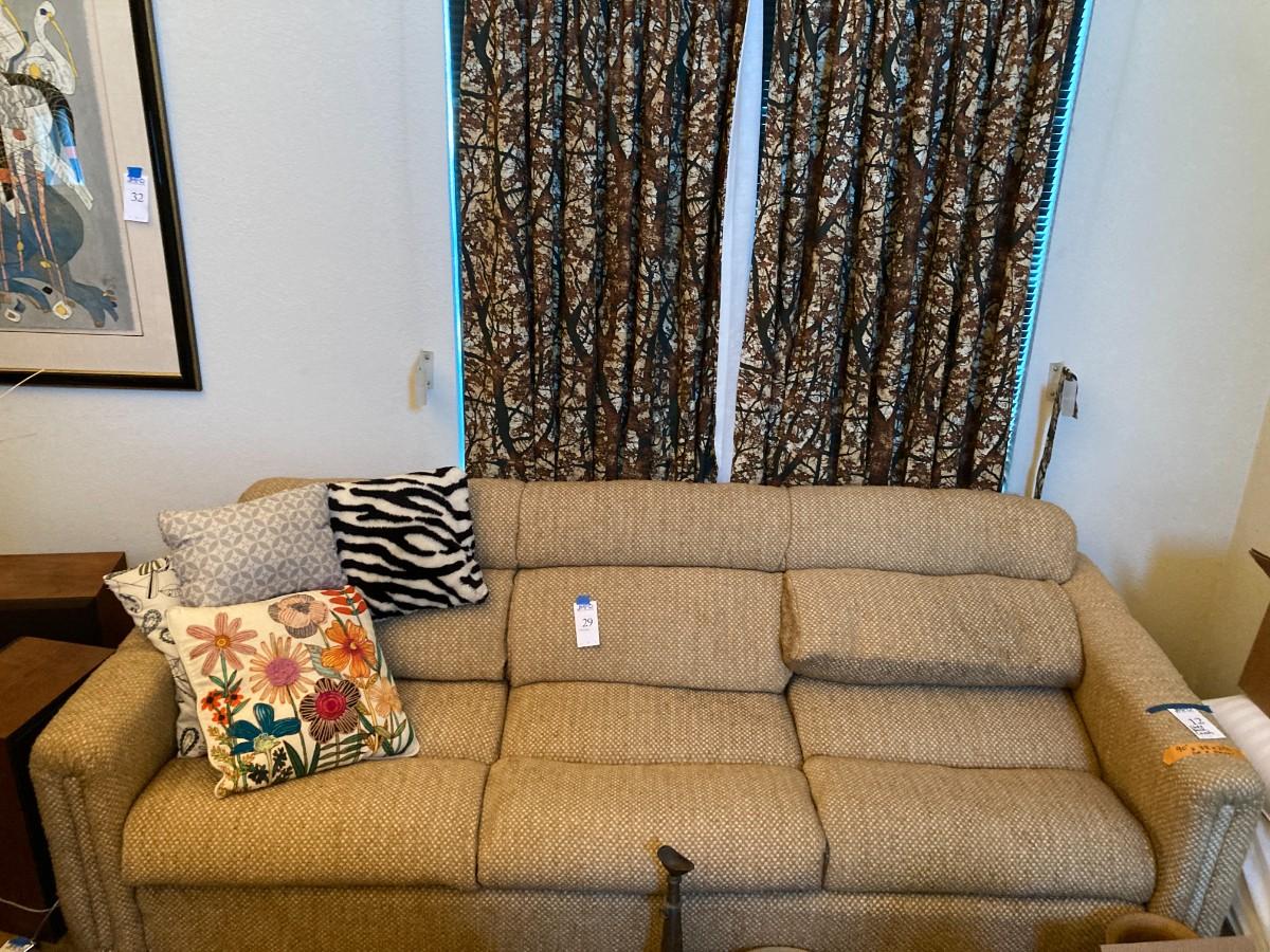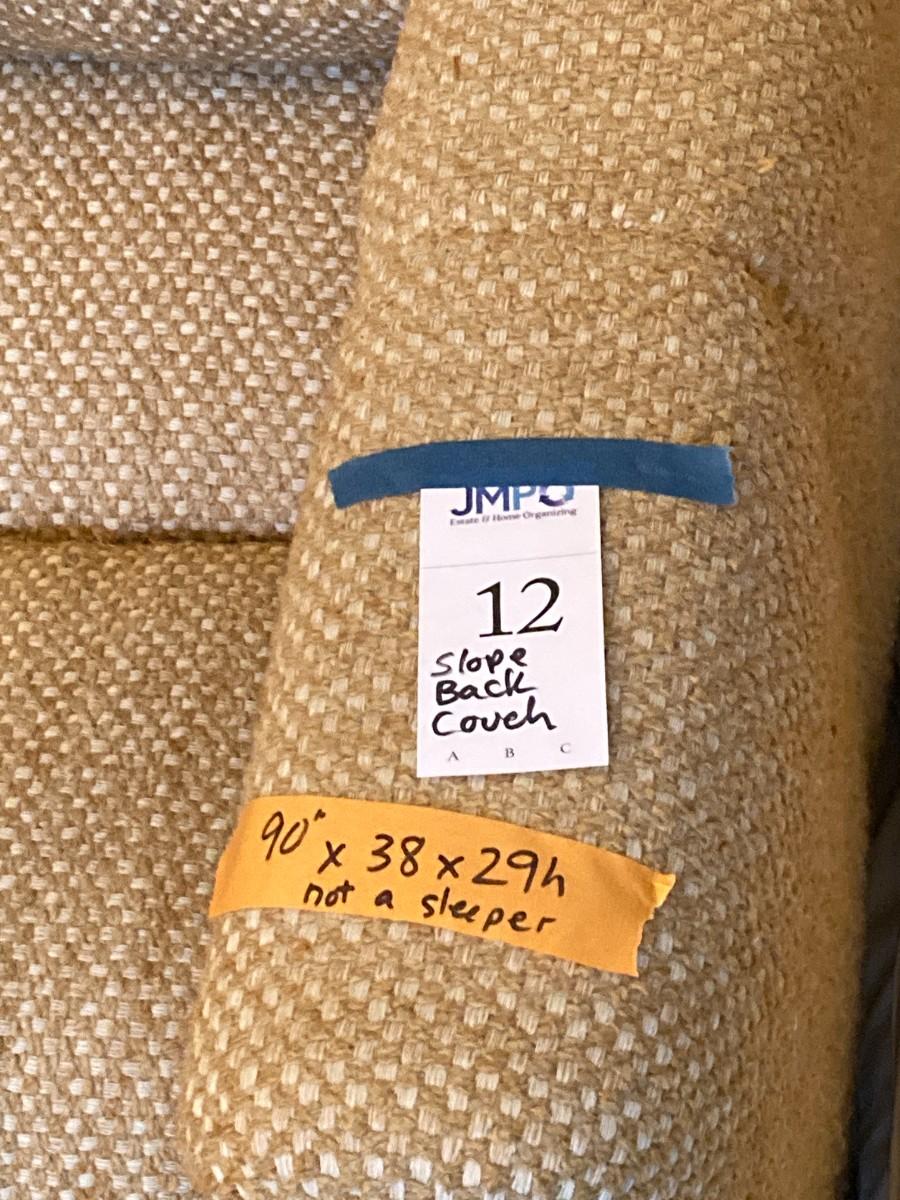 Slope back woven-fabric couch. 90x38x29”. NOT a sleeper. Good fabric condition, no stains noted, no smells.
