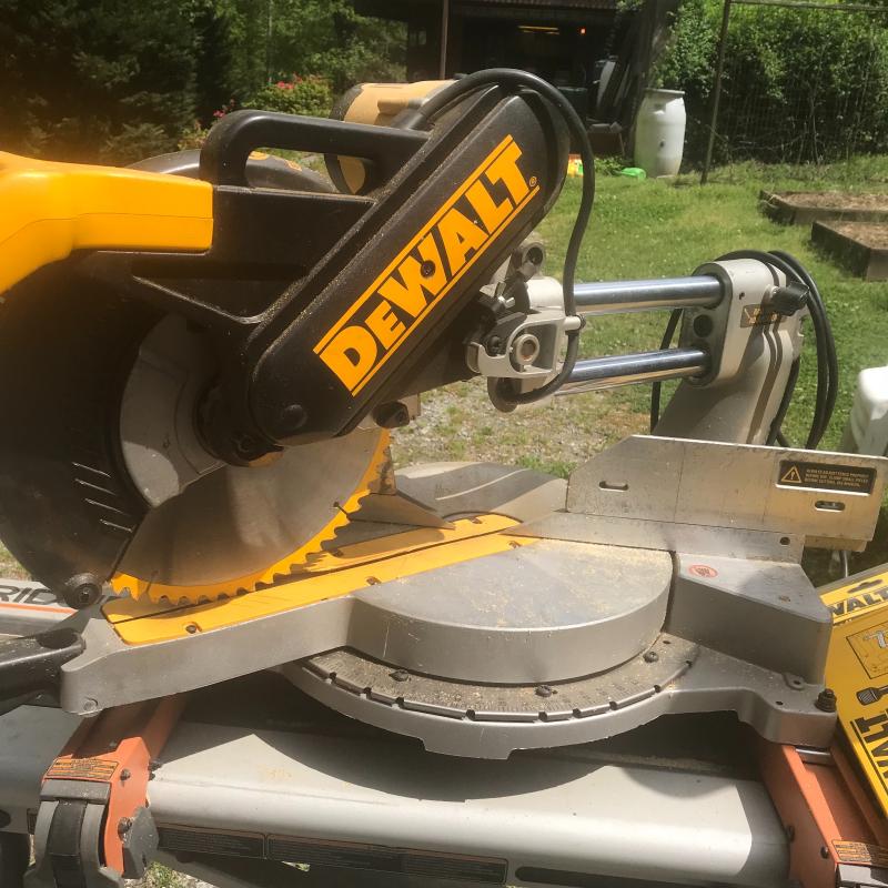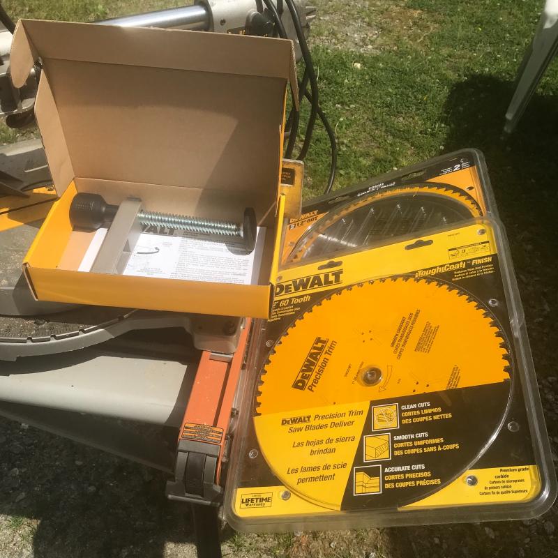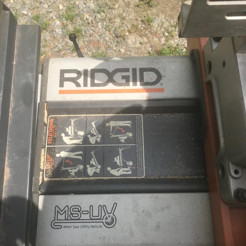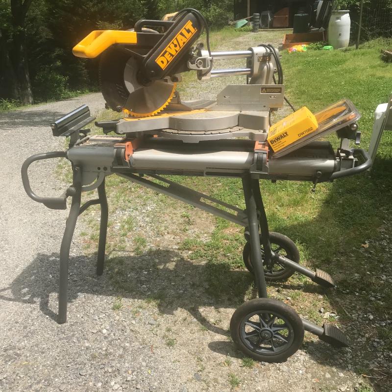 Model DW708 Sliding Miter Saw 12” blade on Ridgid MSUV Stand. Includes two extra saw blades and material clamp. Unit measures 57” x26” x54”. Lot available for local pick up only in Horseshoe, NC.