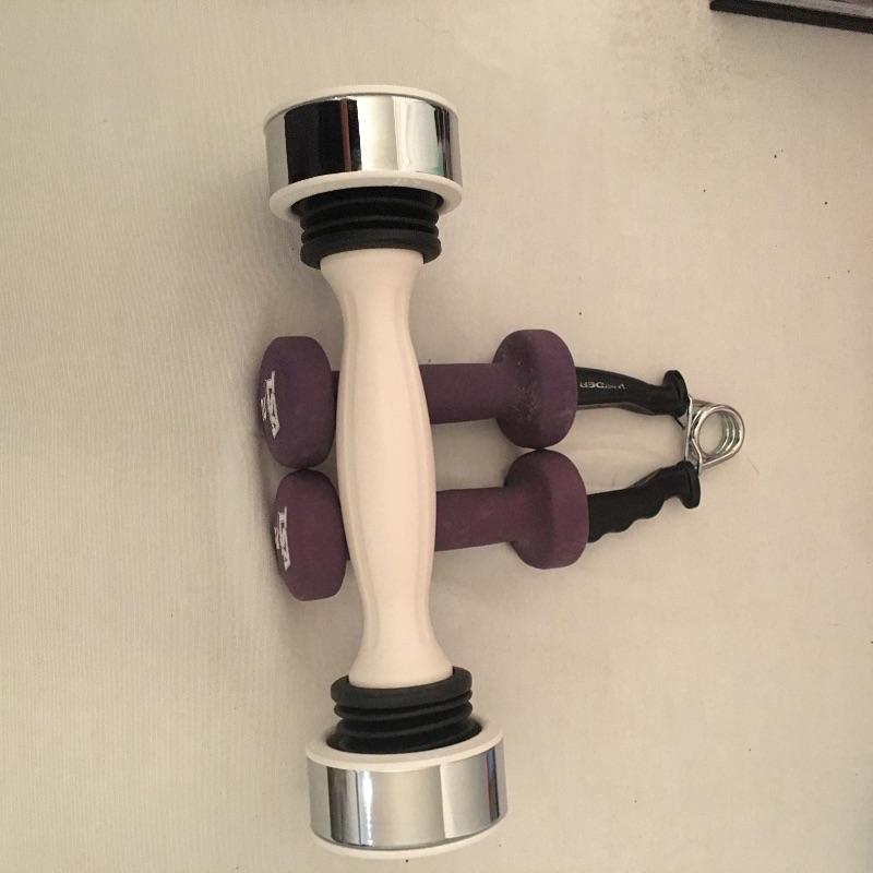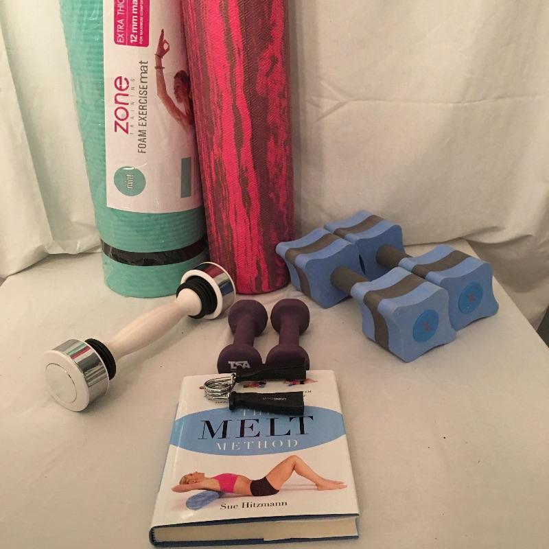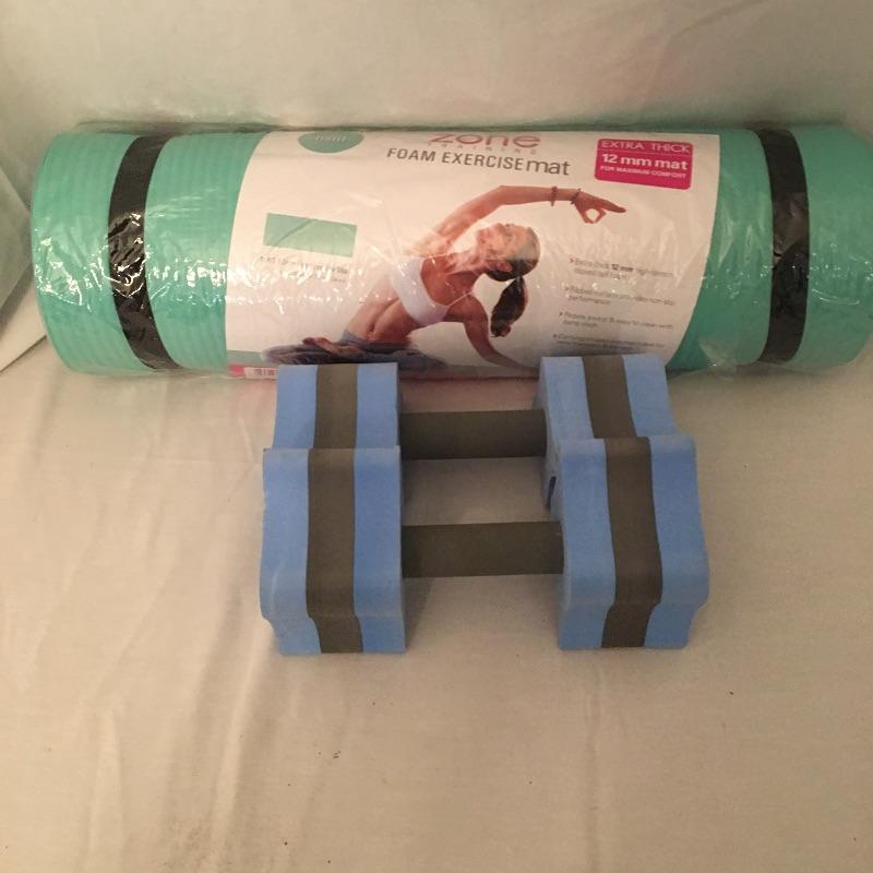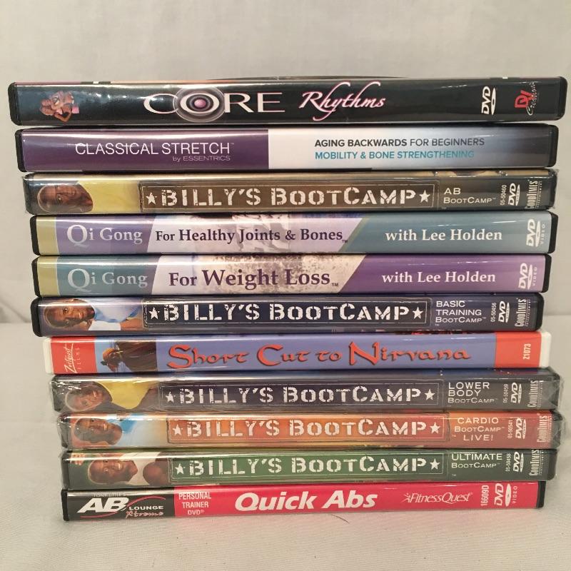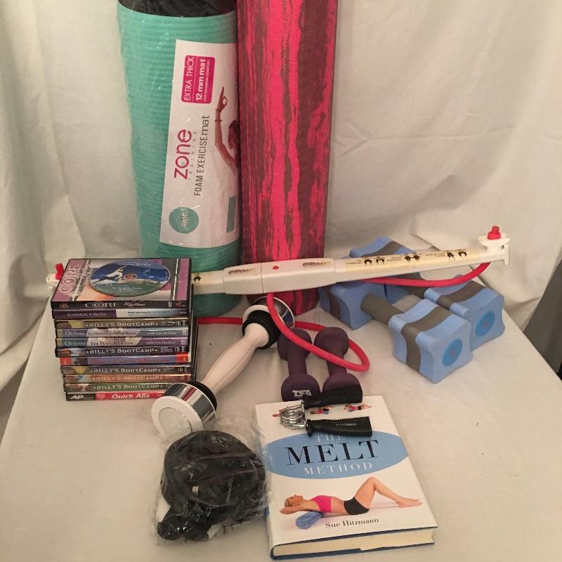 Stay in shape this winter with these exercise essentials that includes two pound dumbbells, shake weight, new in plastic yoga mat, roller, water dumbbells, exercise band and DVDs by Billy Blank, Lee Holden and more.