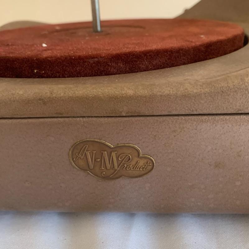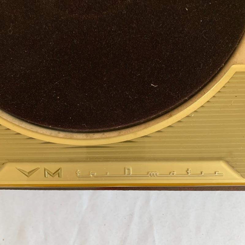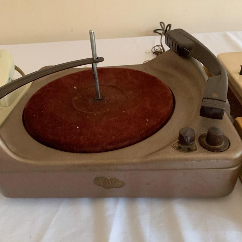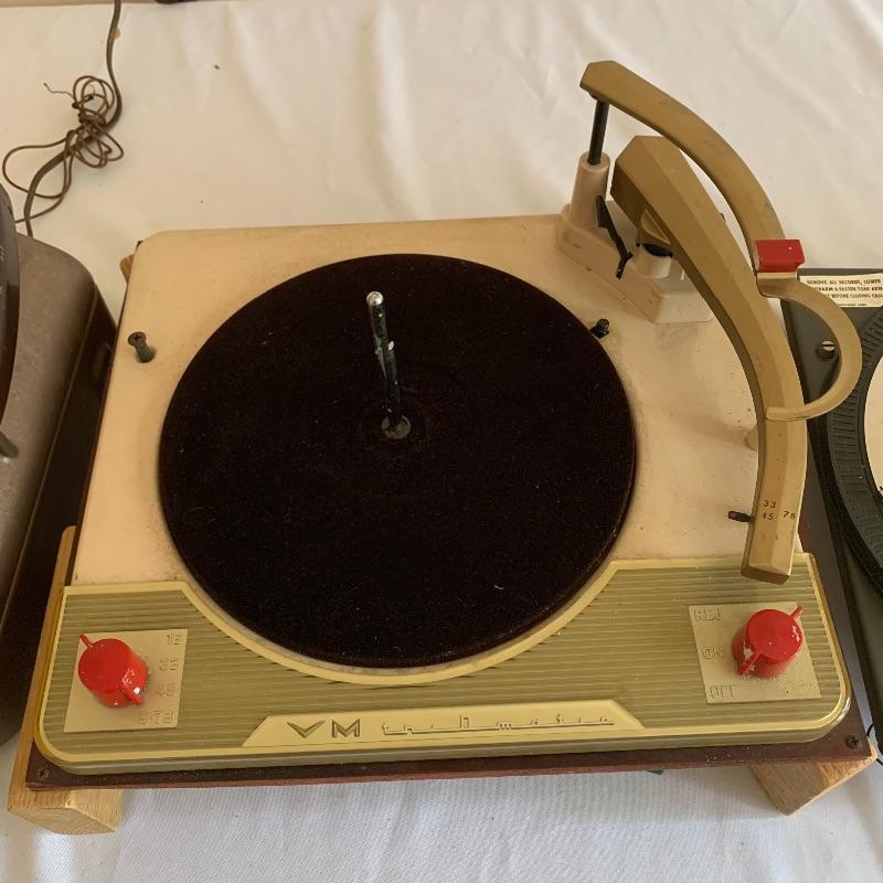 Lot 12 consists of five turntables. The first (far left in pic) G.E.Custom Vacu-magic is missing its base. The second has a front badge that reads V.M. product and powered on when tested. The third is a V. M. product as well and is missing its factory base. The fourth is a G.E. model R.D.525-4 and is missing its base. The last (right in pic) is marked with a V.M. tri-o-magic 972 and comes with the original store paper turntable cover.