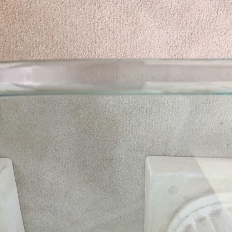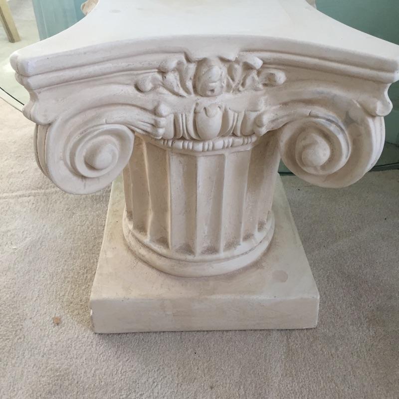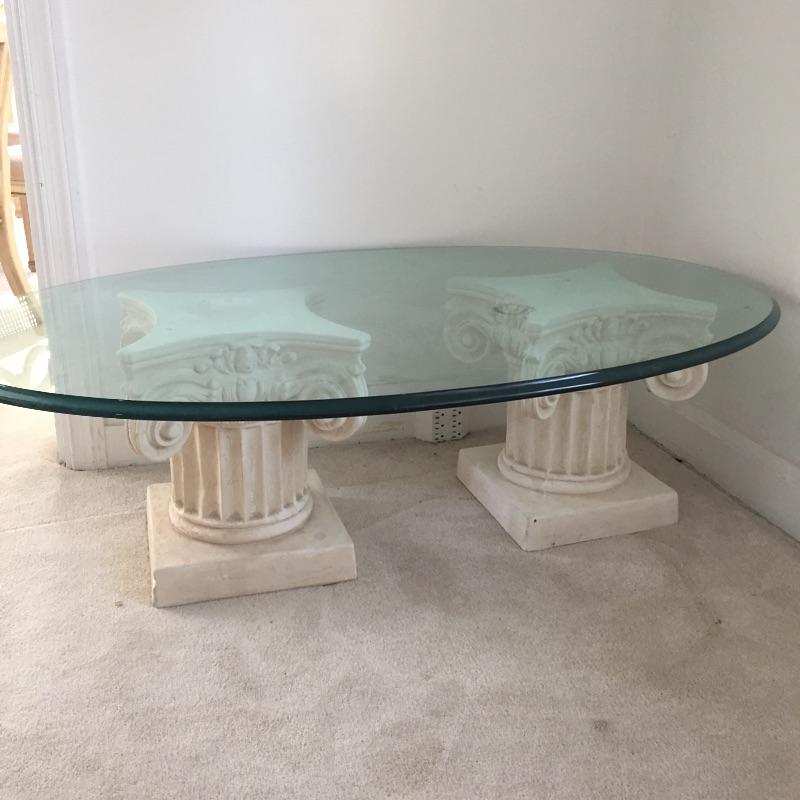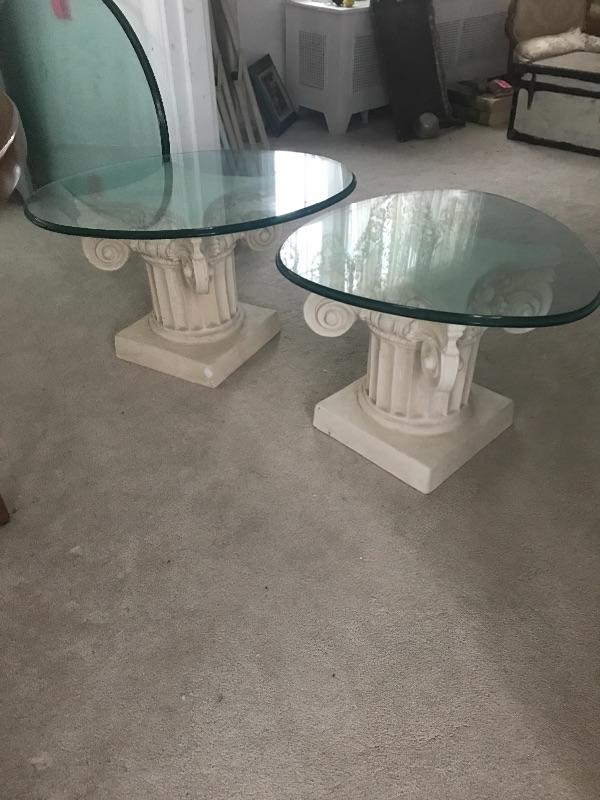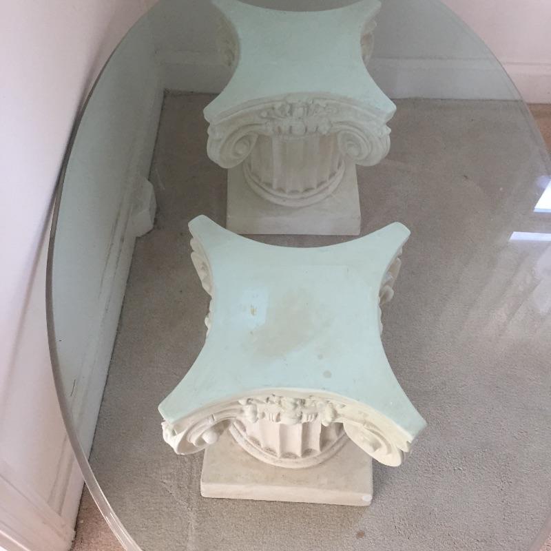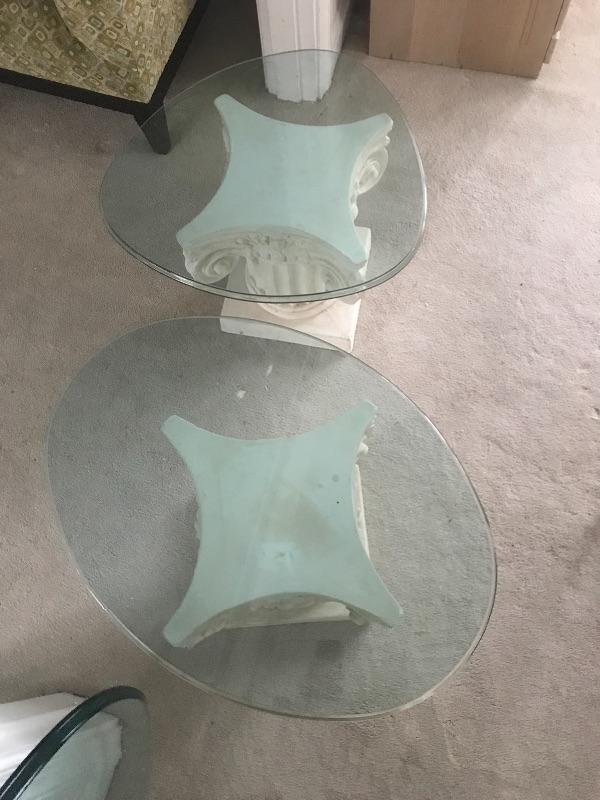 Glass top coffee table on a pair of pedestals and two extra glass tops. Large glass Table piece measures 32” x 51” x 17”. Alternatively there are two small glass tops that allow you to have two small side tables. One is oval measuring 29.5” x21.5” and the other is a rounded triangle with a diameter of about 23”. Bring Help to load Glass is very heavy. Pillars are not as heavy and a sort of limestone resin maybe. See pix.