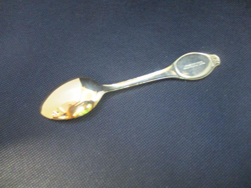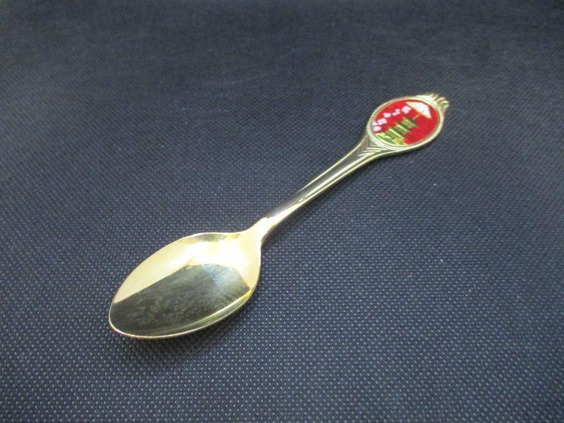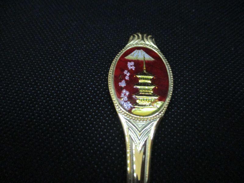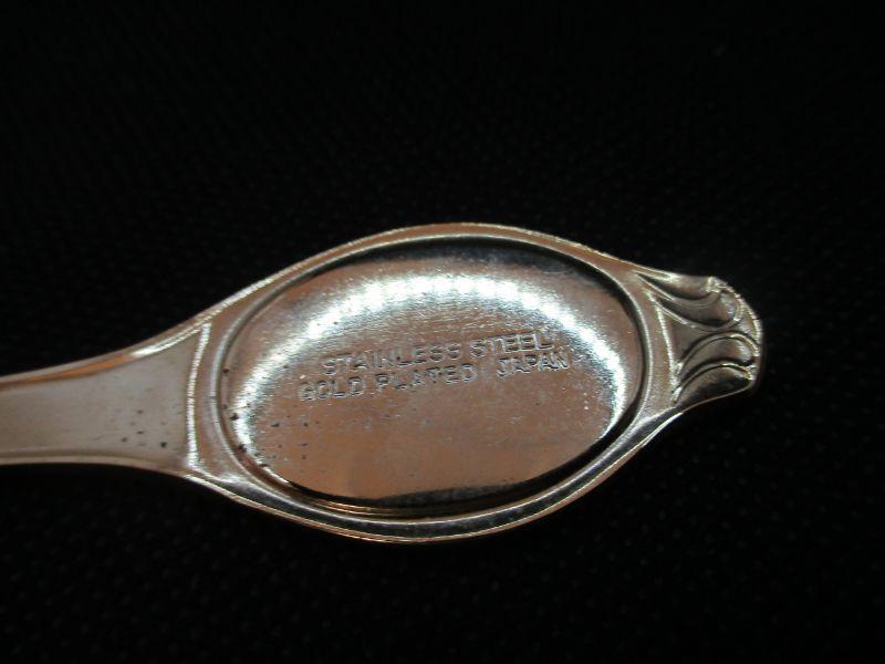 This spoon is in excellent condition with no signs of wear. The scene is of a pagoda in front of a mountain next to cherry blossoms. It is about 5.75" in length and the back is engraved, "Stainless Steel Gold Plated Japan"