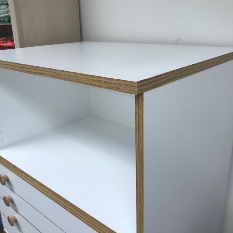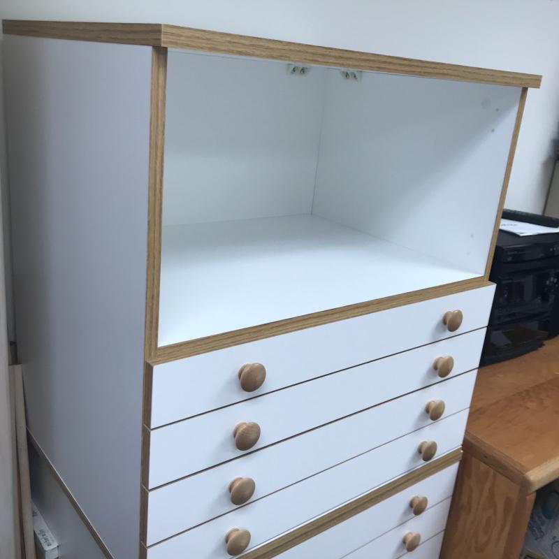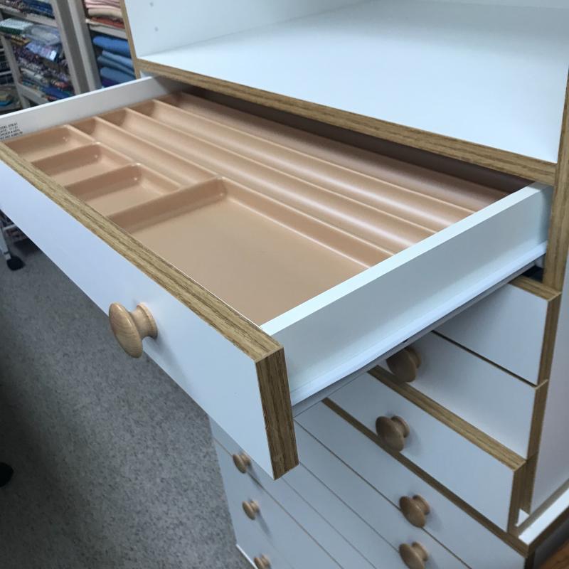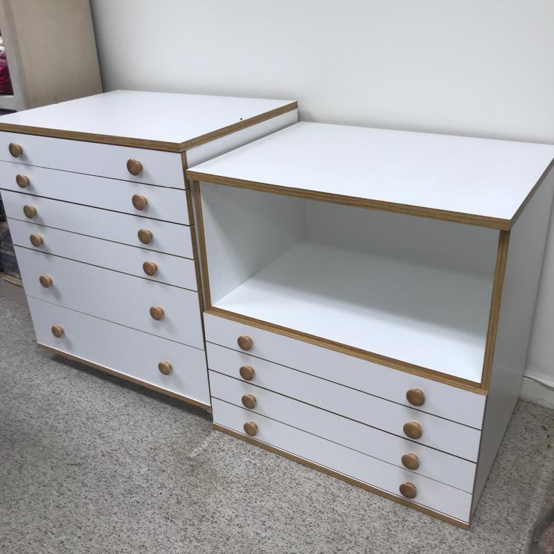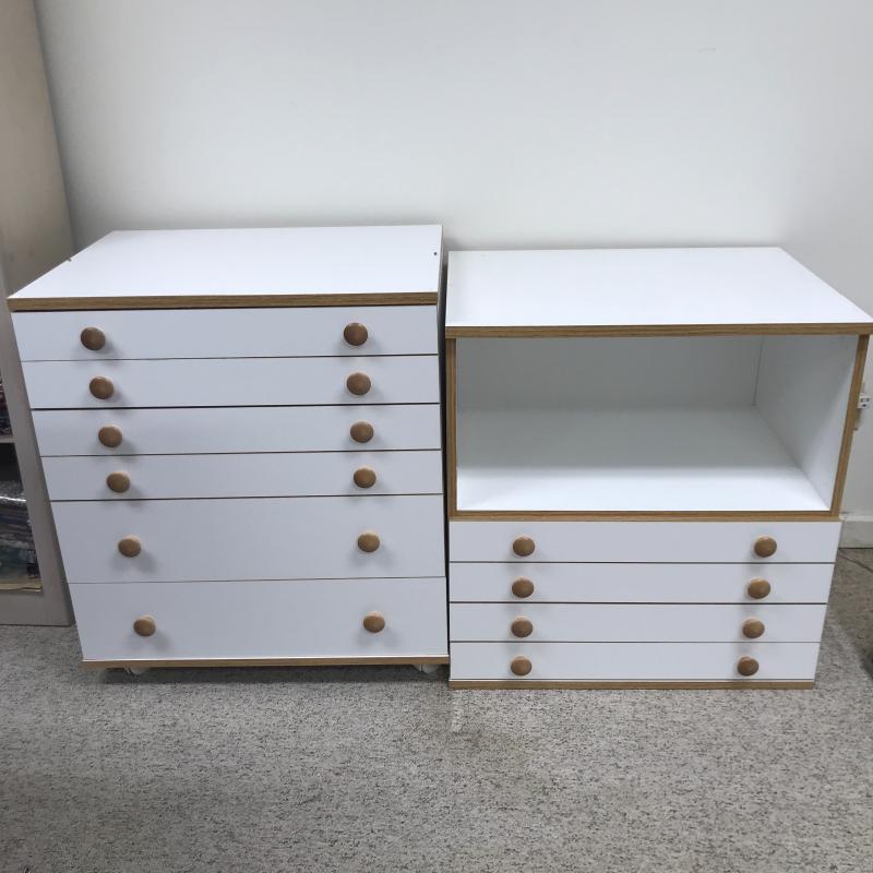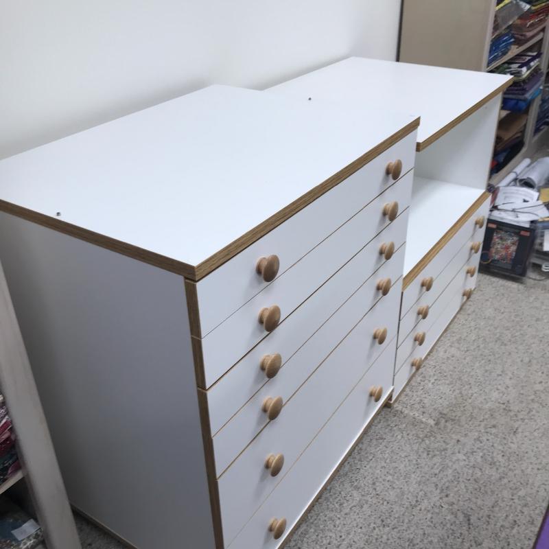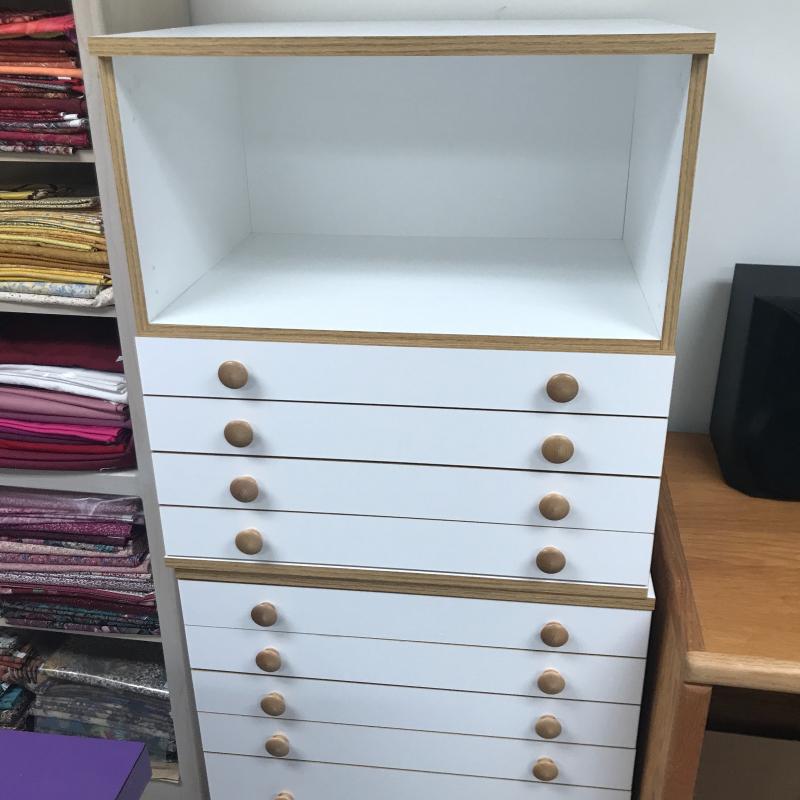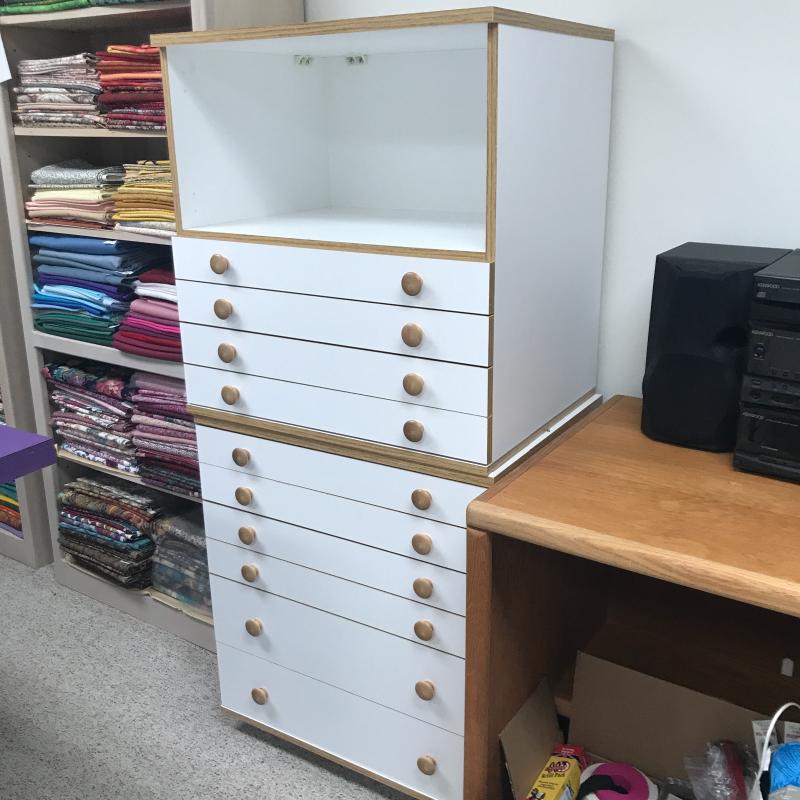 Two Horn cabinets to store all of your sewing and quilting accessories. These two cabinets can stack into one tall cabinet or be used separately. According to the website, they are Made of a Melamine smooth mar-resistant surface. Bottom cabinet has casters to move easily and measures 26” x 19.5” x 27.25” h (29.5”h on wheels) The top of this has pins that hold the top cabinet in place. See pictures. Bottom cabinet measures 26” x 19.5” x 27.25”. All drawers slide easily. There are a couple of removable inserts included. One drawer has a few stains on the inside bottom but otherwise these cabinets are in great condition. No shipping.