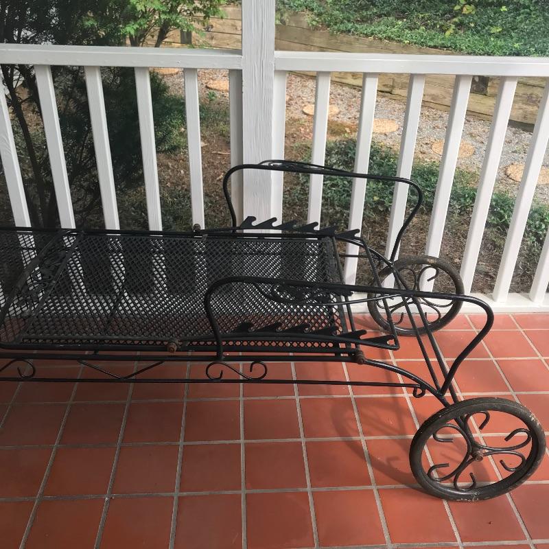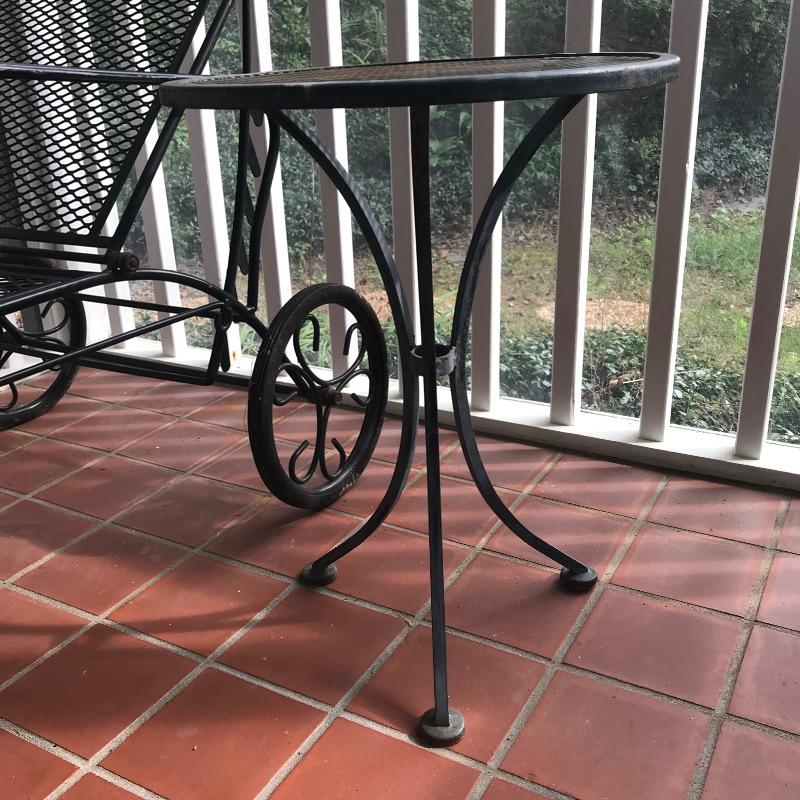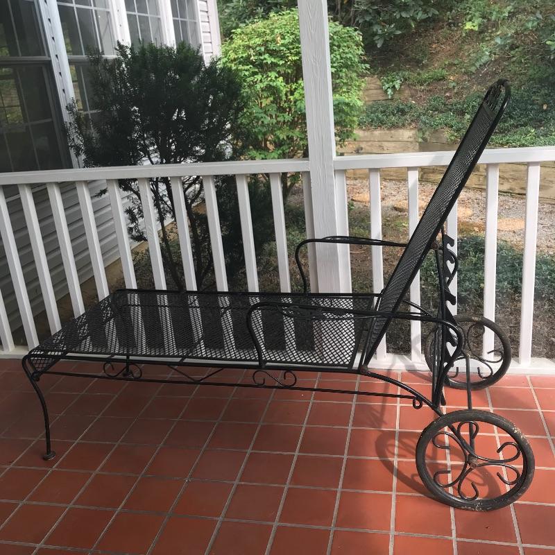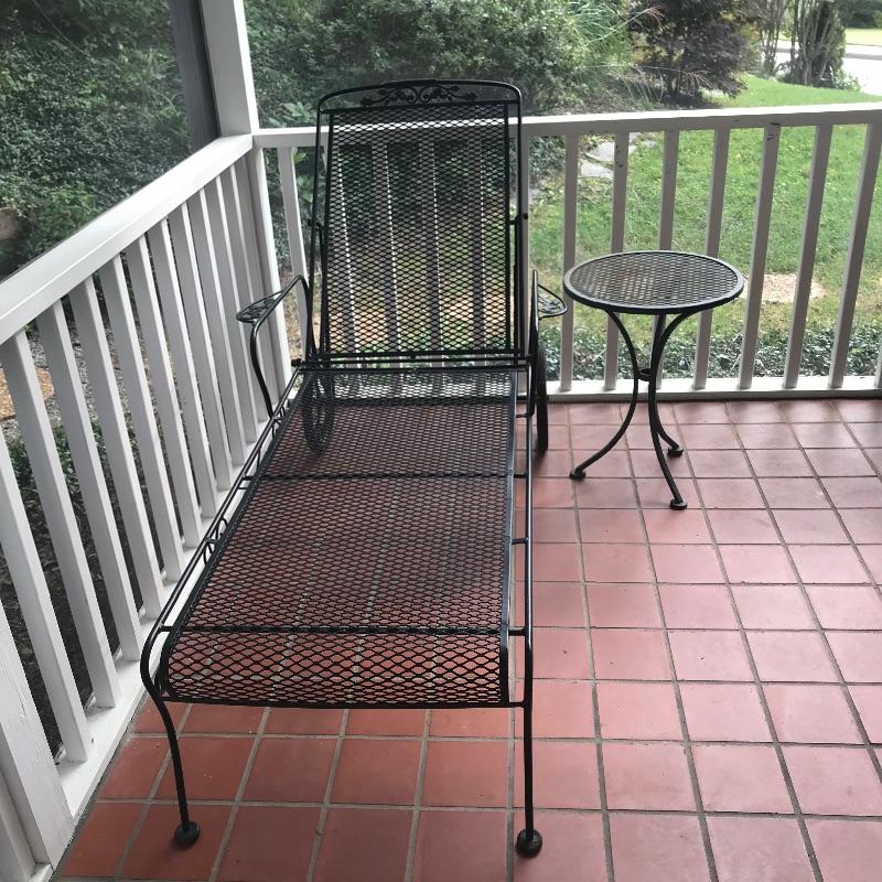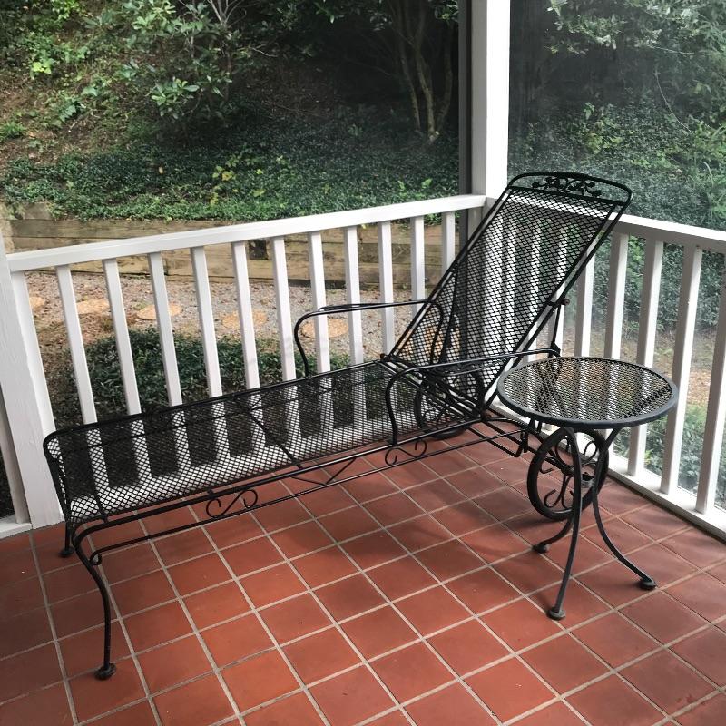 Just imagine lounging outside with the gentle fall breeze! This seat has six lounging angles to choose from! It also folds up so you can easily roll it to the most comfortable spot on your patio. We’ve included a small iron side table to make sure you always have a spot for your drink! Chair measures approximately 30” x 77” x 23” when extended as flat as possible. The lounger shows just a little rusting around its hardware and the table could use a new paint job, but is very sturdy. It measures 17”d x 23”. Local pick up only.