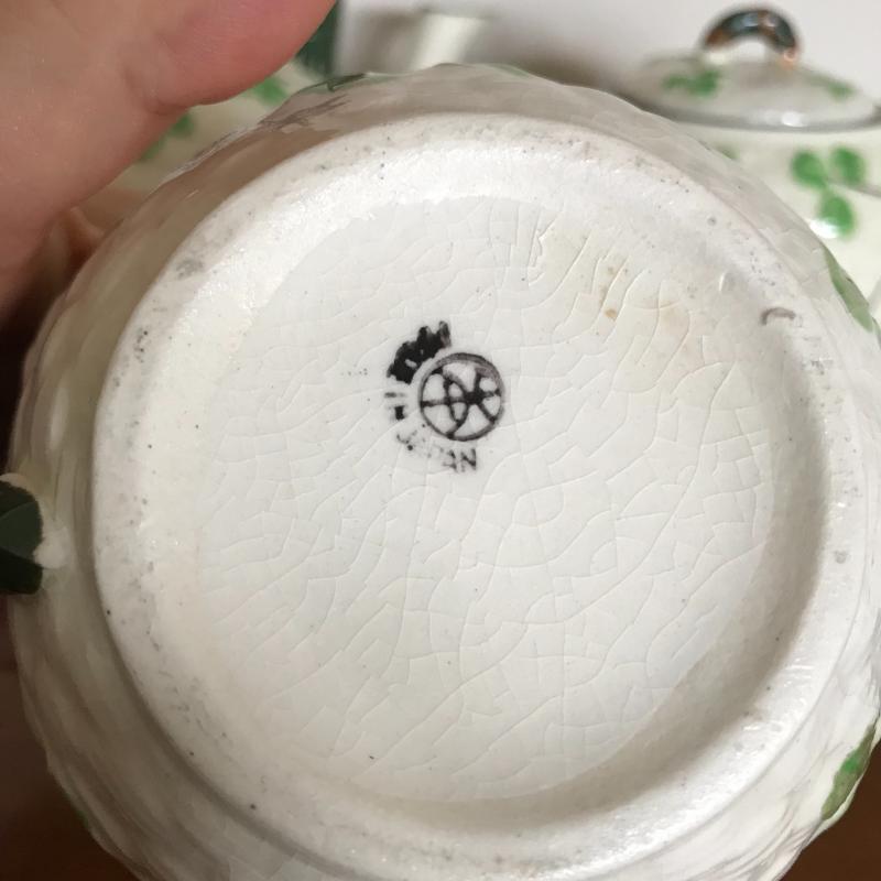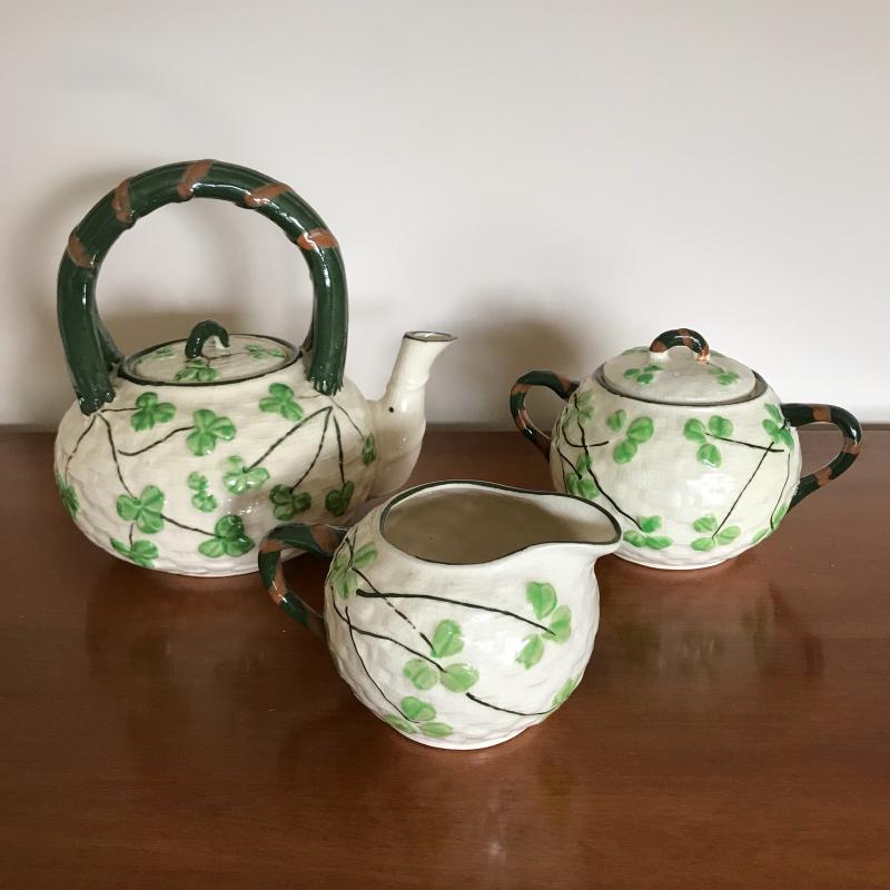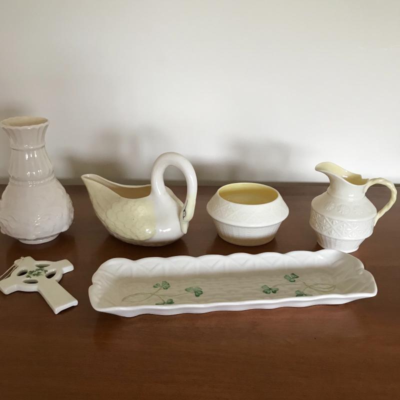 This lucky lot contains several Beleek pieces, Belem pieces and a Beleek-style teapot, creamer and lidded sugar bowl covered in three-leaf clovers. Teapot is approx. 6.5” tall. No visible chips or cracks. Shipping available.