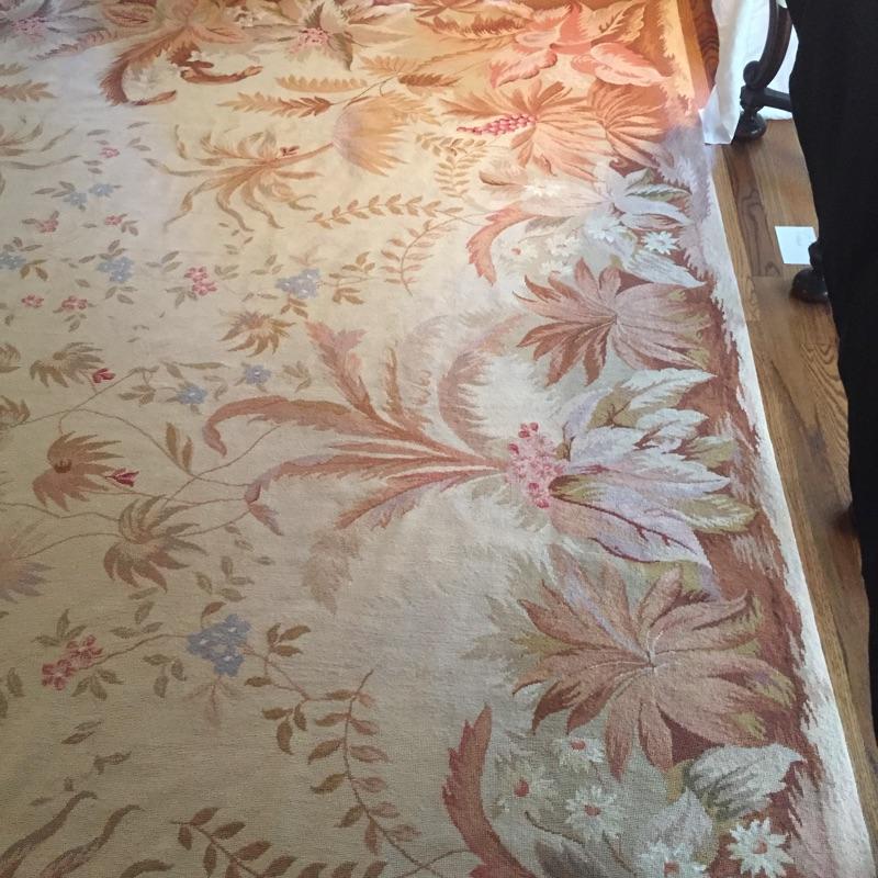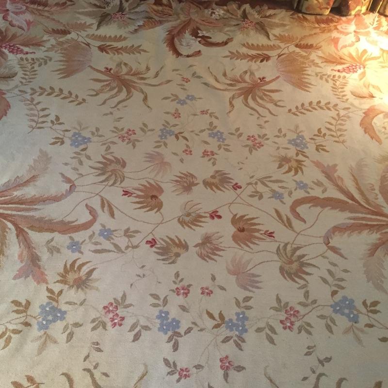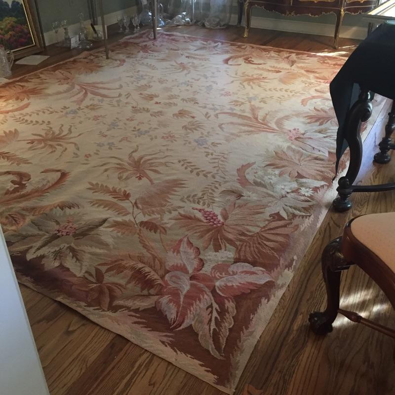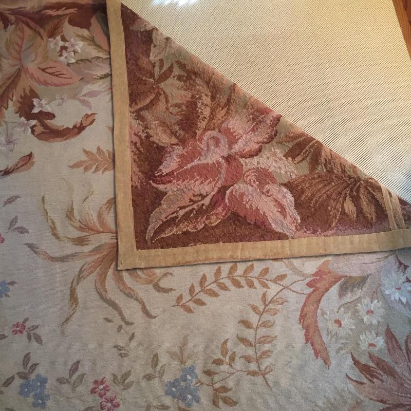 Beautiful area rug in pink and cream hues. Includes rug pad.