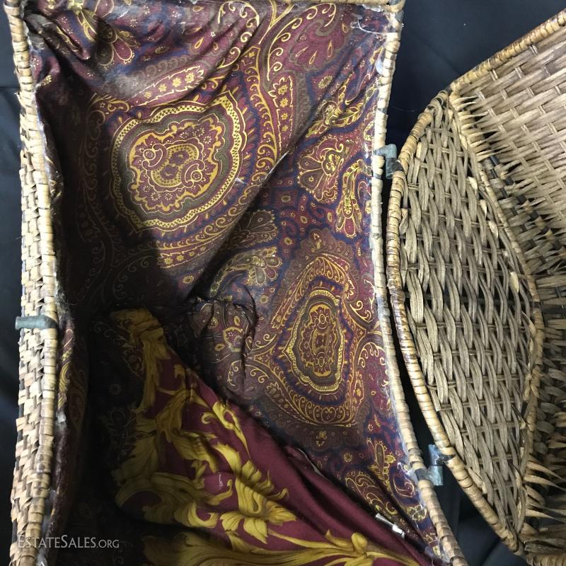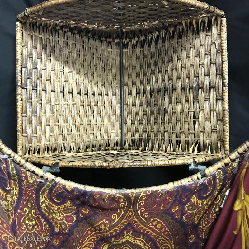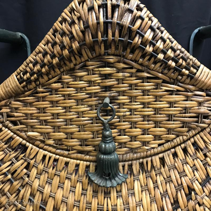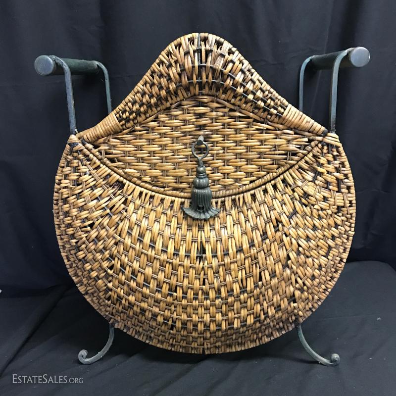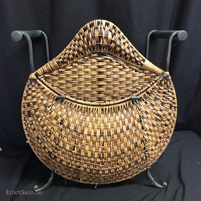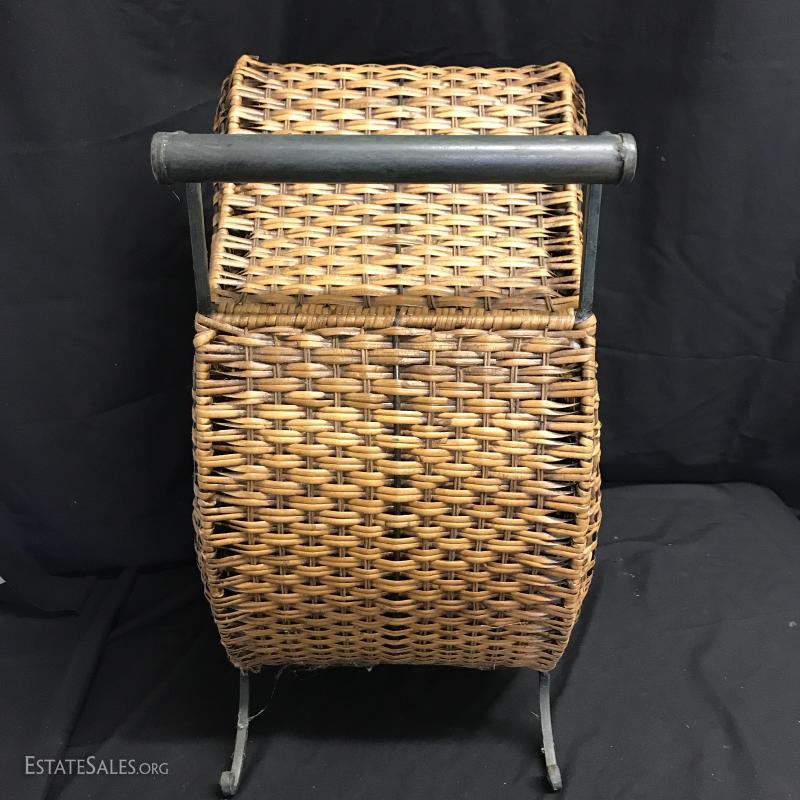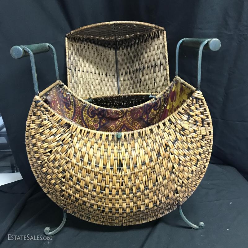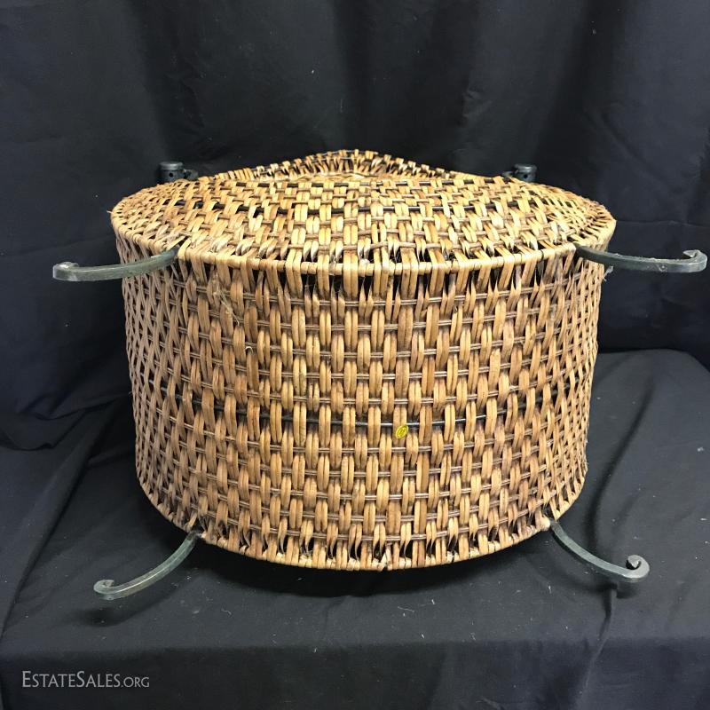Large, unique basket with iron handles and legs. Great for storage with large interior. Fabric inside. 26"tall by 22.5"w by 12.5" deep. No shipping. Local pick up only in Waynesville, NC.