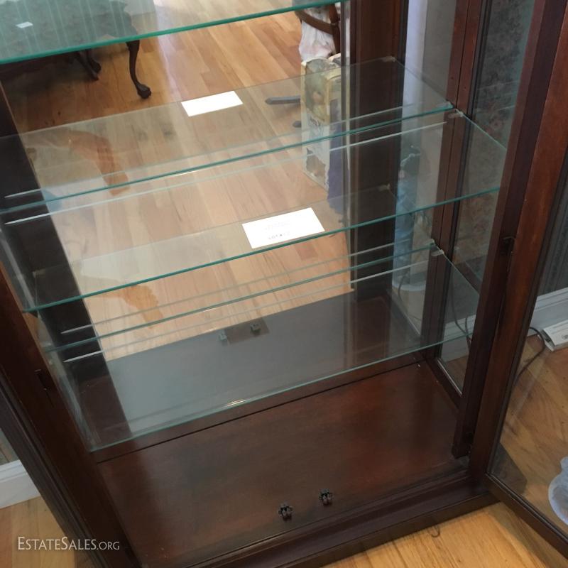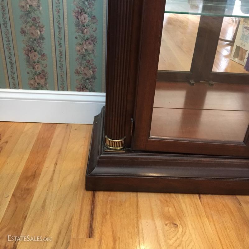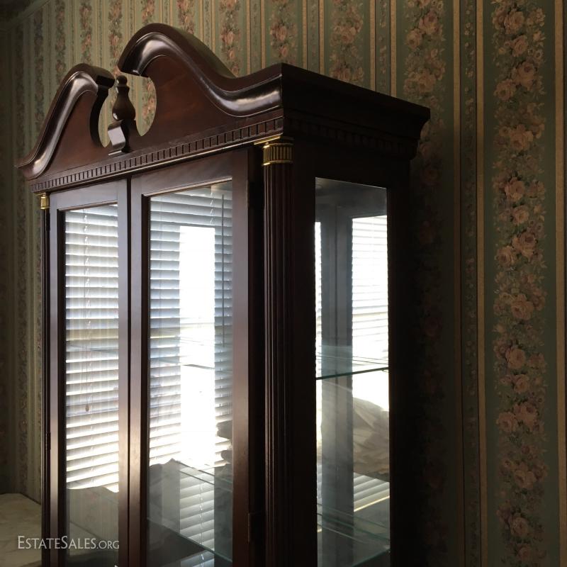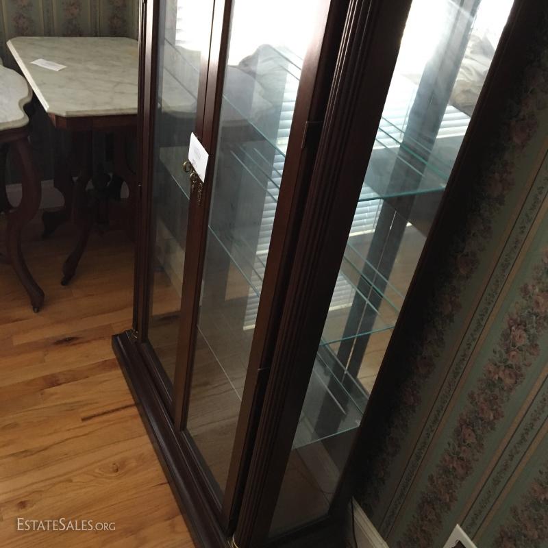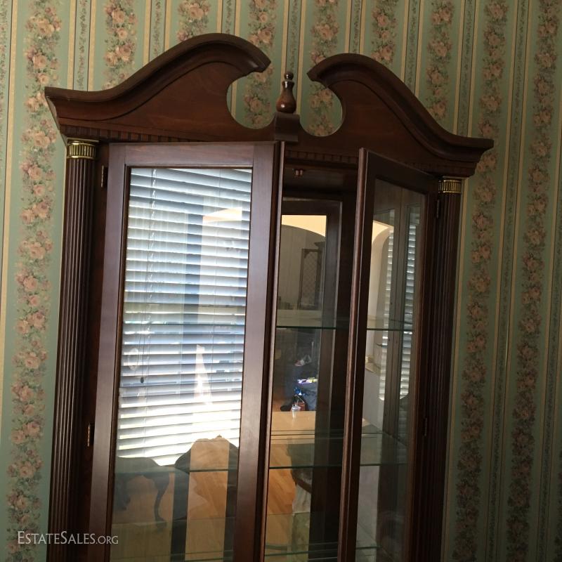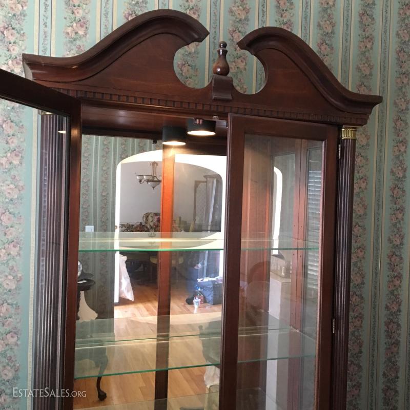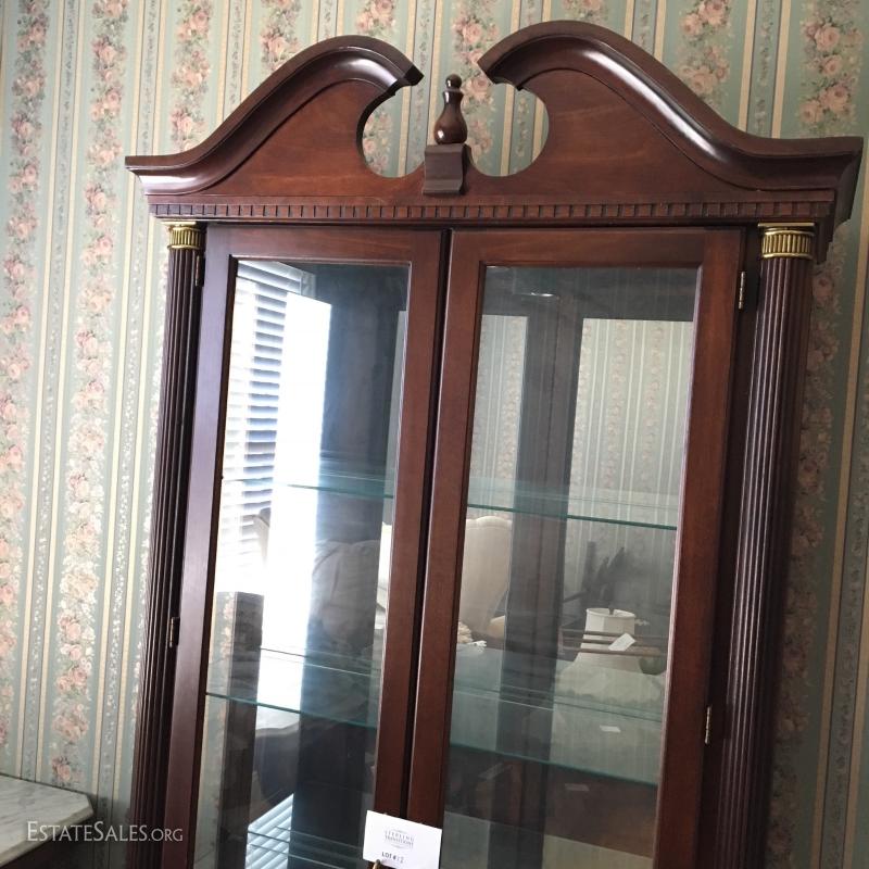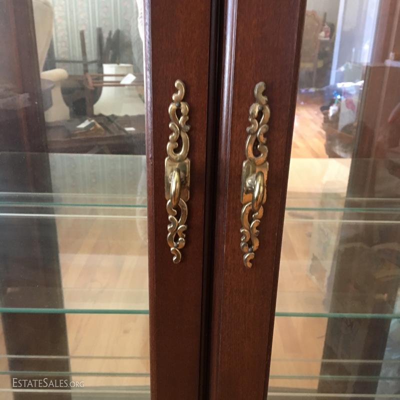 Lighted Hutch for showcasing items. Mirror back. Four glass adjustable shelves. Brass hardware and detail. Lighted. 37" Wide x 13 1/2" D x 78" H. (Tables seen in some photos are not included) No Shipping - Local Pick up in Columbus, North Carolina